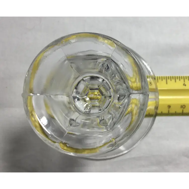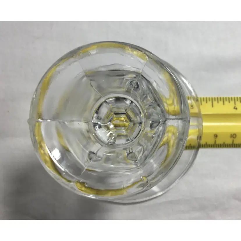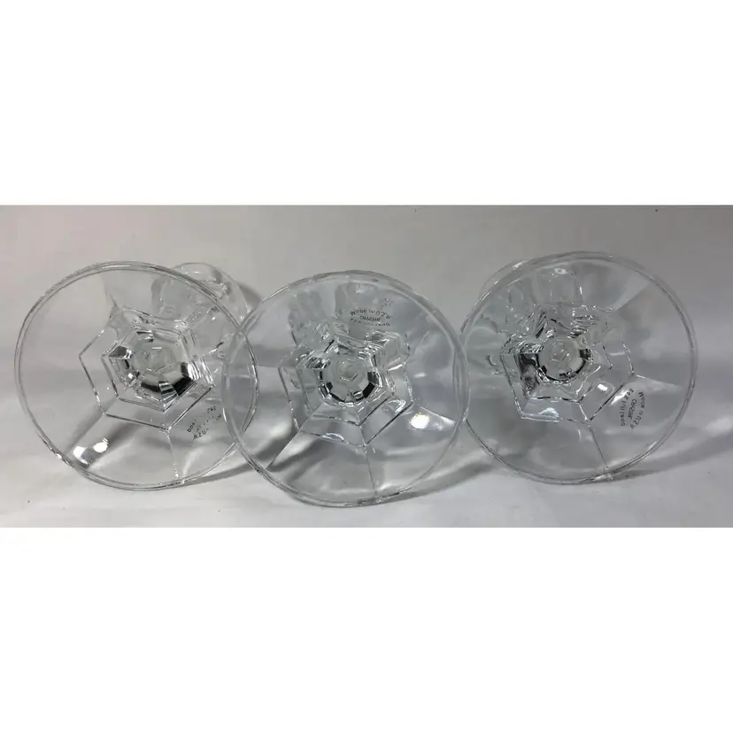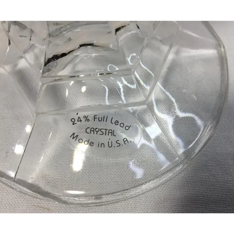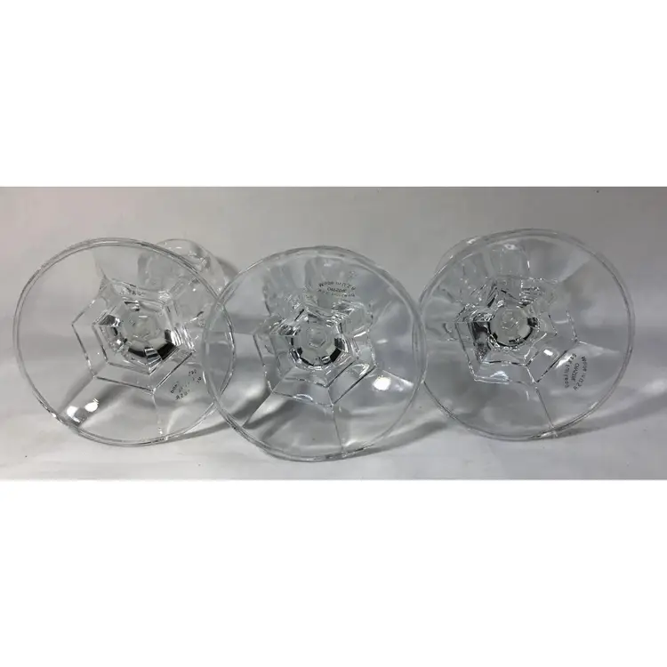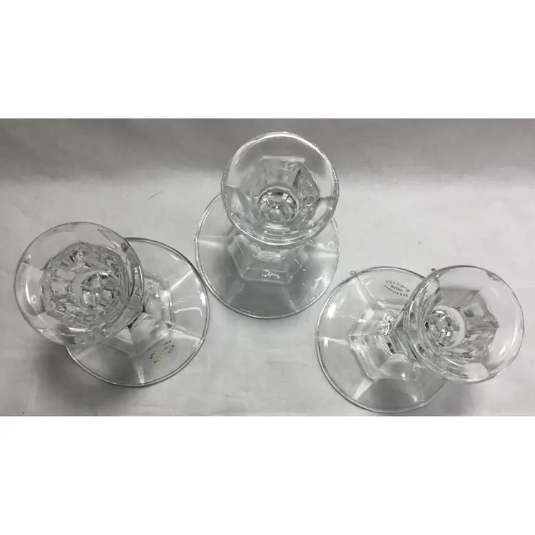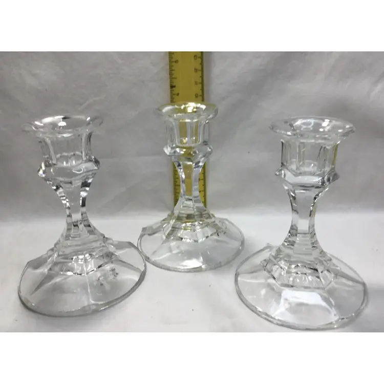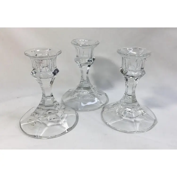 Set of 3 small candle sticks, clear, leaded, molded crystal. Six-sided with round base 3.25 inches wide. Approx. 4" tall. Holds average taper candle. Opening is approx. 3/4 inch wide.