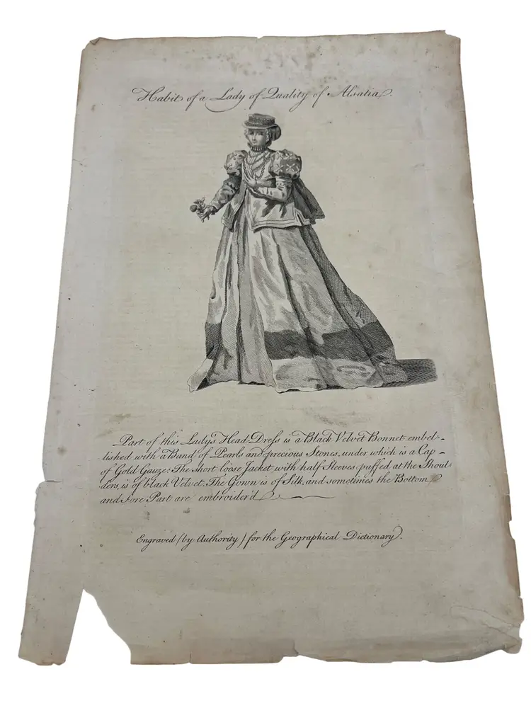 Three antique engravings from the 18th century, all originally published in The New Geographical Dictionary. Each engraving features finely detailed depictions of African attire and customs, titled: