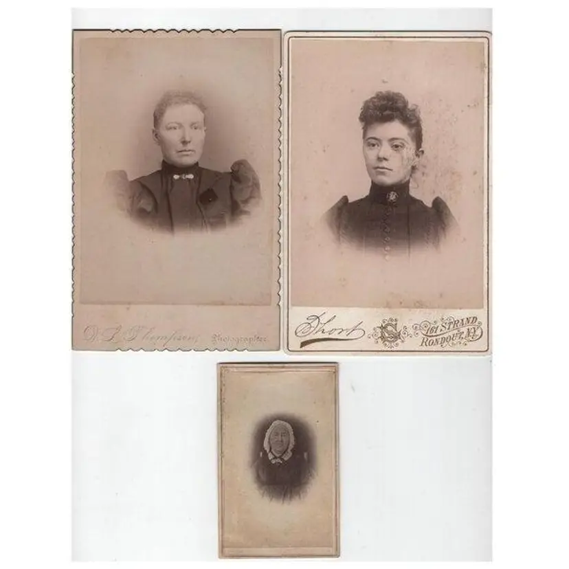 The small one of the elderly woman has no studio name and not on same cardstock as the others Measures 2 1/2 x 4 One is by DL Thompson, no location shown 4 x 6 1/2 Other can't make out name, Rondout NY 4 x 6 1/2