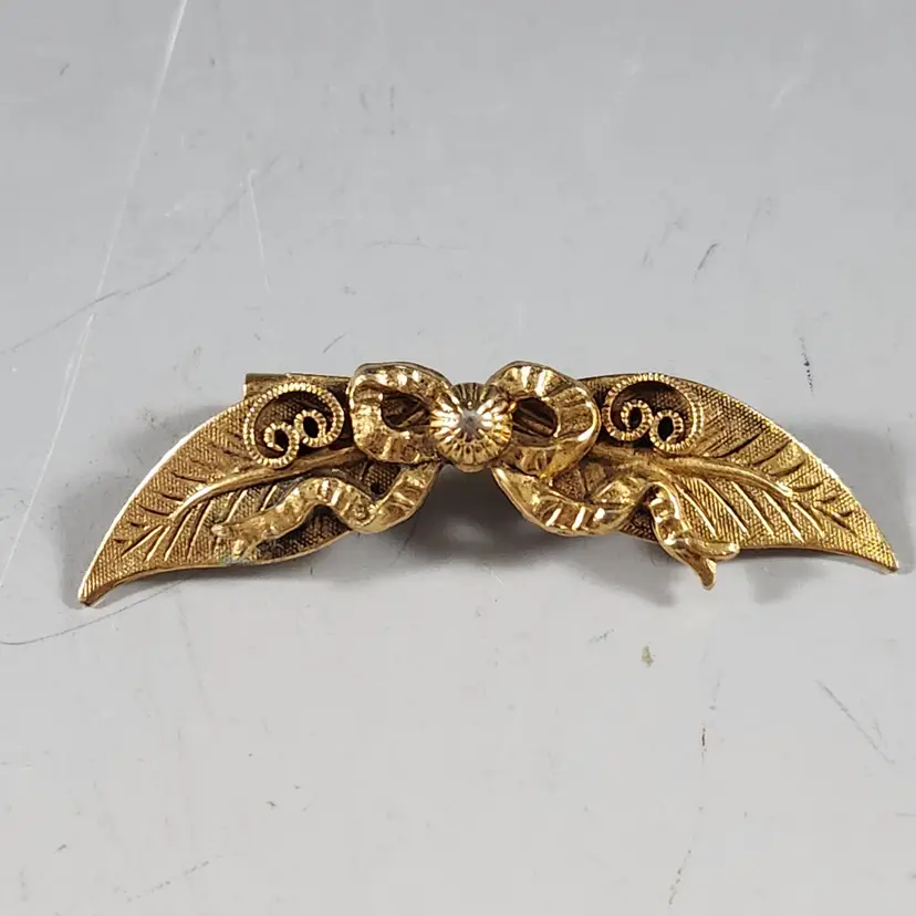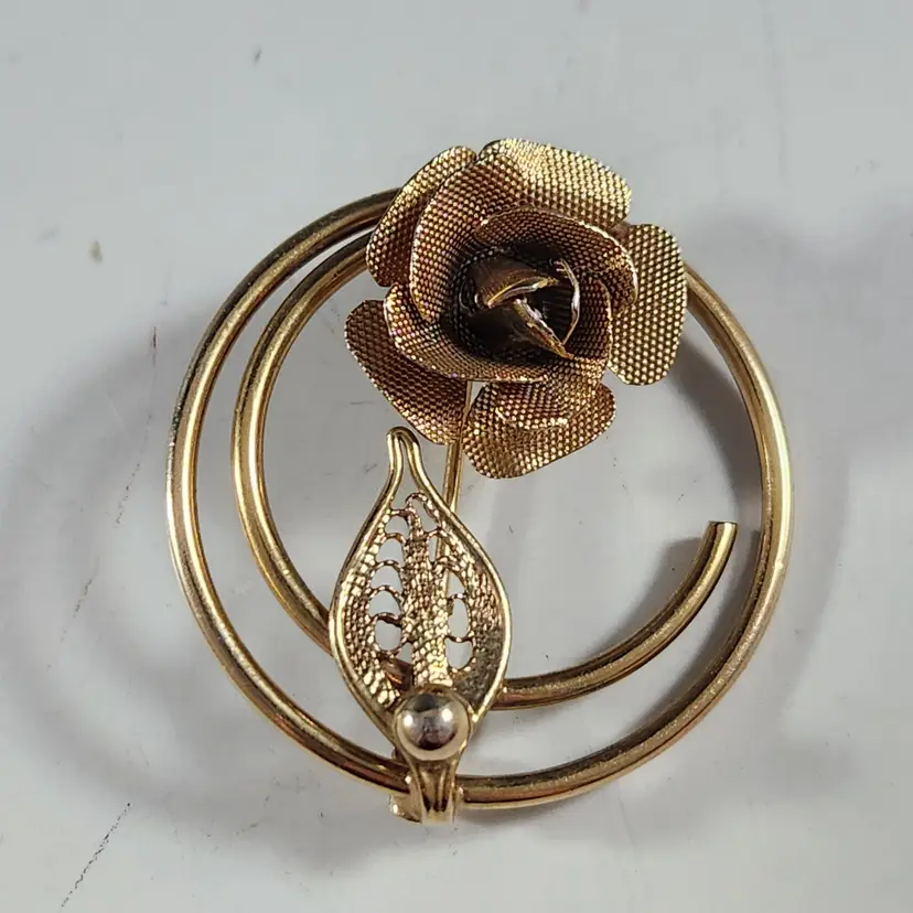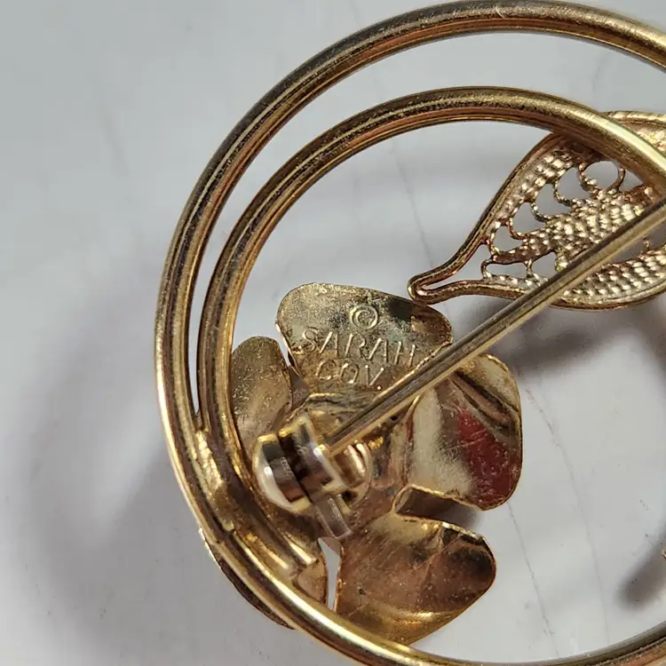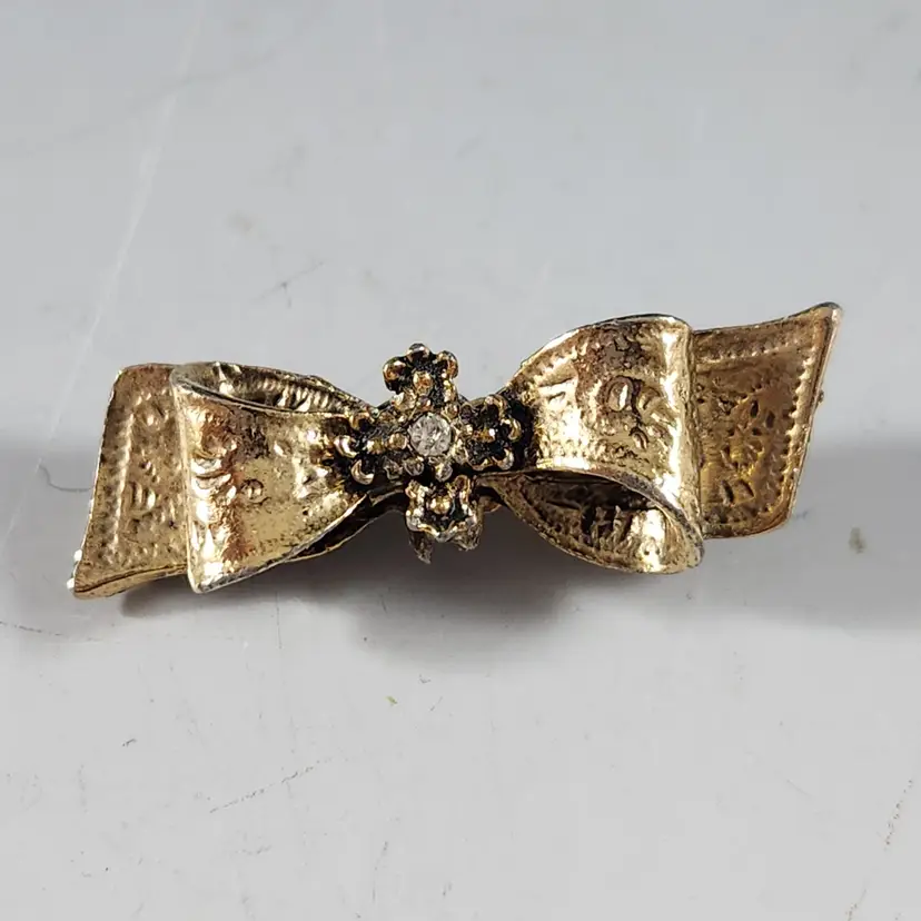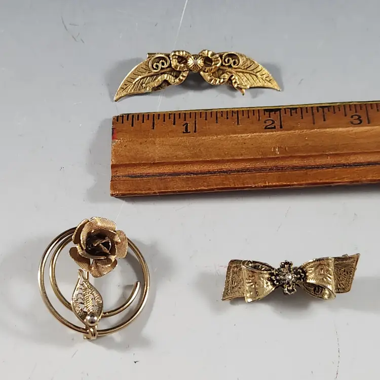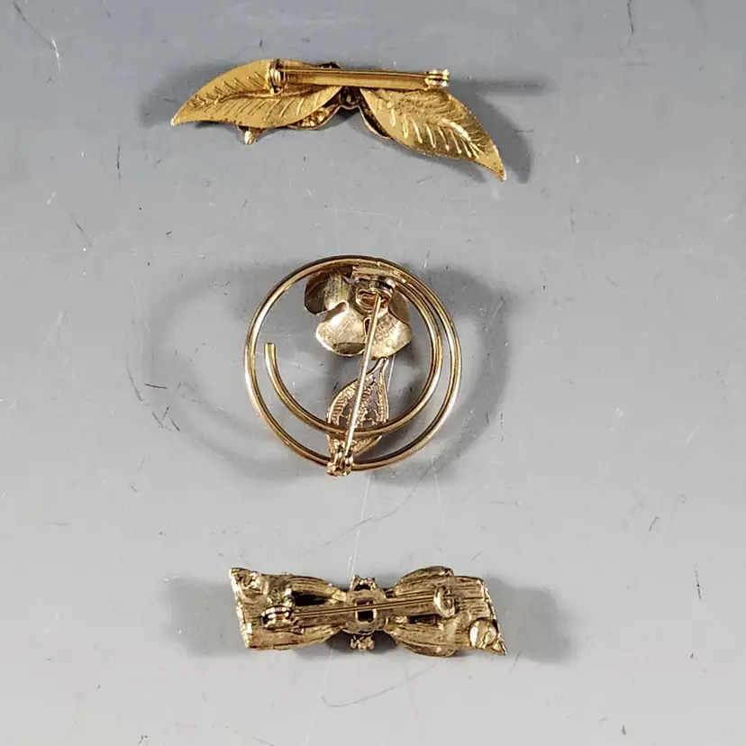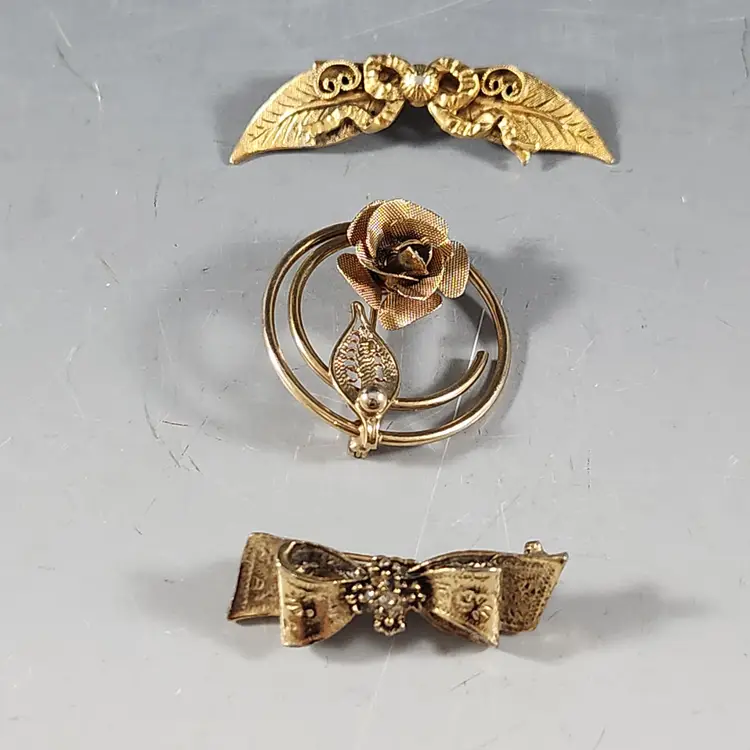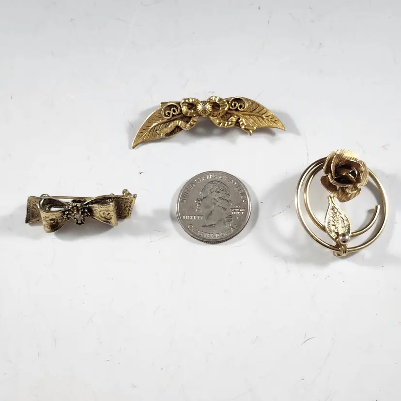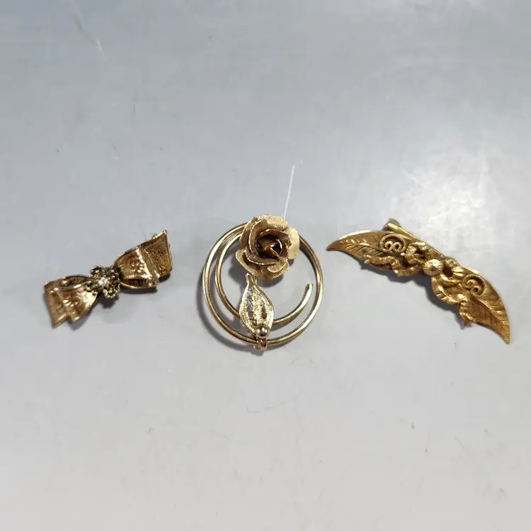 Set of 3 bronzy gold pins/brooches includes a single rose spiral circle pin/brooch by Sarah Coventry. Cluster all of them for the maximalist look. The flower is metal mesh and the petals are flexible so you can flatten them to look more like a flower if you prefer that. The other two are ribbon brooches, one has a rhinestone center that are unmarked but seem to be nice quality.