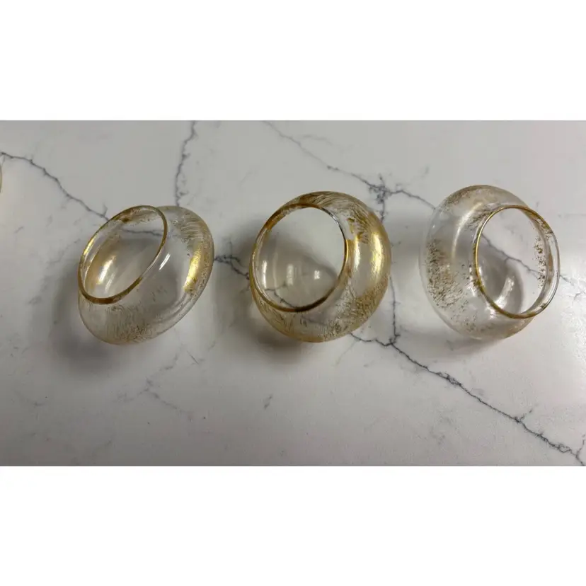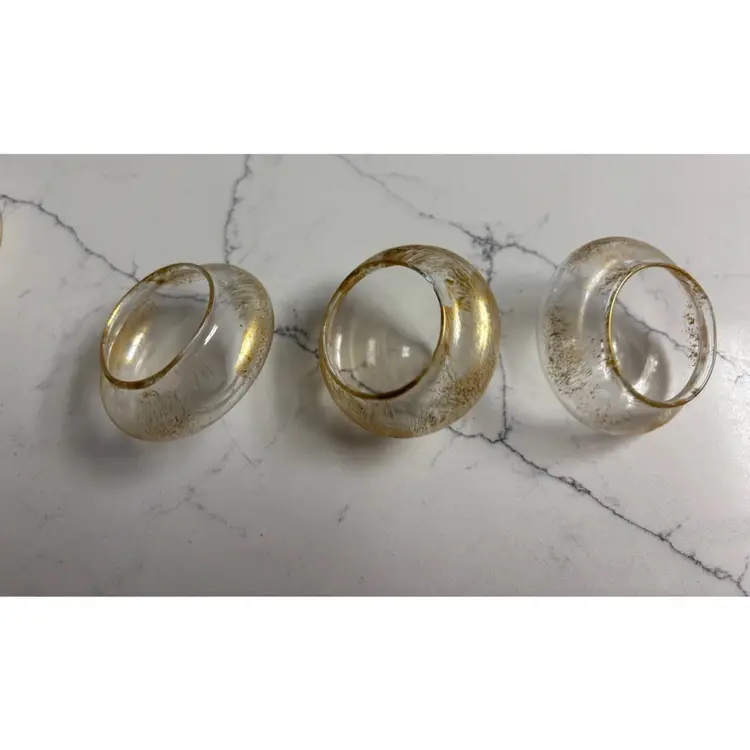 Three clear glass tea light holders are adorned with scattered gold flecks. Their unique design adds a touch of elegance to any table setting. Look like they have a floating effect. Glass material.