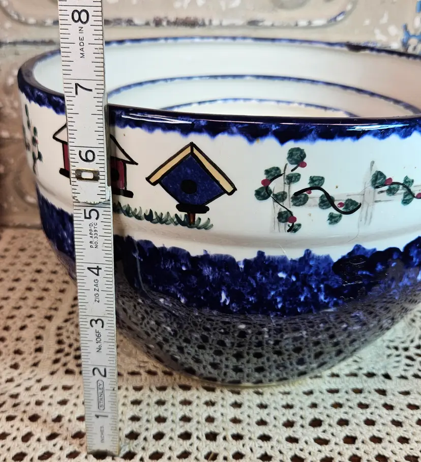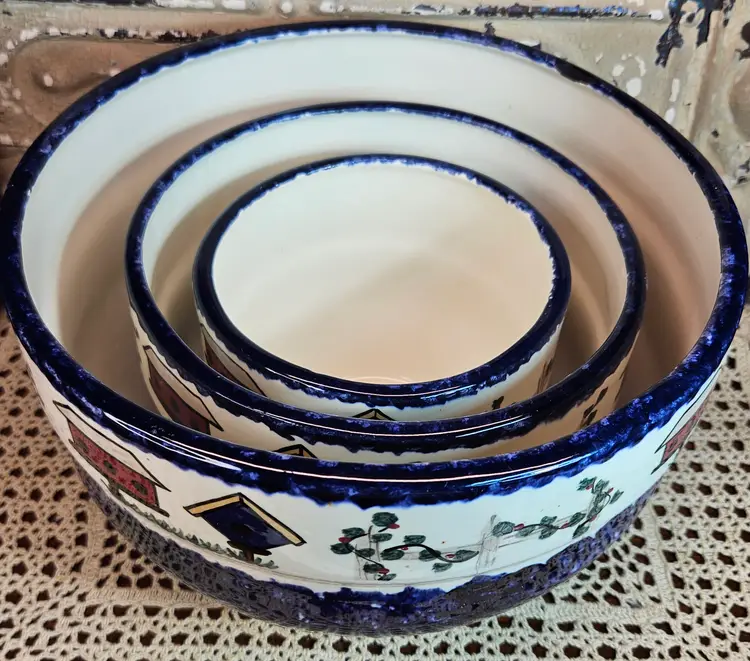 This charming set of 3 mixing bowls is in excellent, used condition, with no appreciable chips, scratches or cracks. Measurements are depicted in the pictures of the item or listed in the description of the item. Please review the photos, as they are part of the item description. Please note that any props used in the photos are not included in the purchase, unless otherwise indicated.
