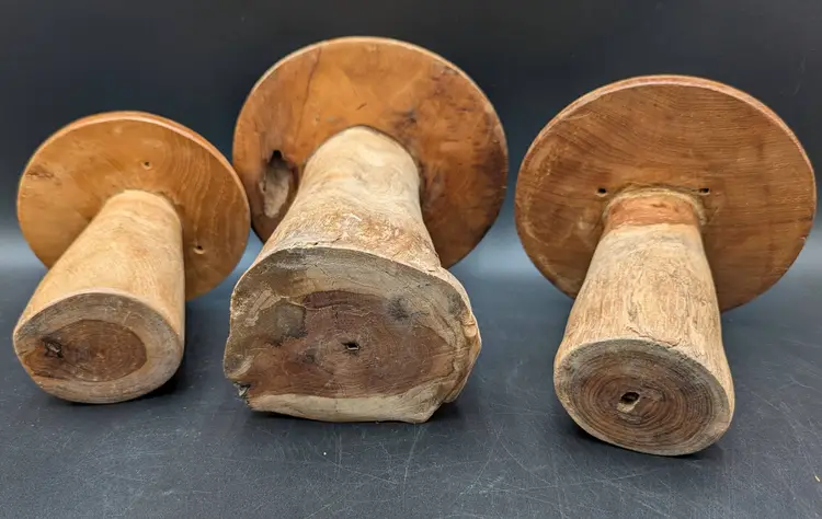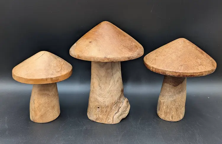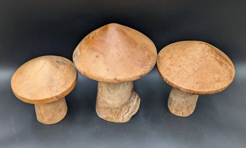 Set of three rustic hand turned wooden mushrooms in excellent gently pre-owned condition. Dimensions Large 8.5 " tall x 6.5" wide Med 7.5" tall x 6" wide Sm 6.5' talk x 5" wide