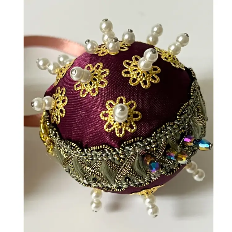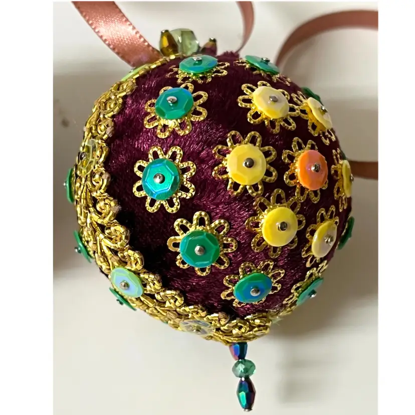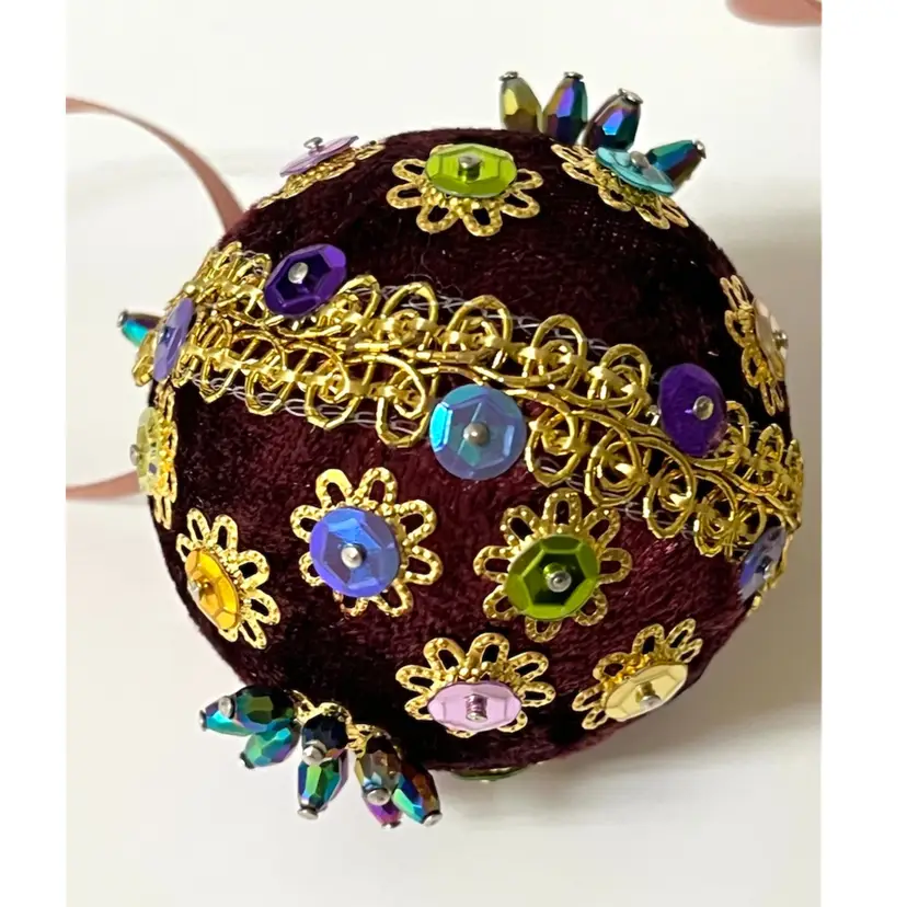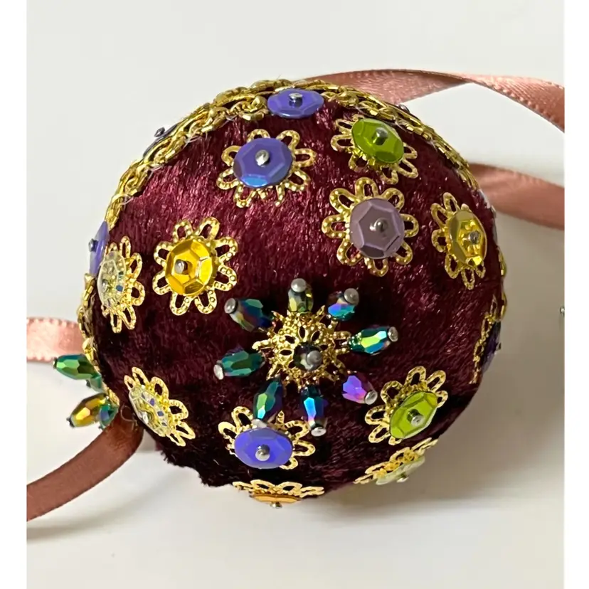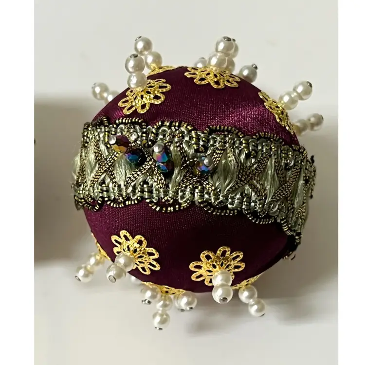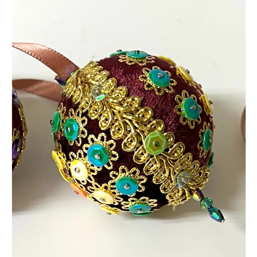 Set of 3 Handmade Vintage Style Push Pin Christmas Ball Ornaments Sequins Beads Ribbon. 2 in height.