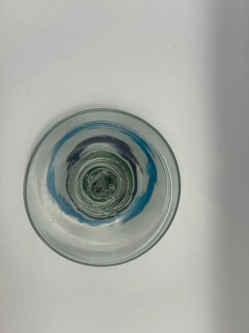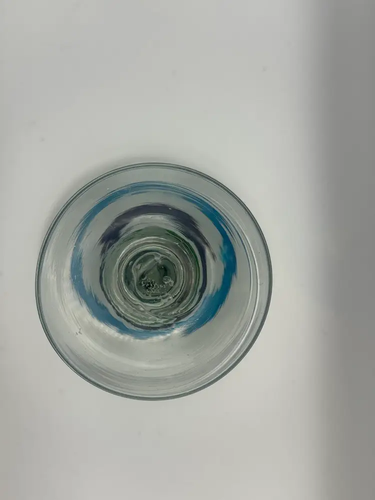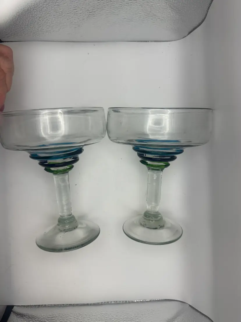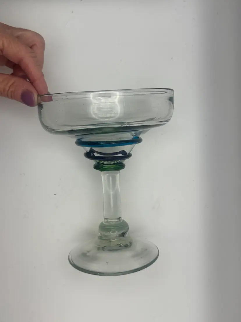 Set Of 3 Large Blown Glass Blue And Teal Swirl Margarita Glasses 7”H; 5” Diameter