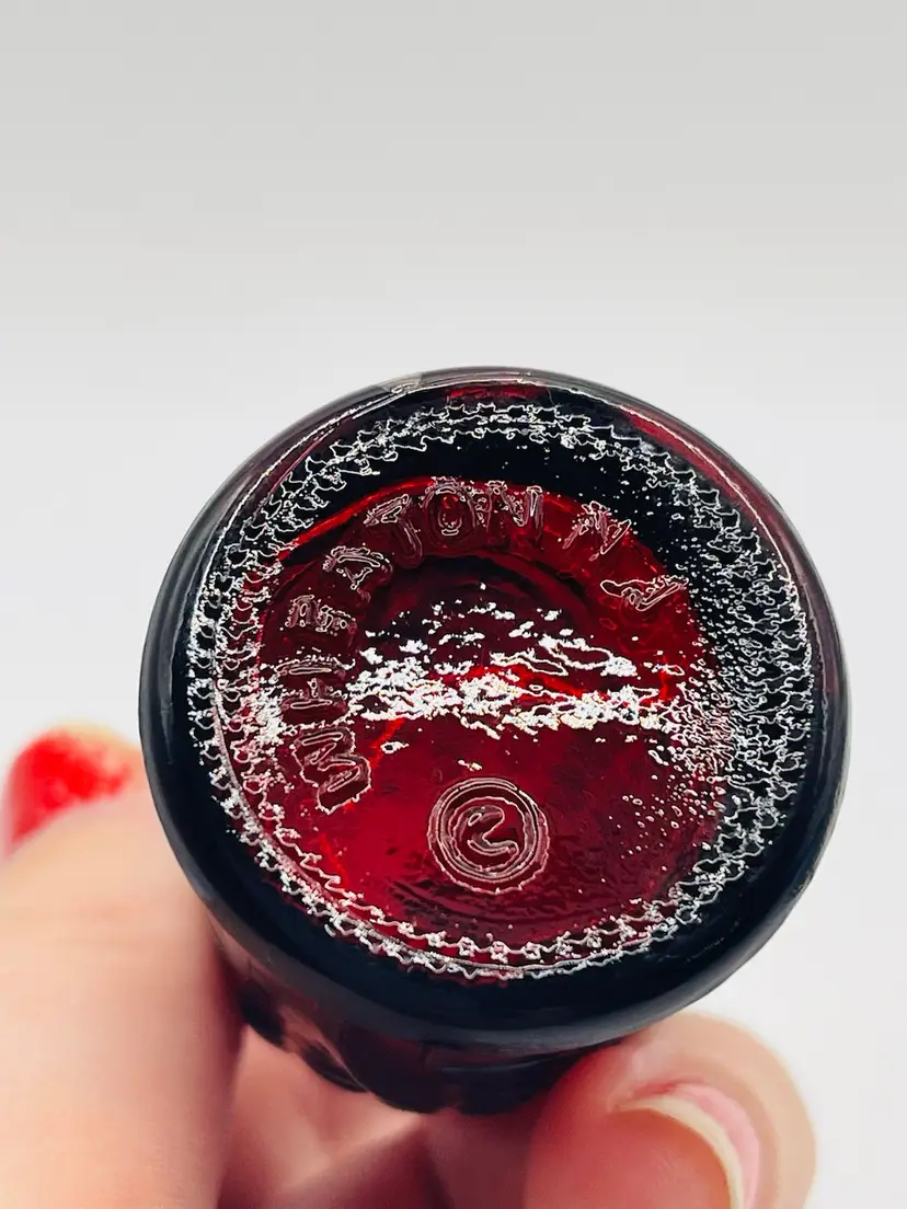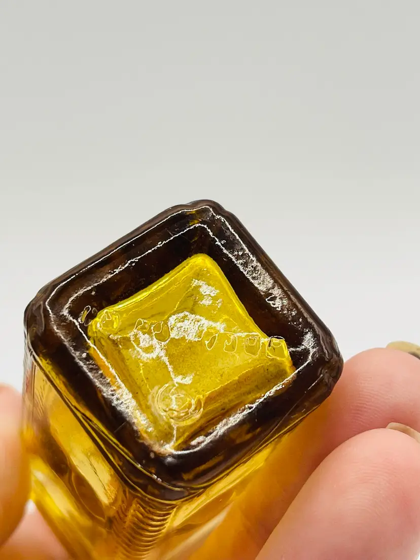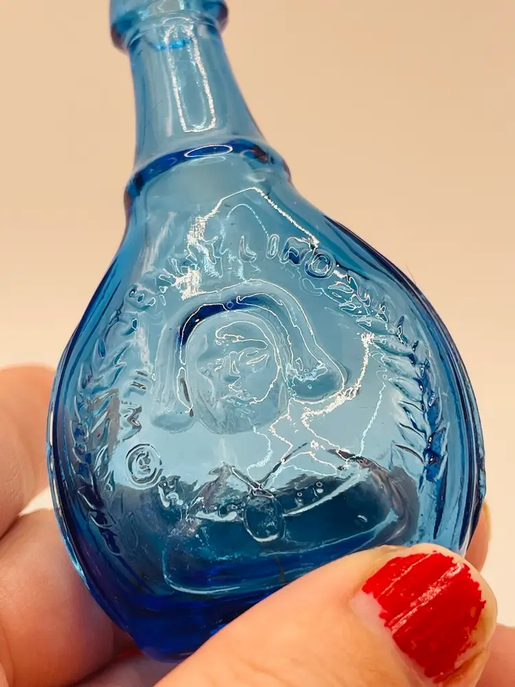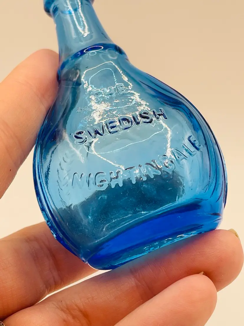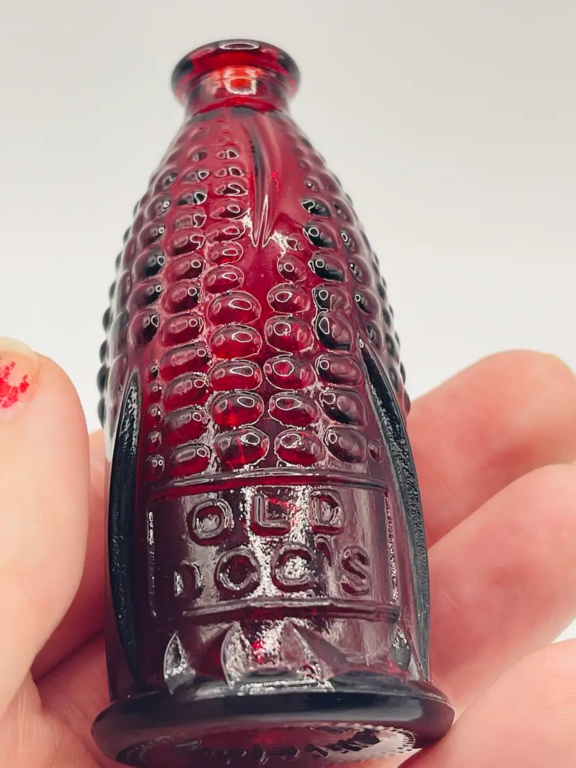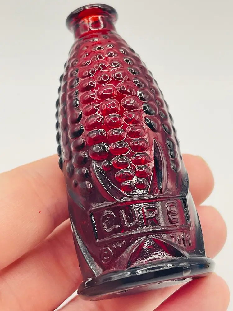This set has “Old Doc’s Cure”, which is a red glass bottle shaped like an ear of corn. A yellow glass Phillaberries Apple Bitters bottle (the cork has fallen inside this bottle), and a blue Jenny Lind, the Swedish Nightingale bottle.