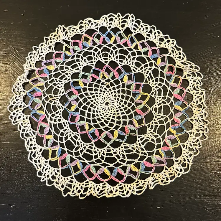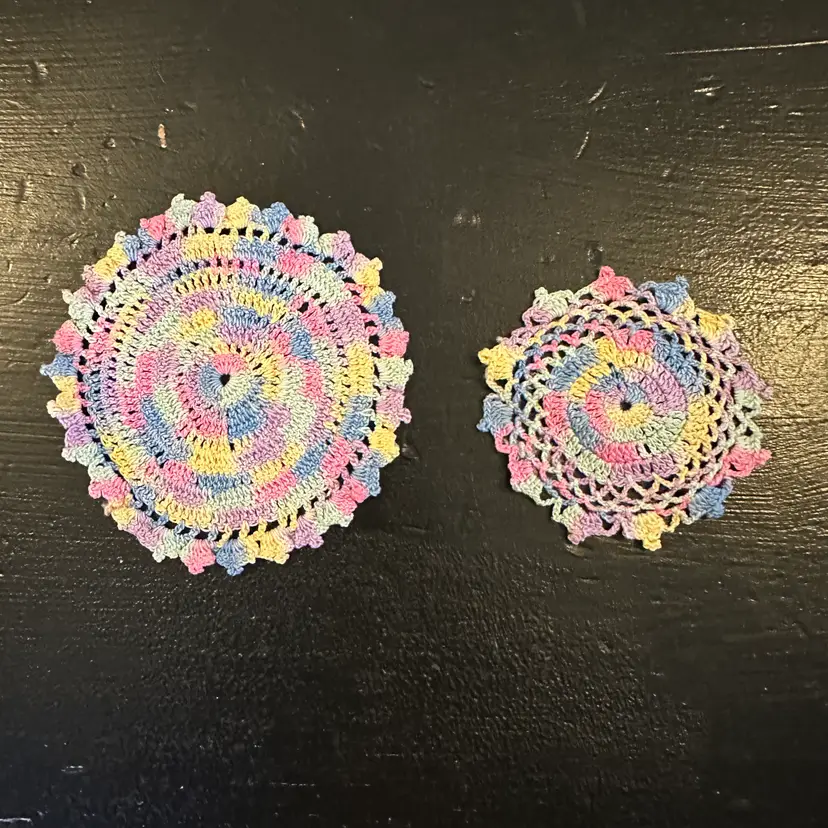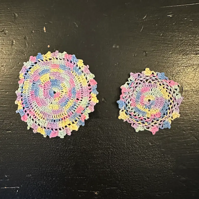 Set of 3 Pastel Rainbow Crocheted Doilies #43 in good preowned condition. The doilies measure 11, 3.5 and 2.5 inches. Please see photos for all the details.