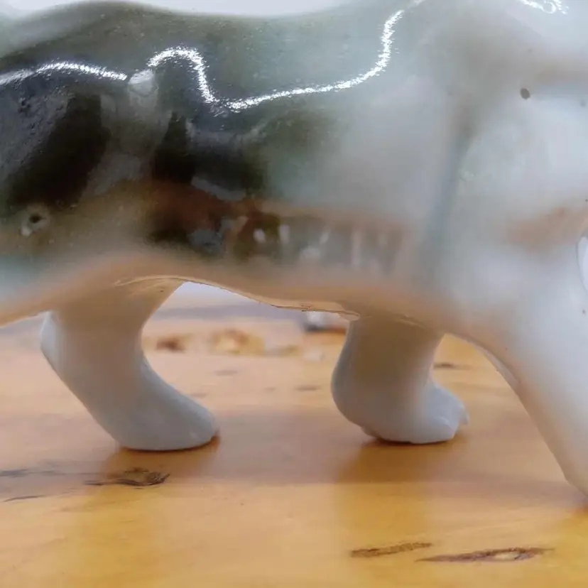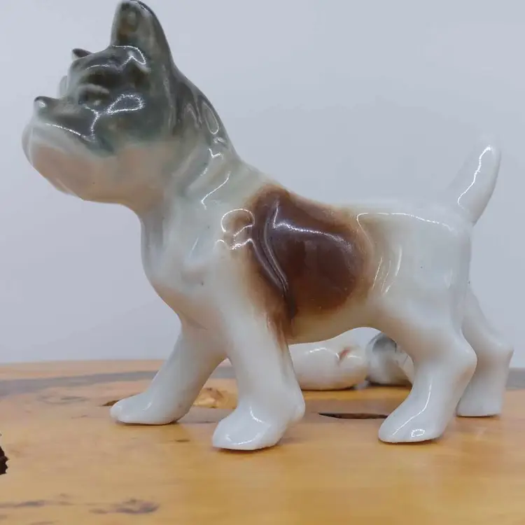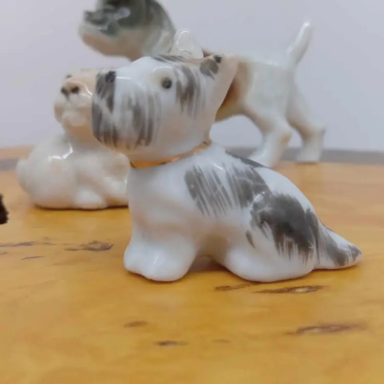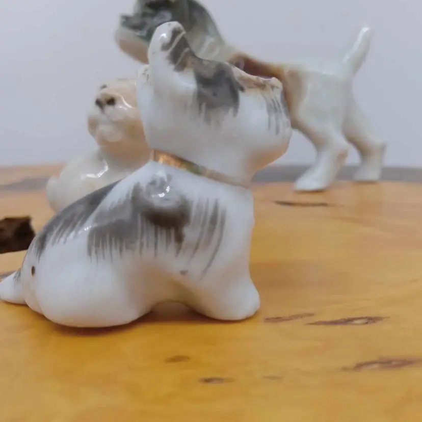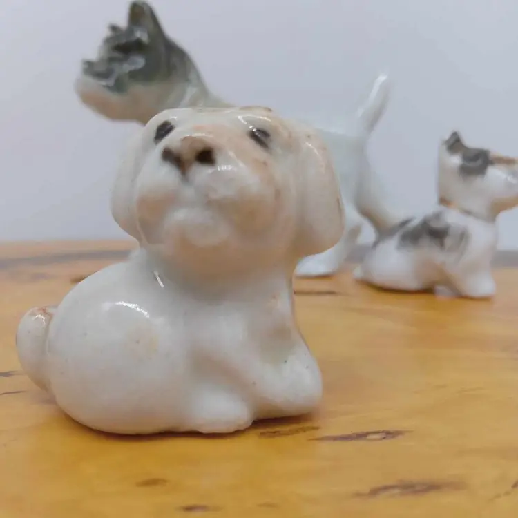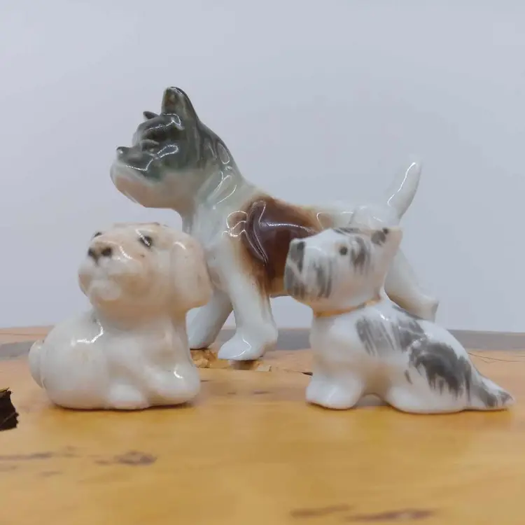 Here's a cute trio of porcelain dogs. 2 are labelled Japan and the other has no mark. They are in excellent condition. Measurements are, made in Japan 2 3/4 x3.5, made in Japan 1 3/4 nose to tail, and 1 1/4 inches tall.
