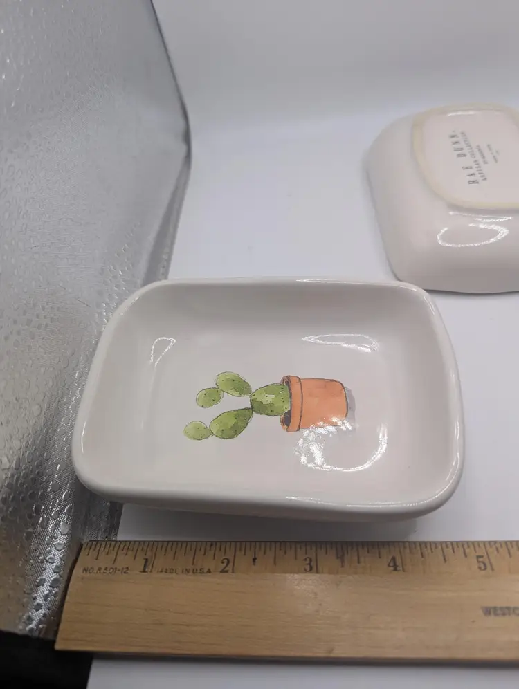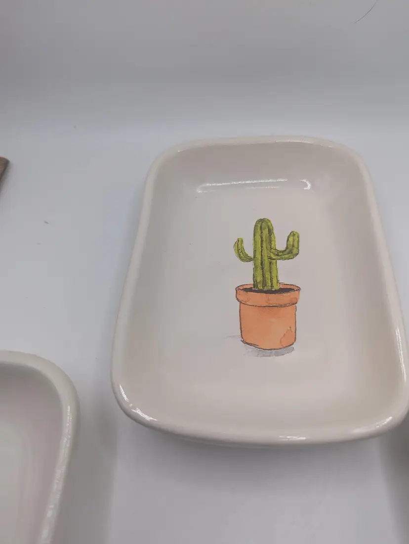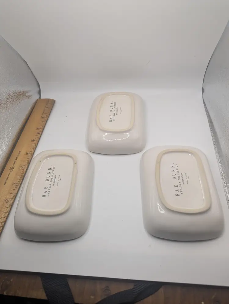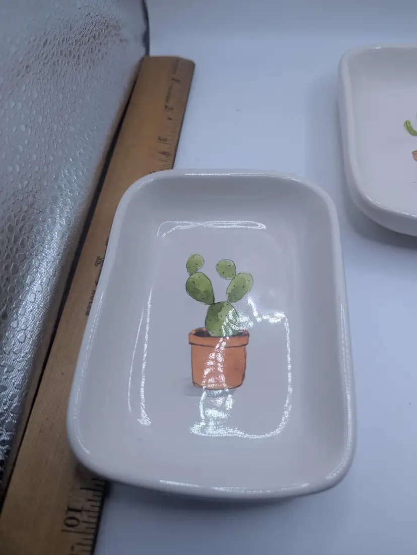 This is a lovely Set Of 3 RAE DUNN by Magenta Cactus Serving Mini Tray Set. They each measure 3.5 inches by 4.5 inches. No chips or cracks. Please see all pictures for condition.