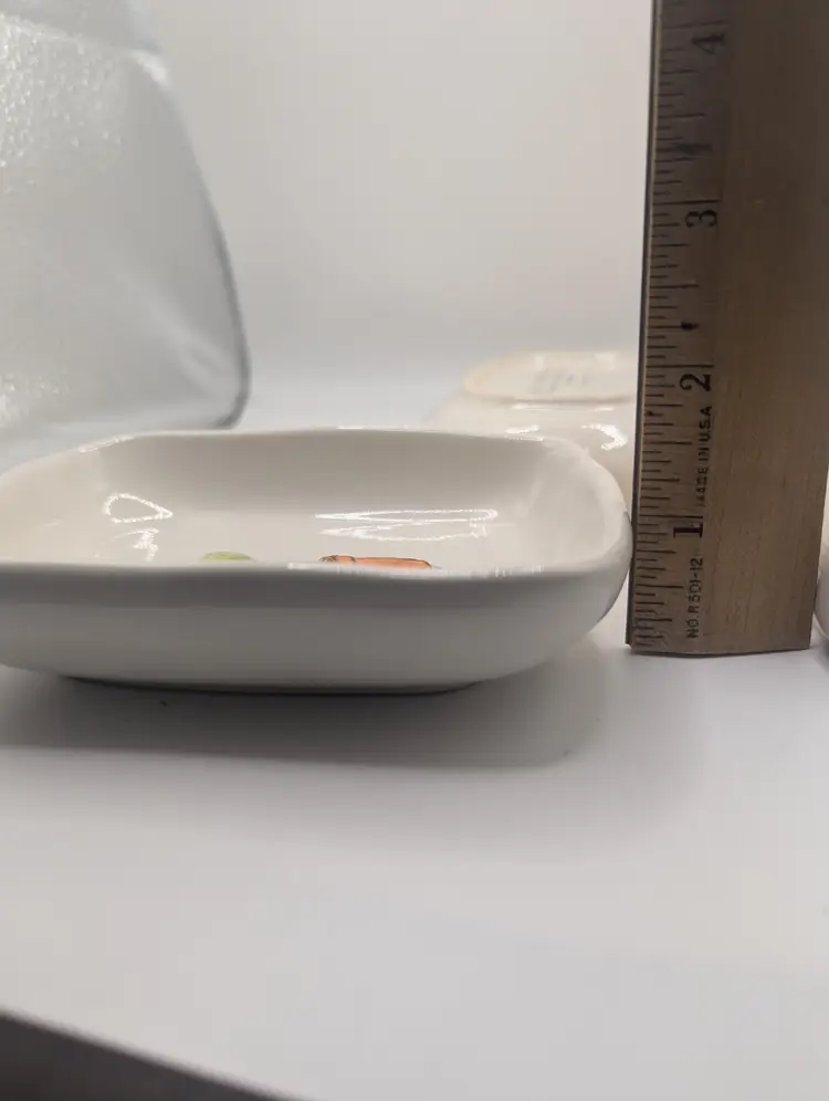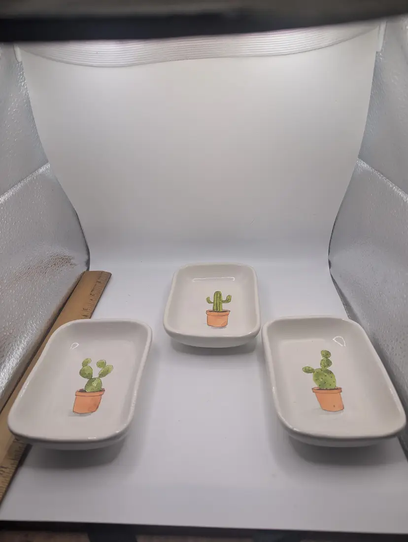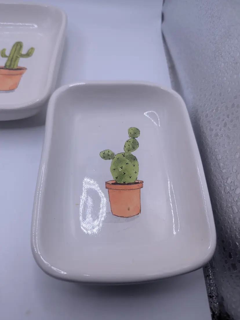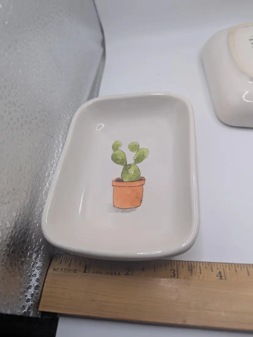 This is a lovely Set Of 3 RAE DUNN by Magenta Cactus Serving Mini Tray Set. They each measure 3.5 inches by 4.5 inches. No chips or cracks. Please see all pictures for condition.