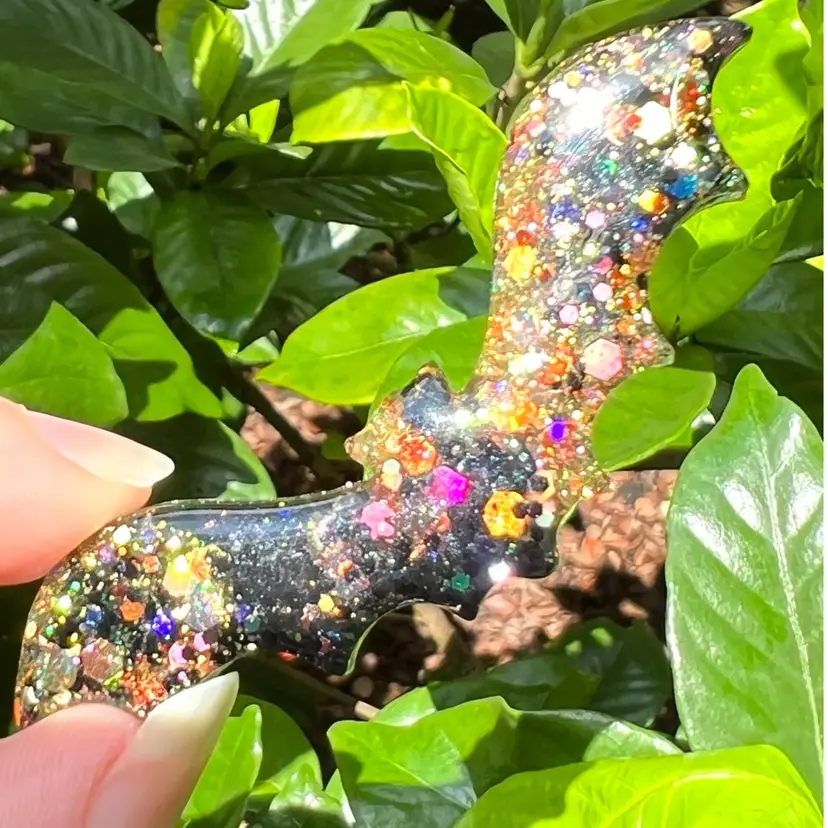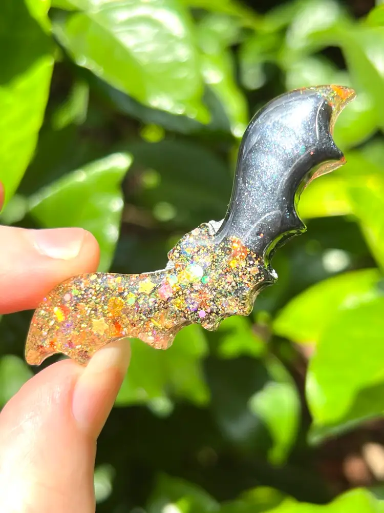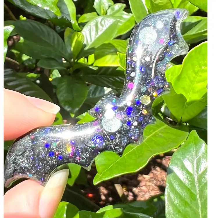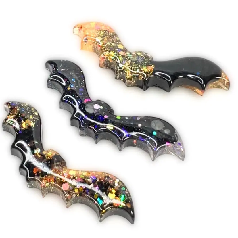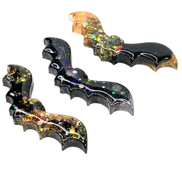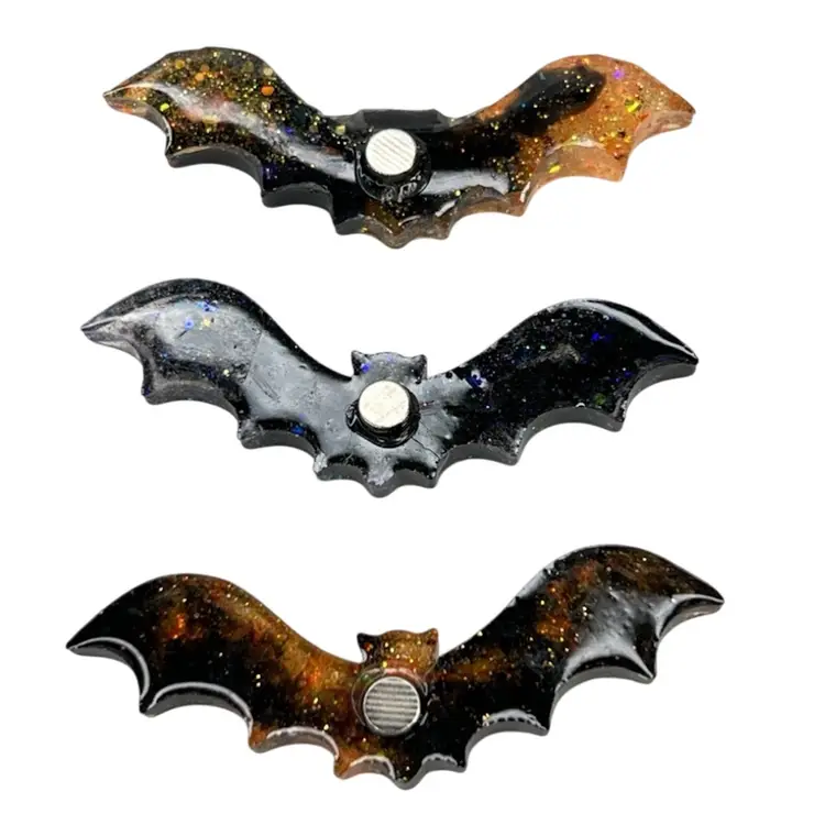 Handmade by me! 🫶 2-3/4" length x 5/8” width x 1/4” depth Set of 3 🦇 Resin & Glitter Halloween Bat Magnets Strong neodymium magnets