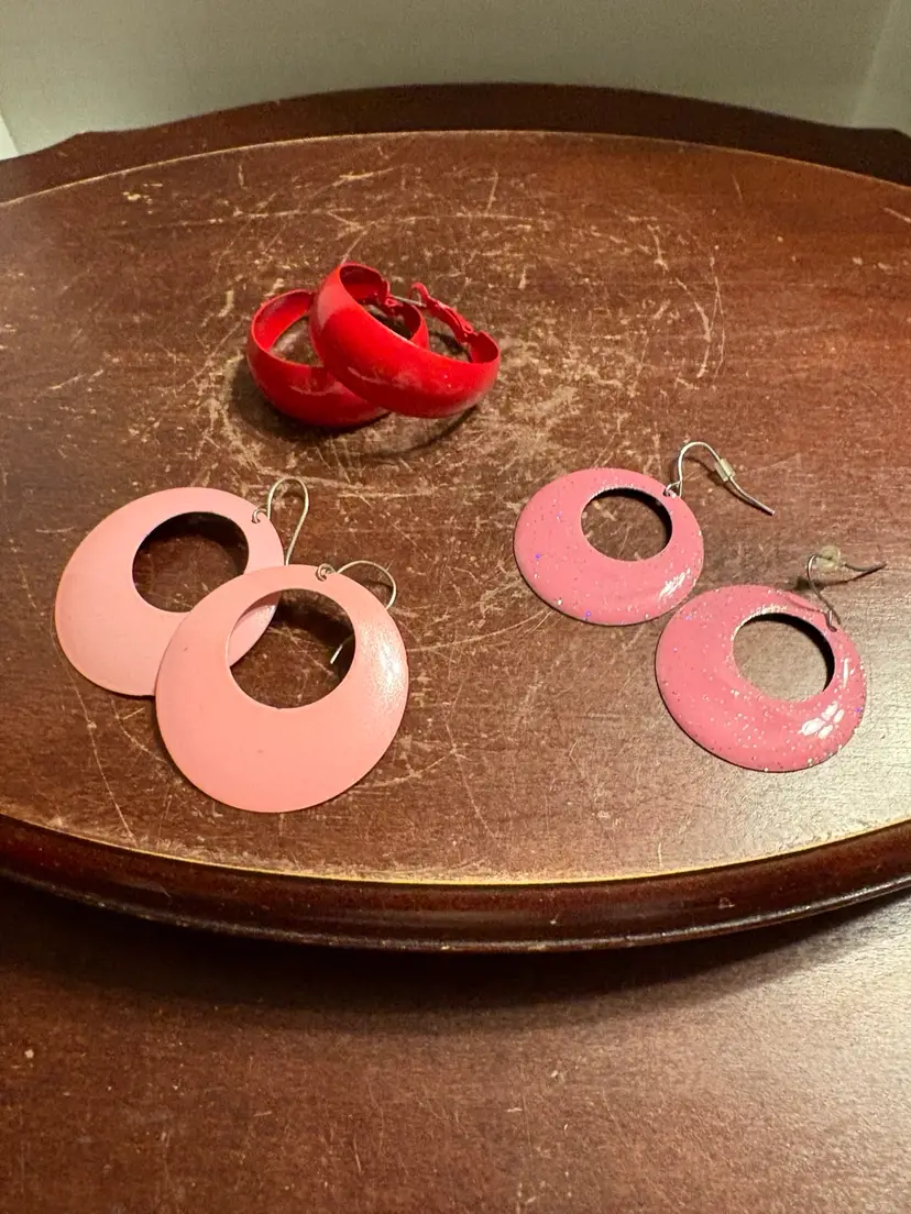 Red hoops are 2”, sparkly pink are 1.5” long and light pink are 1.75”