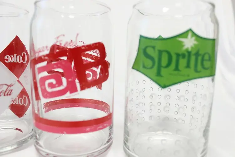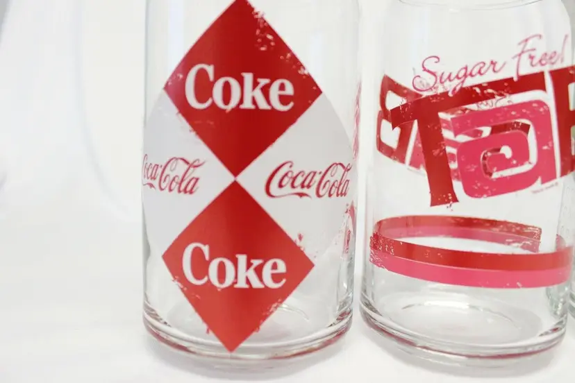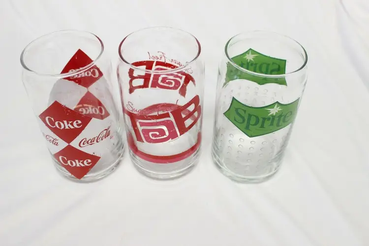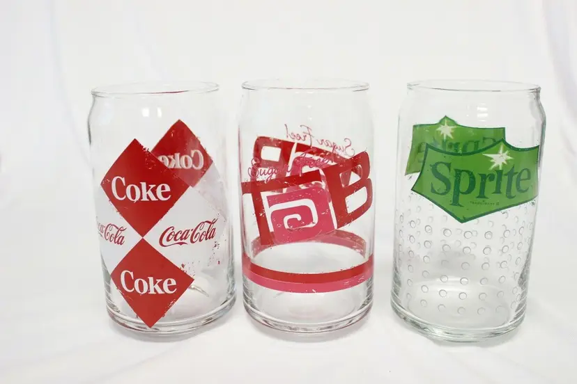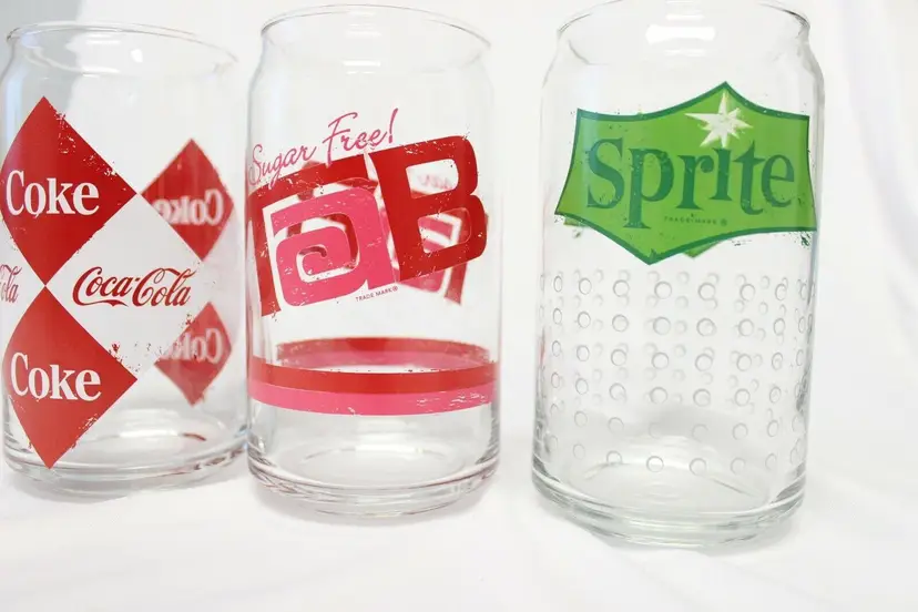 Set of 3 Retro Soda Glasses- Coca-Cola, Sprite, and Tab, they stand 5.25" tall. There is some fading due to age and use. No chips or cracks, in great condition!