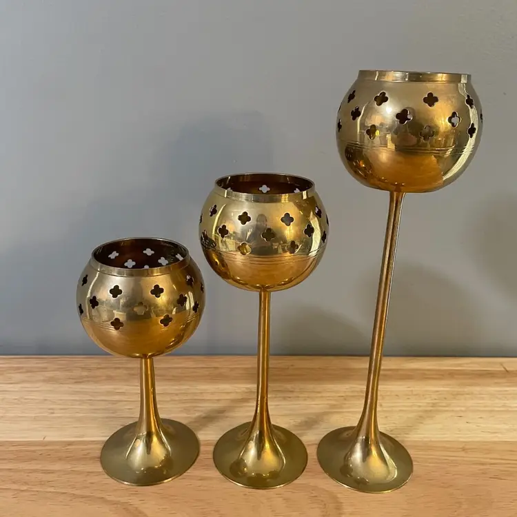 Really nice set of brass votive candle holders. Elevated in three different sizes with trumpeted feet. One tiny dent and scratch on the tallest one (as seen in pictures).