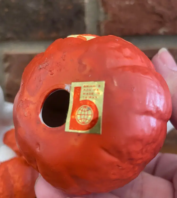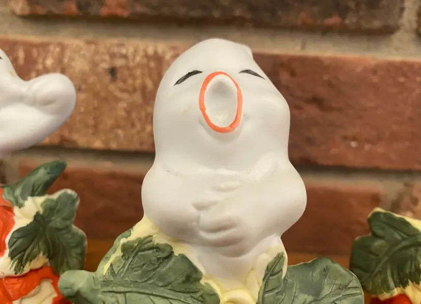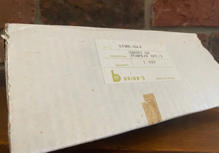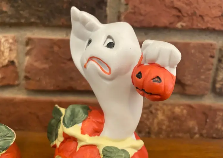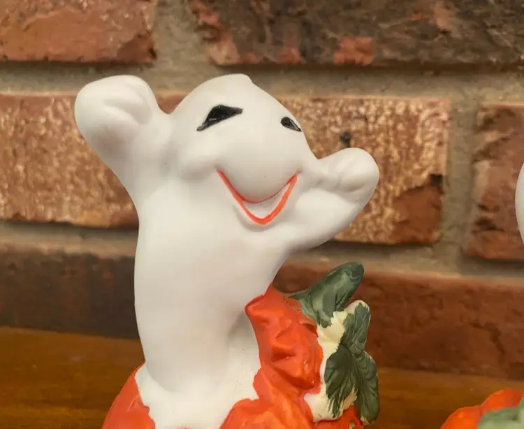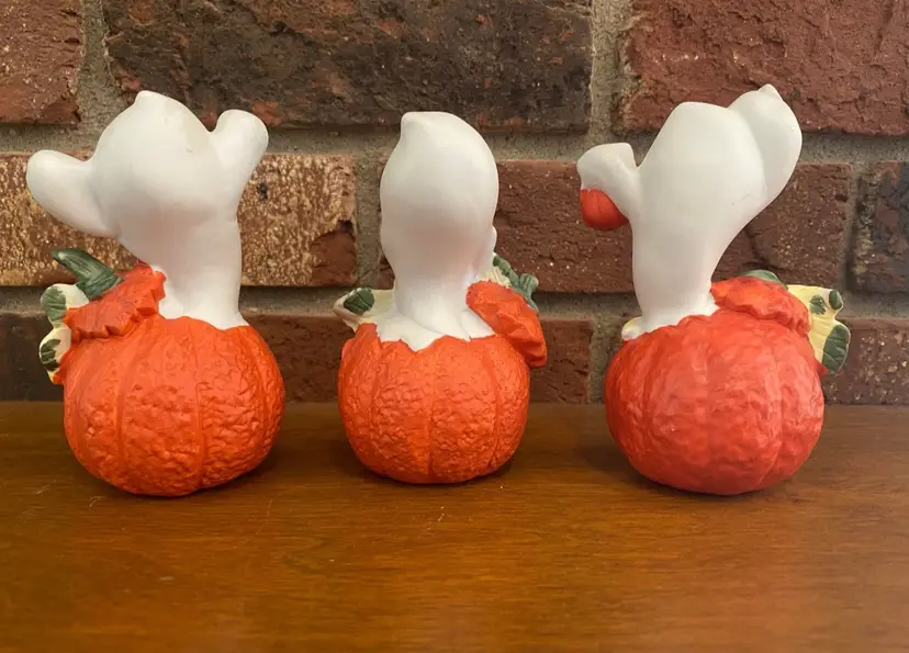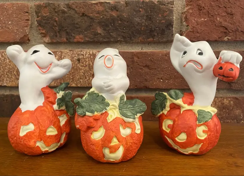 Set of 3 ghosts in pumpkins by Brinn’s made in Taiwan. No chips, cracks, or scratches. Original box included. The tallest ghost in 4.5 inches tall, the other two are between 4 and 4.25 inches tall.