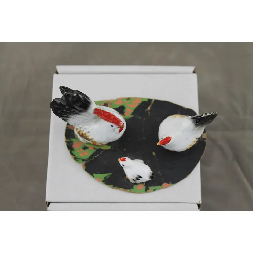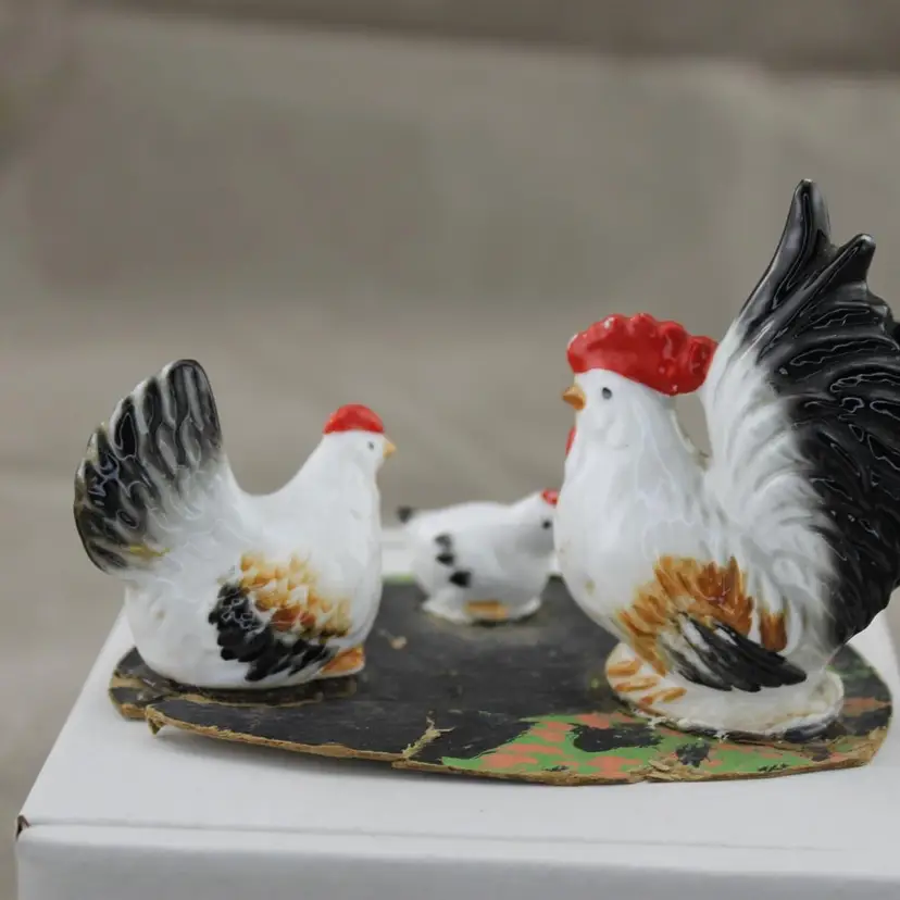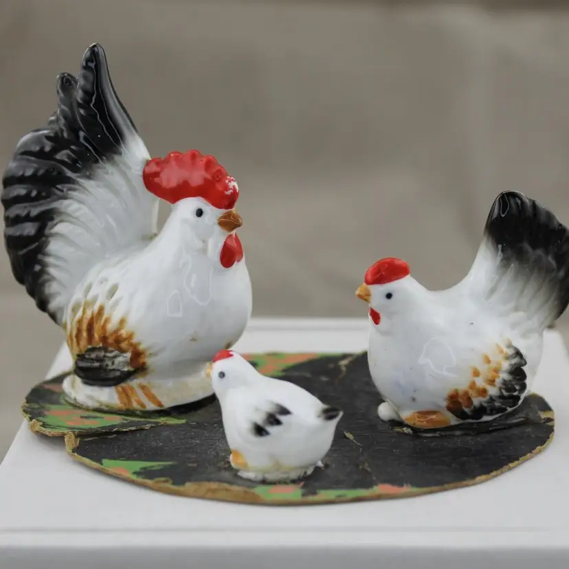 This is a set of 3 vintage ceramic or porcelain chicken figures. they are attached to a pie of cardboard. the original owner wrote on the these were bought in July of 1957 at the Cave of Mounds in Wisconsin. there are no chips or cracks but there is some loss to the paint on the top edges. see the pictures.