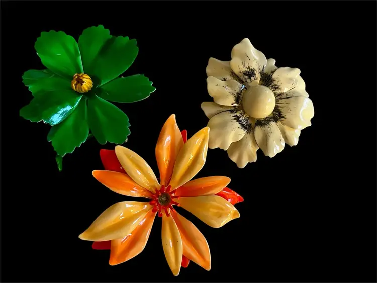 This set of three vintage enamel flower brooches are from the 1960s or 1970s. Each brooch features a different multicolor flower design, perfect for adding a pop of retro style to any outfit. Made from enamel, these brooches are durable and eye-catching, making them a unique and stylish accessory for any occasion. All have working pins, the only flaw is on the orange pin, it looks as if a center stone used to be there and is missing.