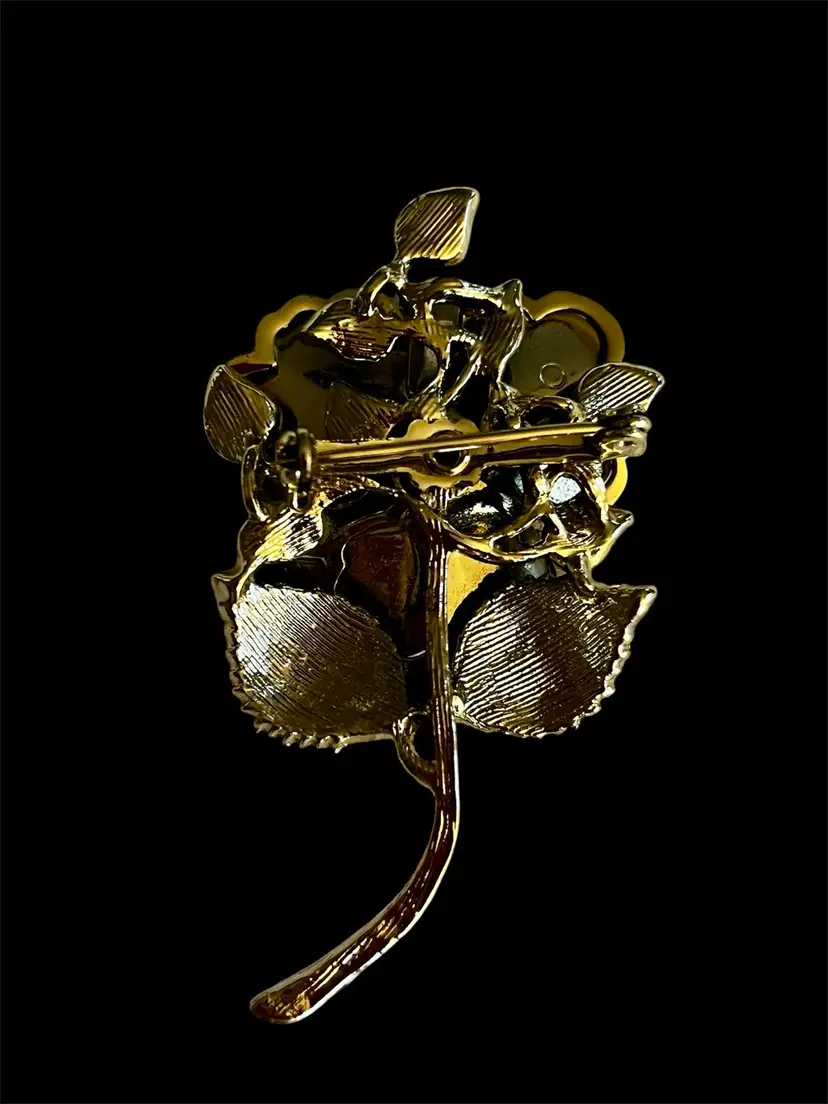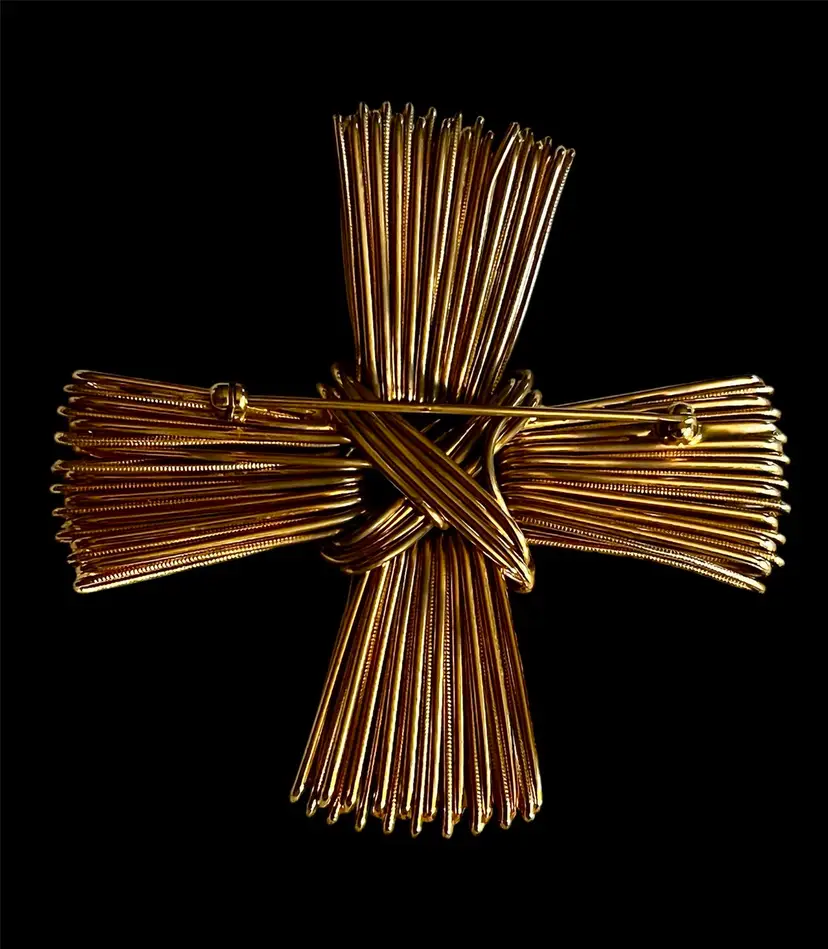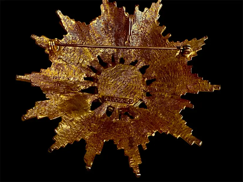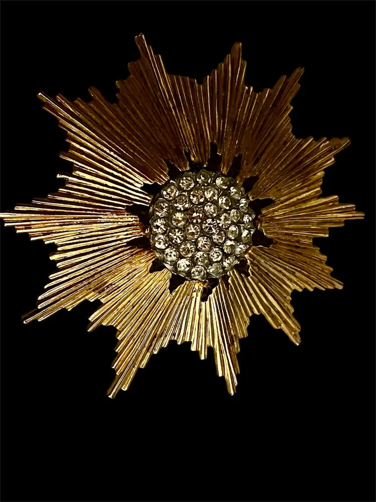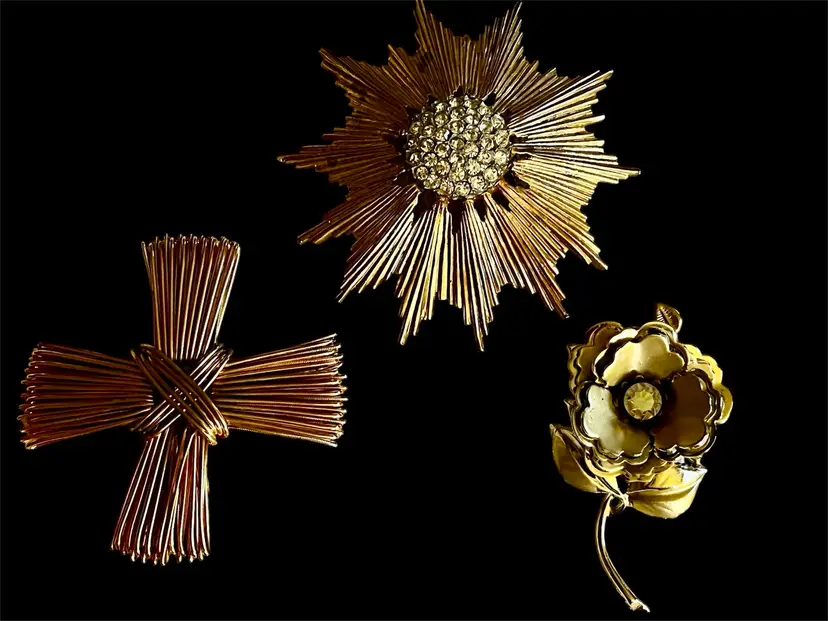 A set of 3 gold tone brooches for sale. Each brooch features a different design. The larger starburst pin is signed on back "Tancer". These fashion accessories are perfect for women looking to add a touch of retro charm to their outfits, especially for a birthday occasion. Made in the United States, these original pieces showcase the intricate craftsmanship and unique style of the era, making them a valuable addition to any jewelry collection.