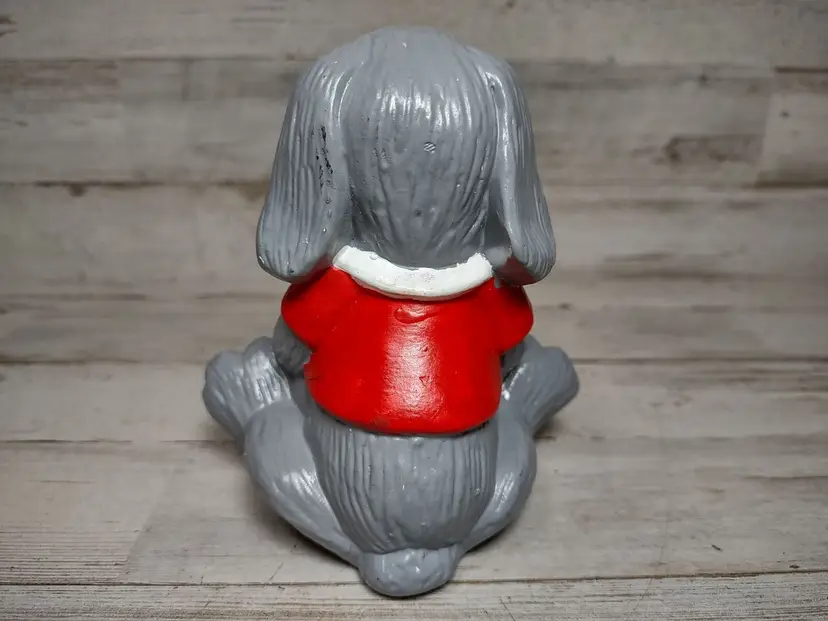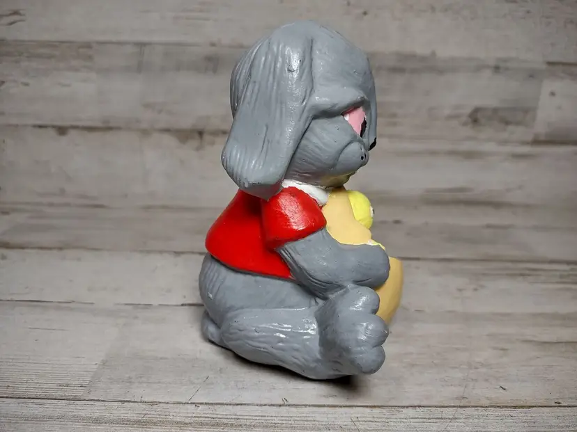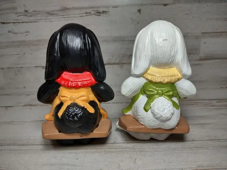 Used vintage condition with wear, scuffing, and paint chips. Top of chicken's beak is broken off. Larger rabbit figurines stand straight but are slightly wobbly. Figurines are marked "Fred Painted 1994" on the bottom and have the name "Beth" etched into ceramic under paint. Larger rabbits measure approximately 5" tall and small rabbit measures approximately 4.25" tall.