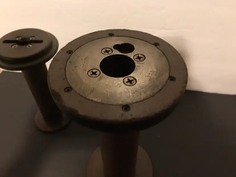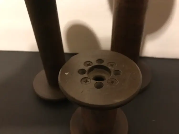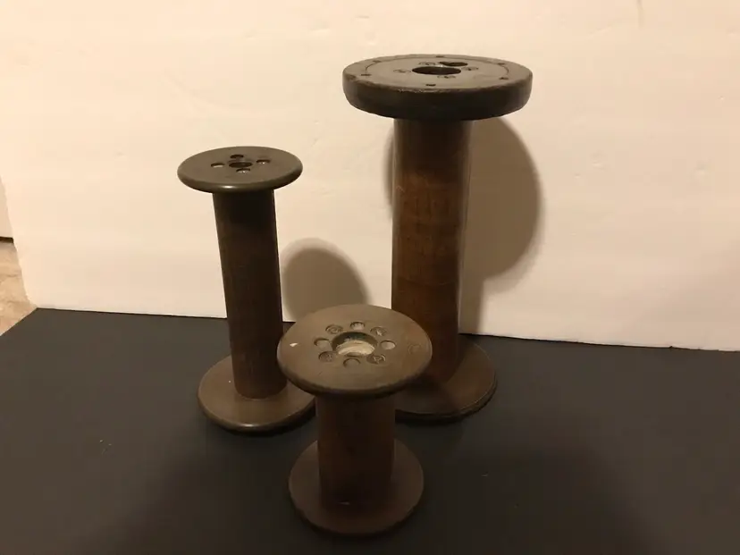 This set of 3 vintage textile wood/metal spool bobbins is perfect for adding a touch of industrial farmhouse charm to your sewing projects. Featuring an antique original design, these empty spools are made of wood and metal in a rustic brown color. The unique combination of materials and vintage aesthetic make them a stylish and functional addition to any sewing room or crafting space. 10”x5” 8”x4” 5”x4”