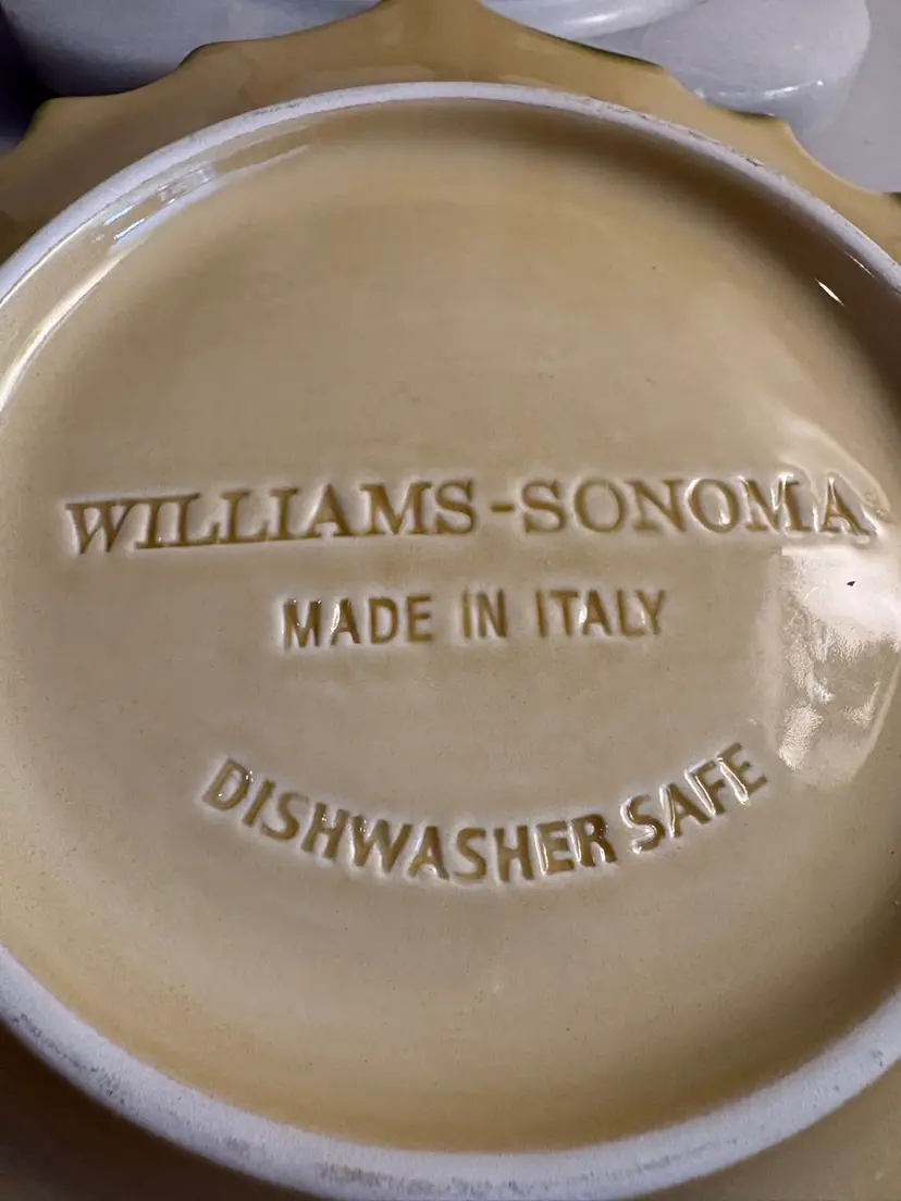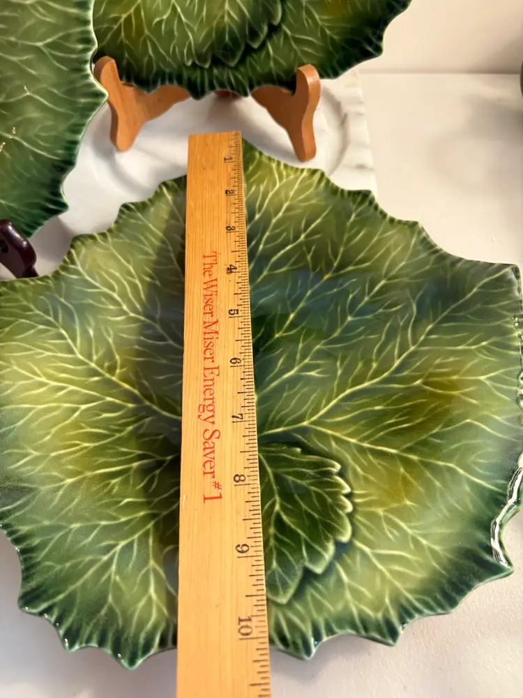This product is a set of 3 vintage William-Sonoma 10 3/8" green leaf dinner plates, made of porcelain in Italy. The plates have an elegant green leaf pattern, perfect for all occasions. With an impressed backstamp and a leaf theme, these plates are a stylish addition to any table setting. Made in 2010-2019 using pottery production technique, these plates are a timeless treasure for your dining collection.
