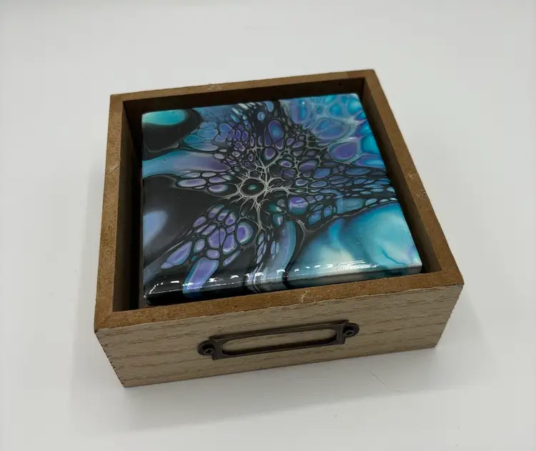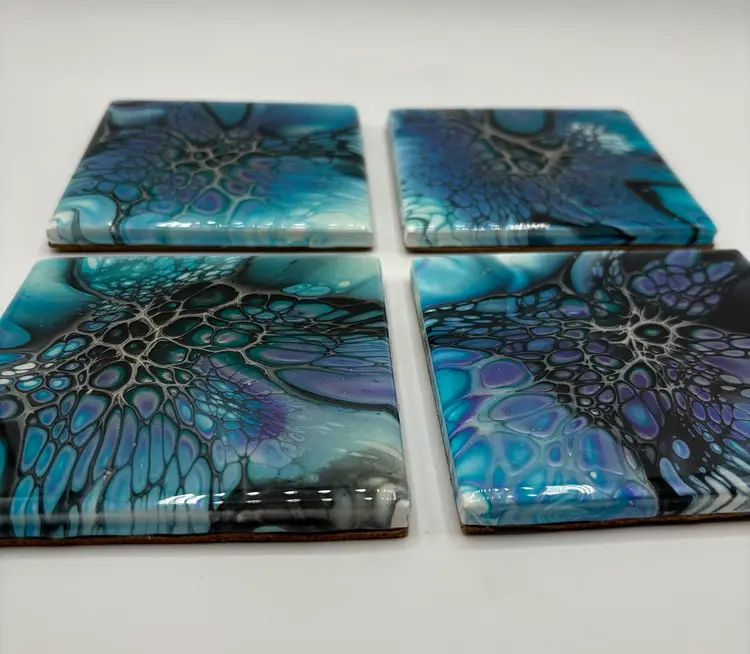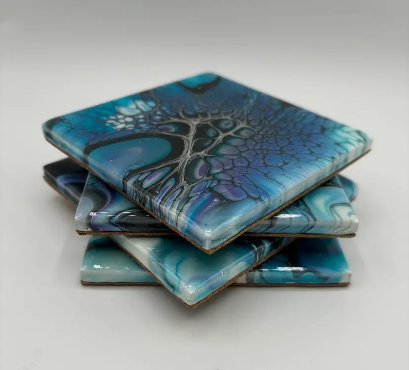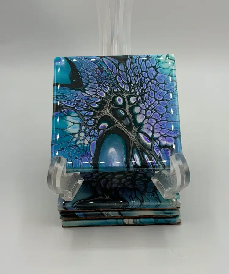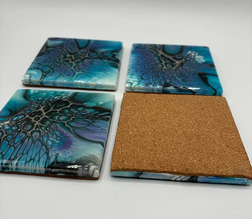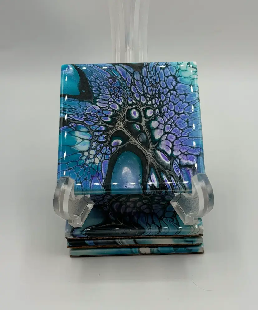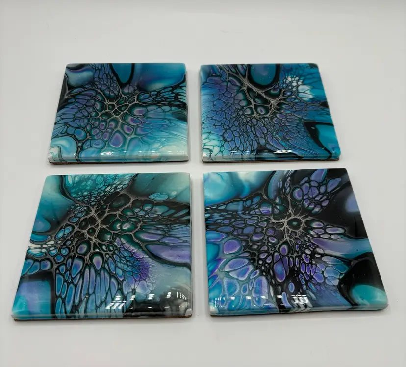 Very pretty turquoise, purple and black colors. 4x4” coasters. No chips or cracks.