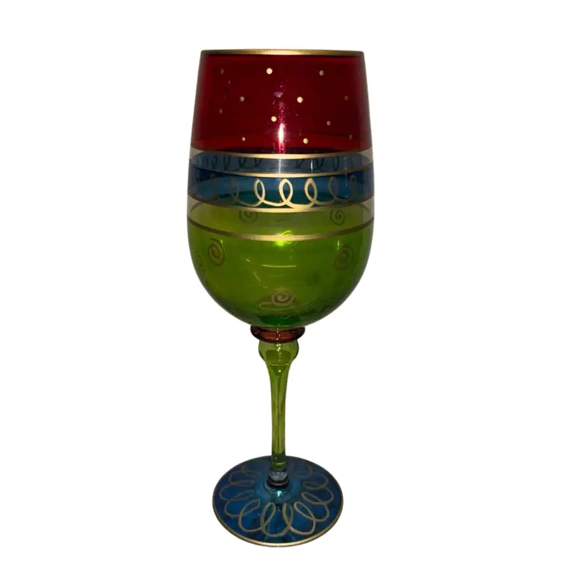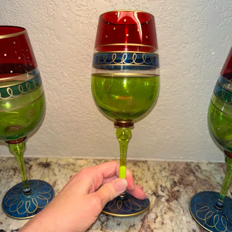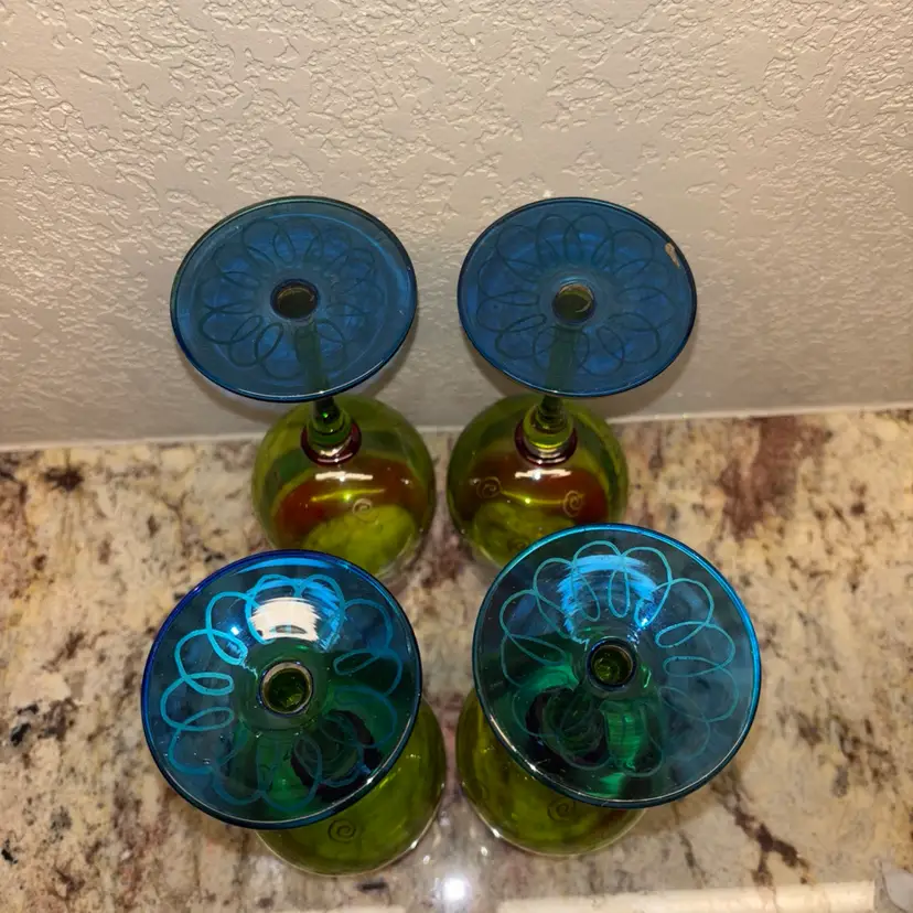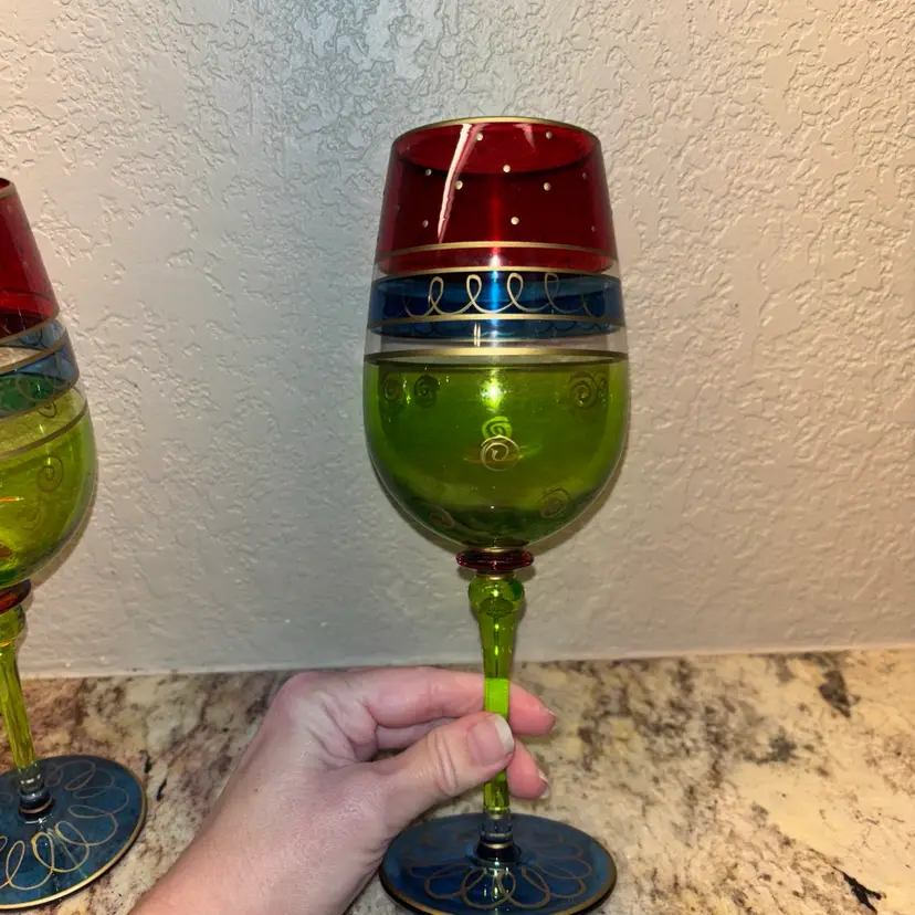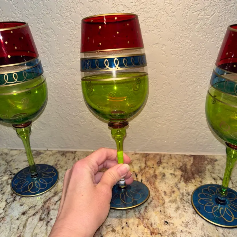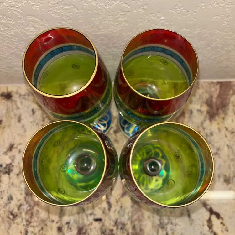 This set of 4 Bohemian Pier 1 multicolor water goblets / wine glasses stands at 9 1/4" tall, making them perfect for any occasion. The round, multicolor glasses are made of high-quality glass and are ideal for serving wine or water in style. This four-piece set includes goblets and wine glasses, providing a service for 4 guests. The Pier 1 P1C7 model brings a touch of bohemian flair to your table settings. Used for decoration. Excellent condition.