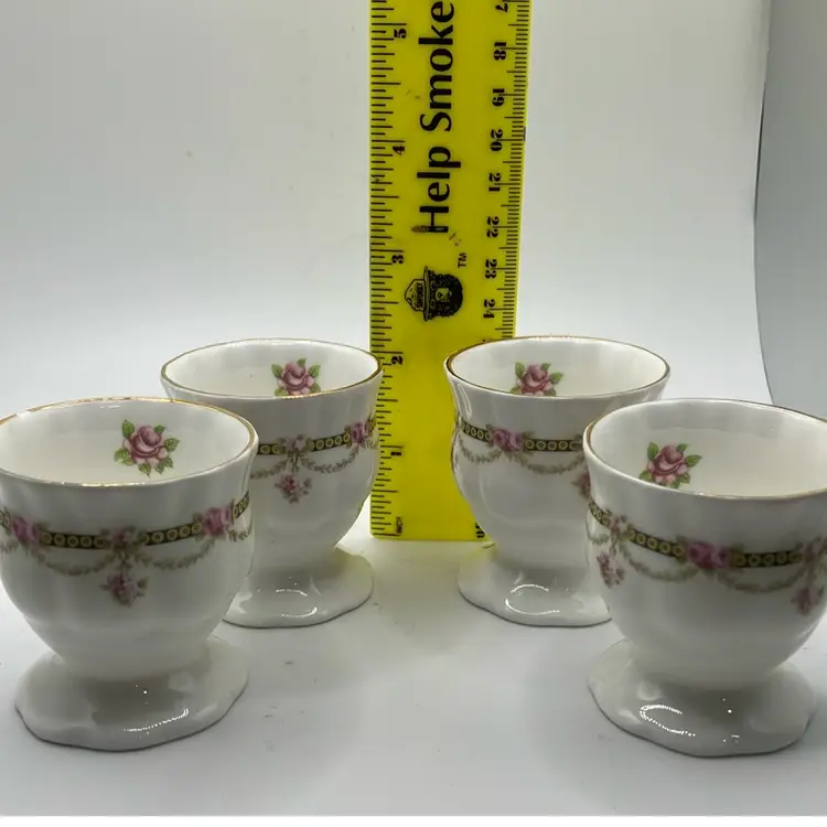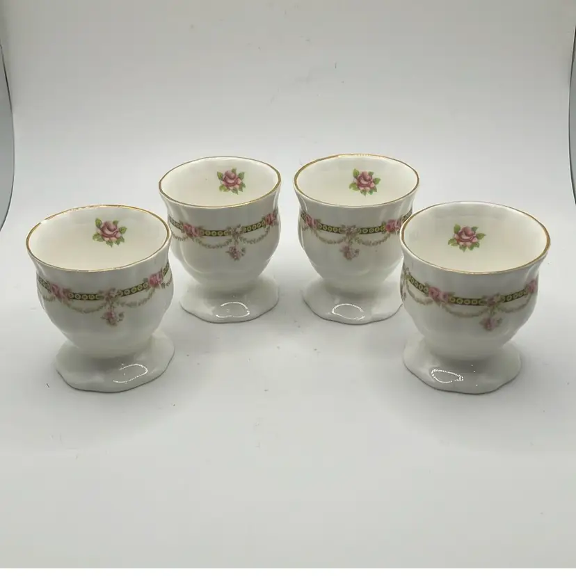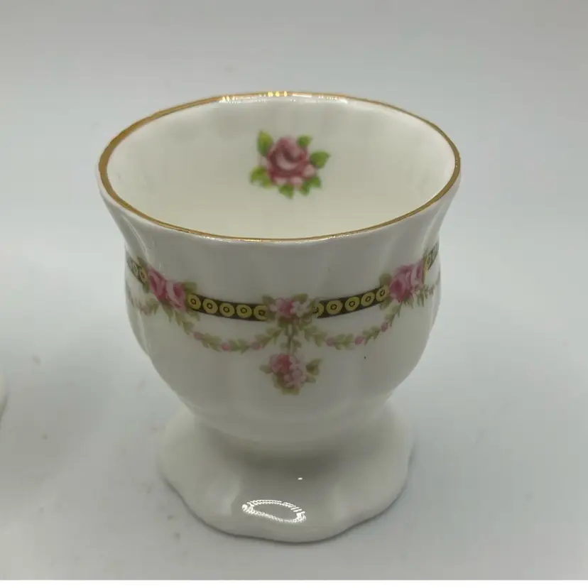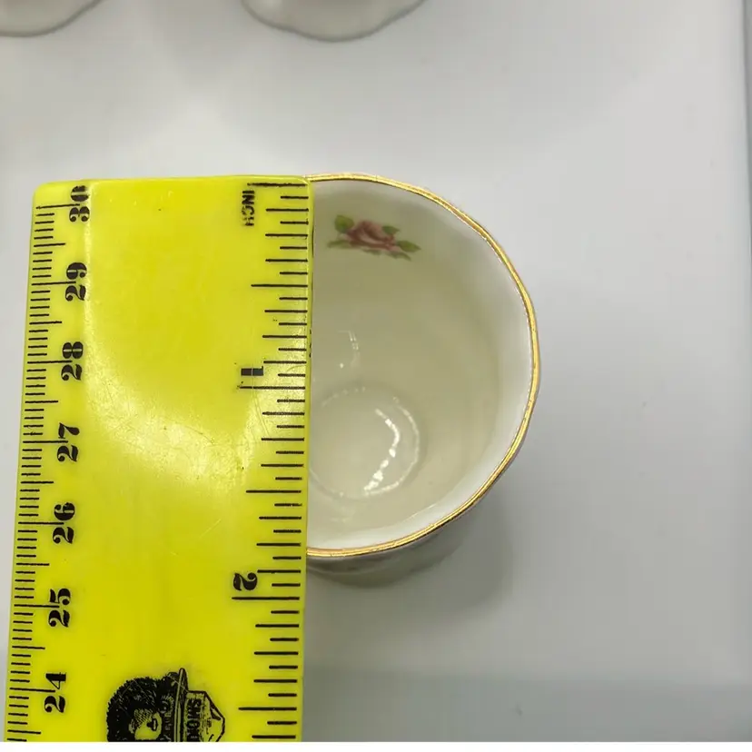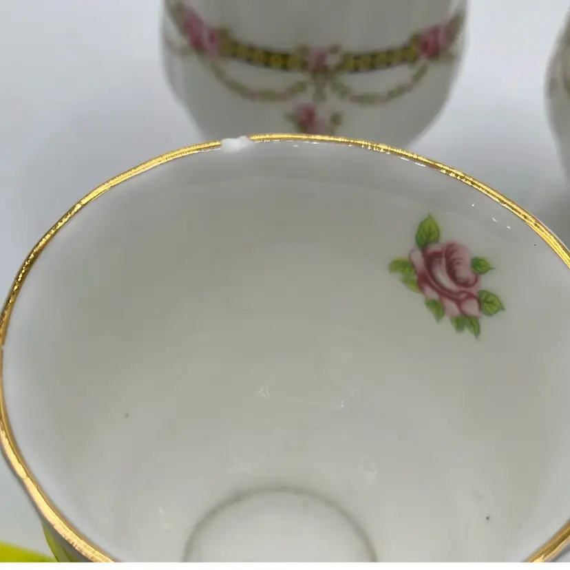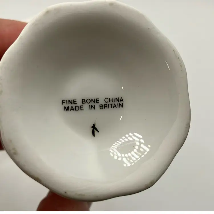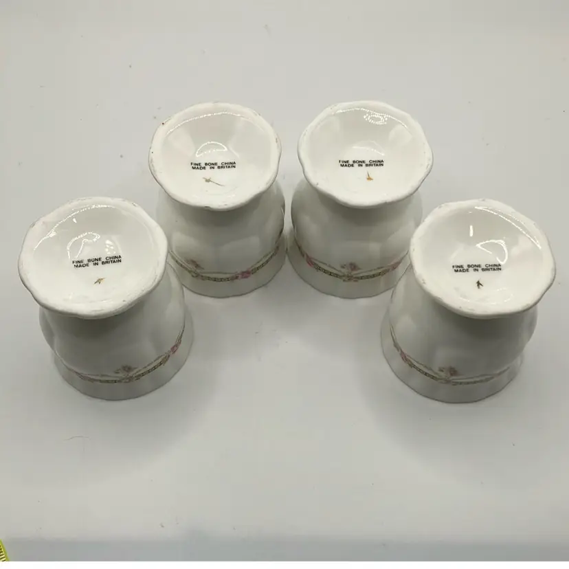 One has tiny flea bite on rim (see last pic). All marked on bottom Fine Bone China - Made in Britain. Gold edging around rim and pretty flower detail on inside.