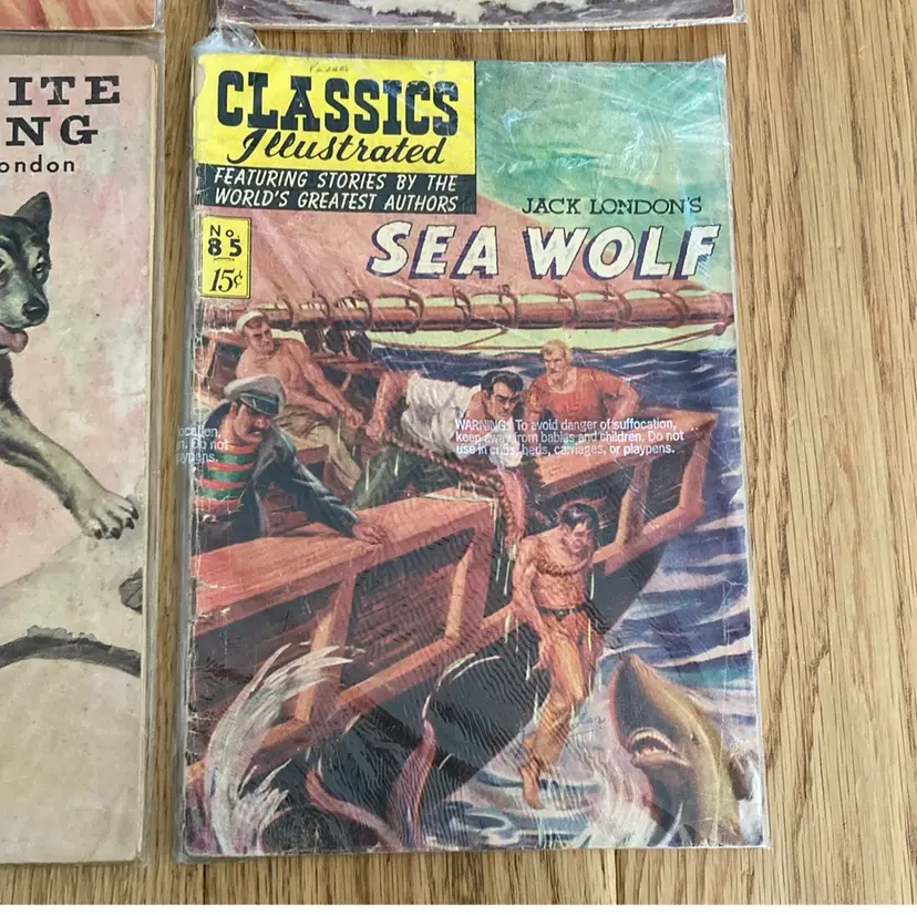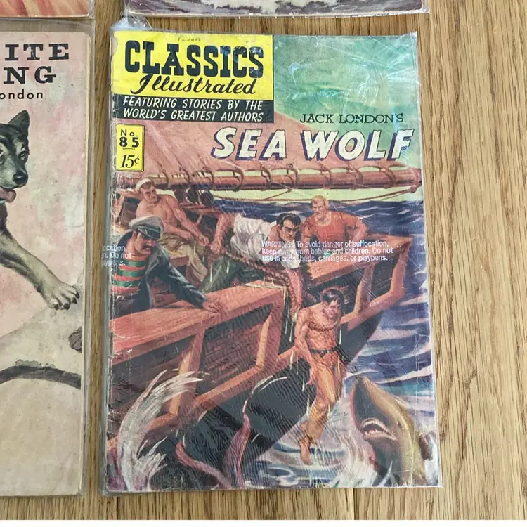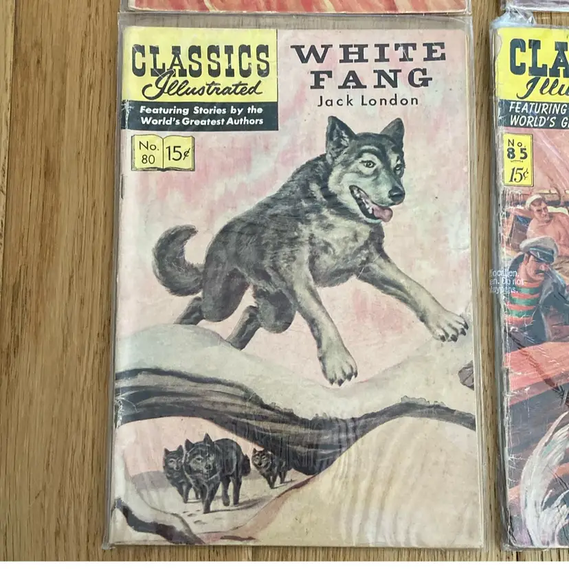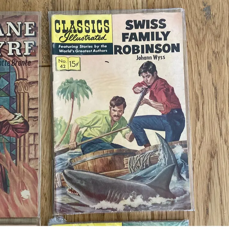 Set of 4 Classic Illustrated books by famous authors and made into comic books. This set contains White Fang, Swiss Family Robinson, Sea Wolf and Jane Eyre. In well read condition. Fantastic for displays.