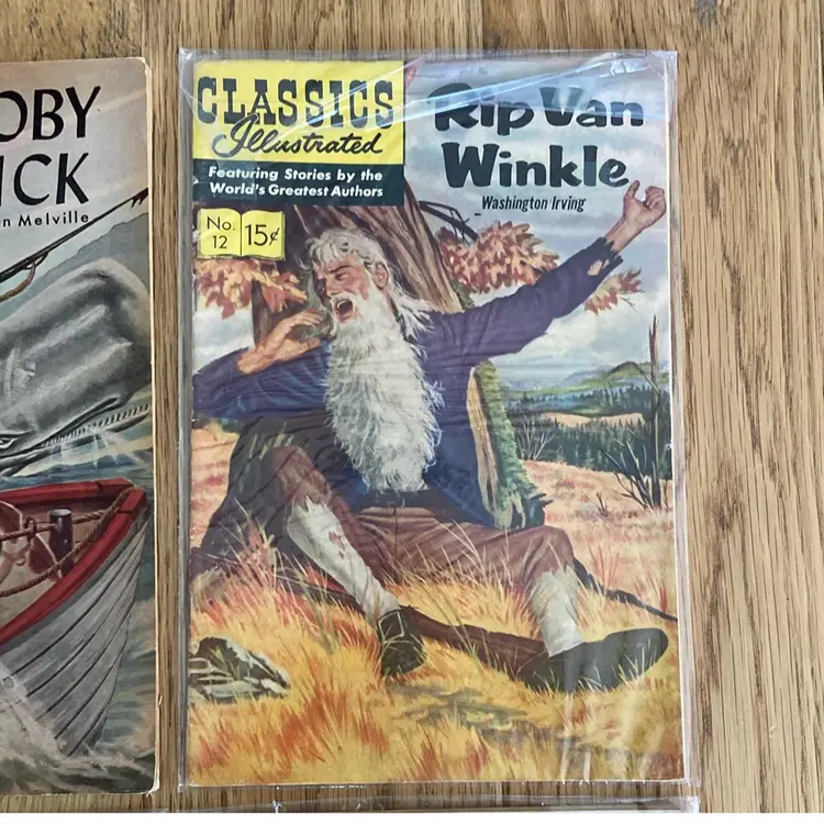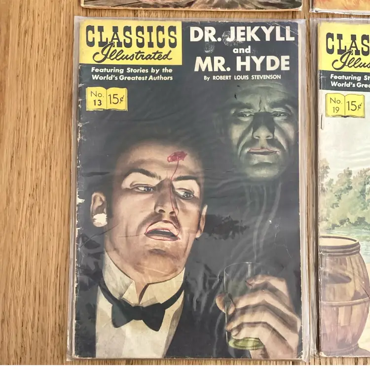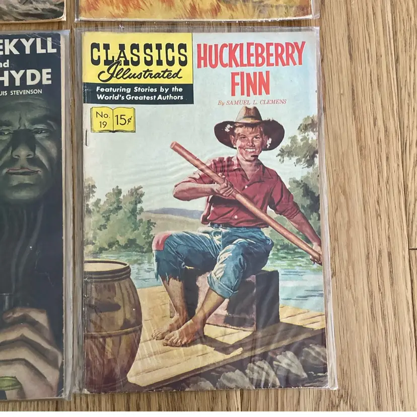 Set of 4 Classic Illustrated books by famous authors and made into comic books. This set contains Moby Dick, Rip Van Winkle, Dr Jekyl and Mr Hyde, and Huckleberry Finn. In well read condition. Fantastic for displays.