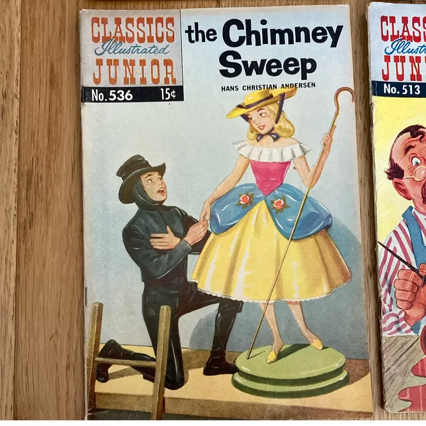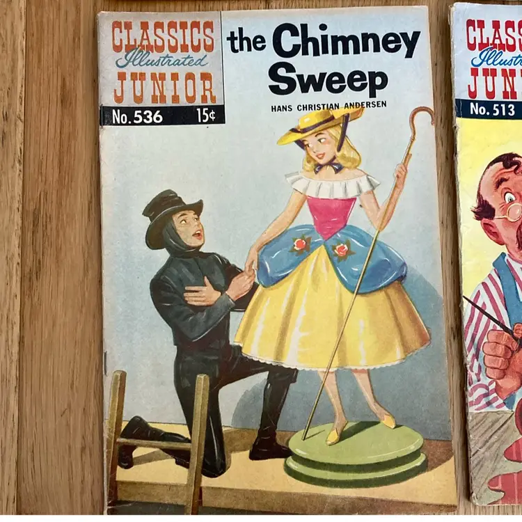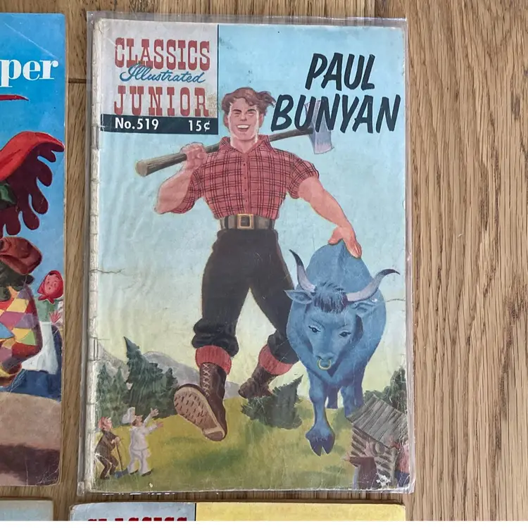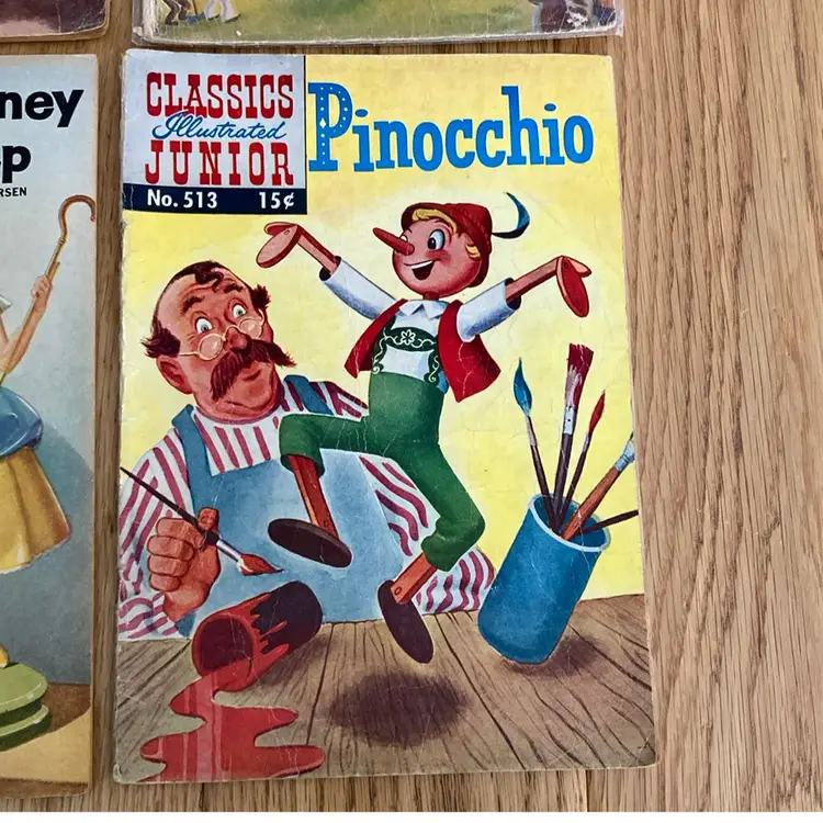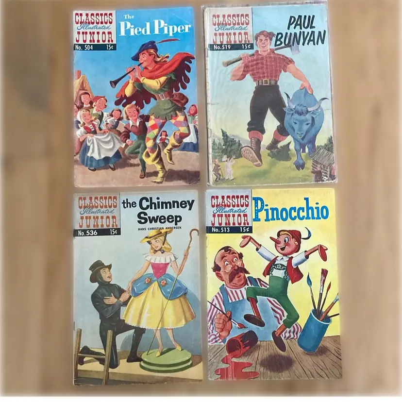 Set of 4 Classic Illustrated Junior books by famous authors and made into comic books. This set contains The Pied Piier, Paul Bunyan, The Chimney Sweep and Pinocchio. In well read condition. Fantastic for displays.