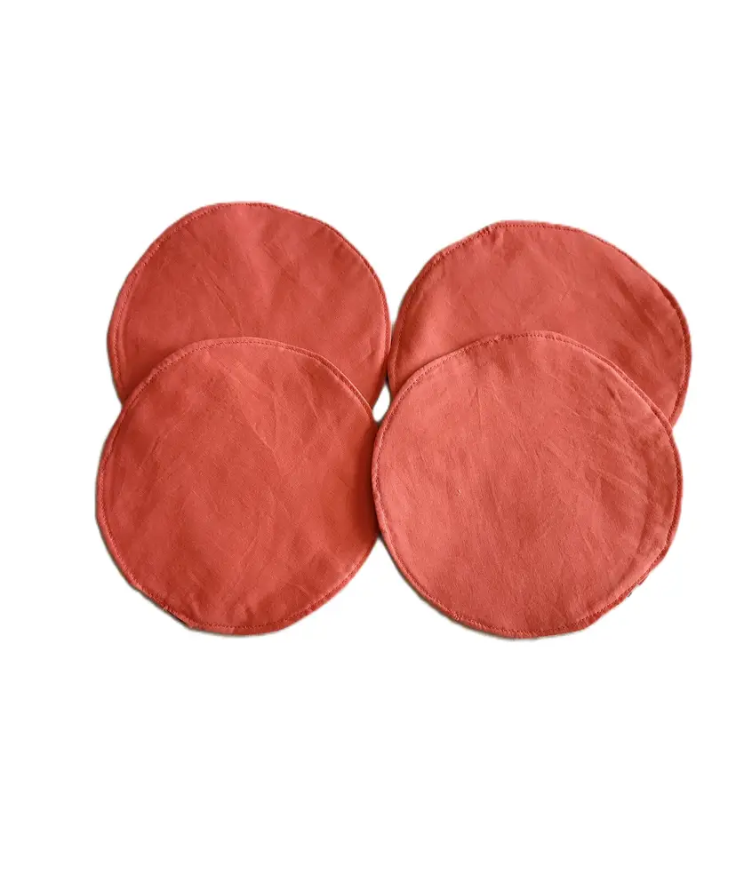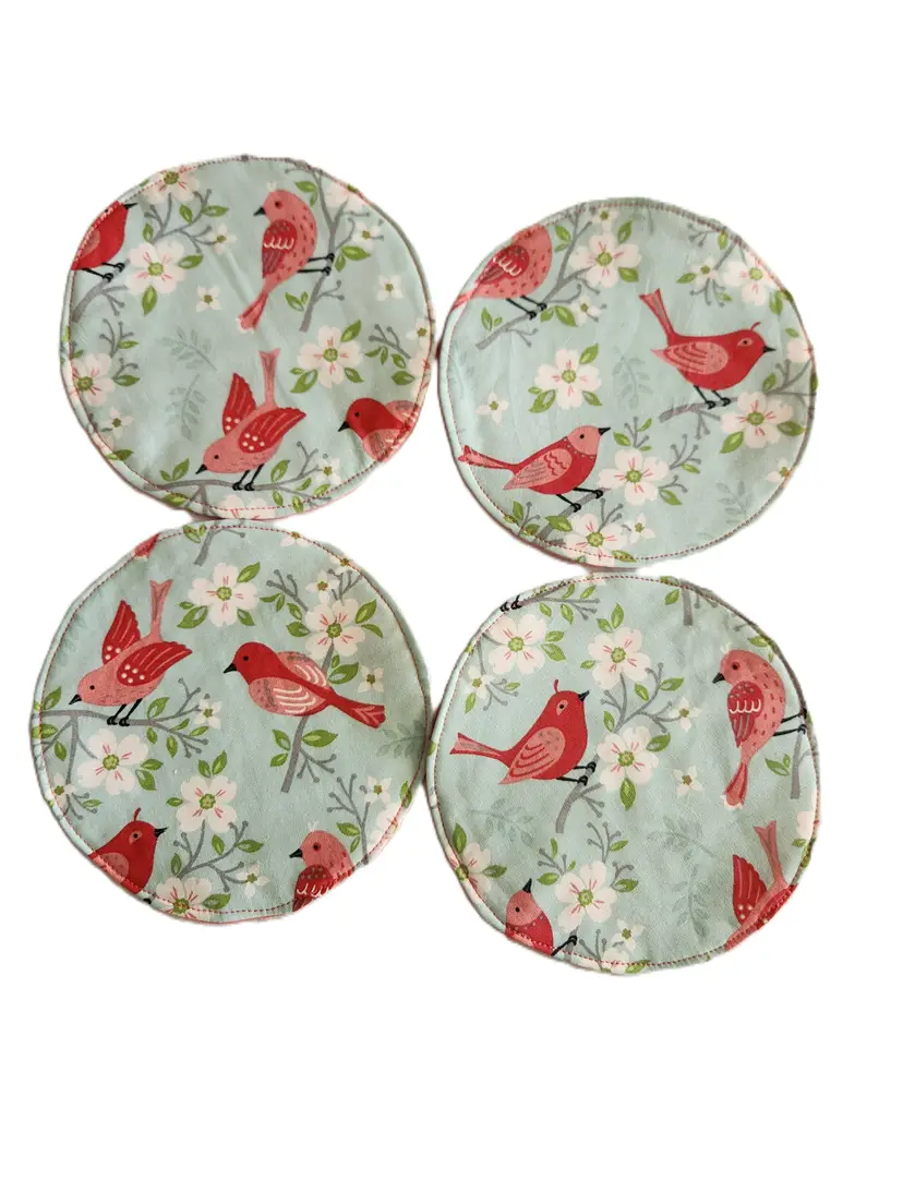 This is a set of 4 coasters. They are made from cotton fabric. Each one has a middle layer of cotton batting to give extra absorbency. Machine washable.