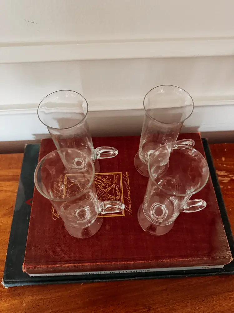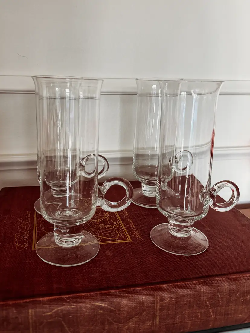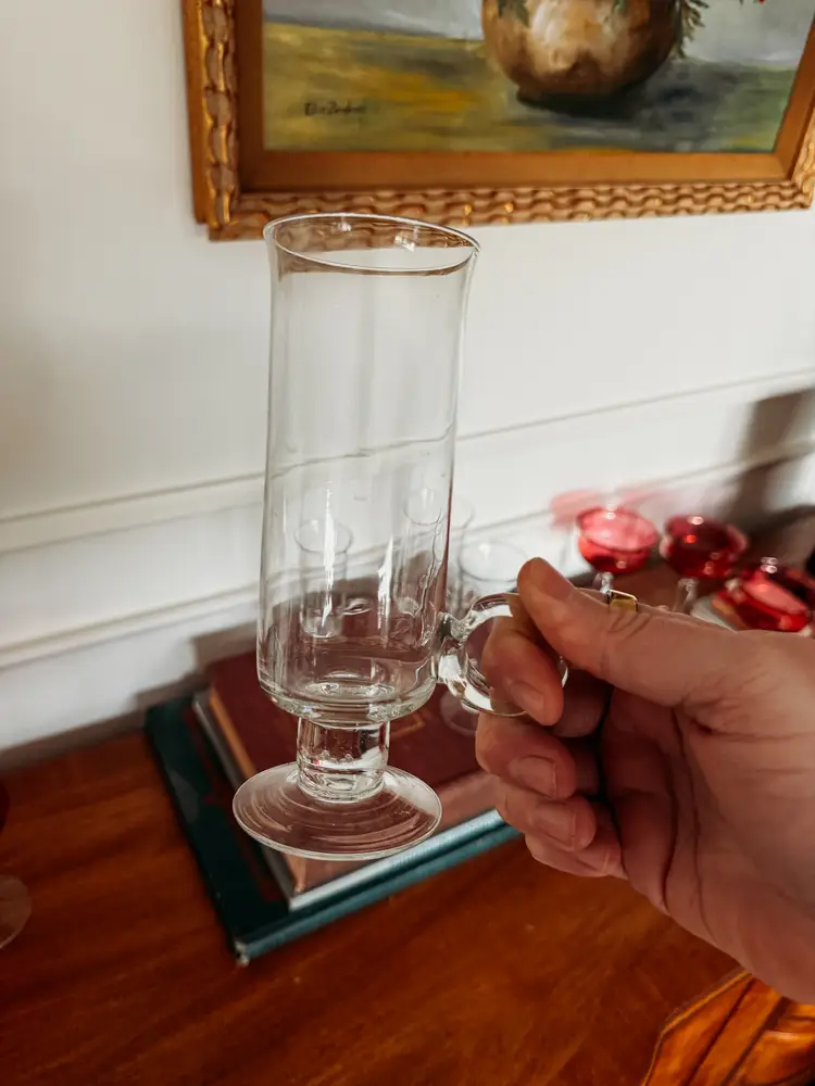 designed by Frank Thrower in the 1970s. The mugs feature a distinctive footed or pedestal base and an applied glass handle. They are made of 24% lead crystal. The design allows the drinker to appreciate the layers of an Irish coffee, from the coffee at the bottom to the cream on top. The glasses stand approximately 6 inches tall.