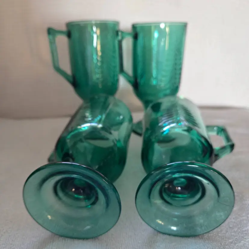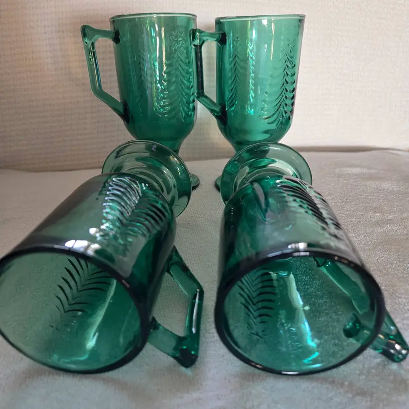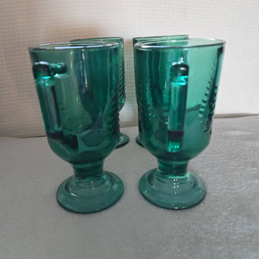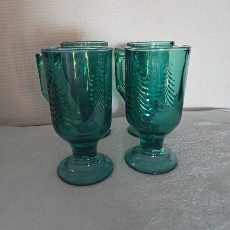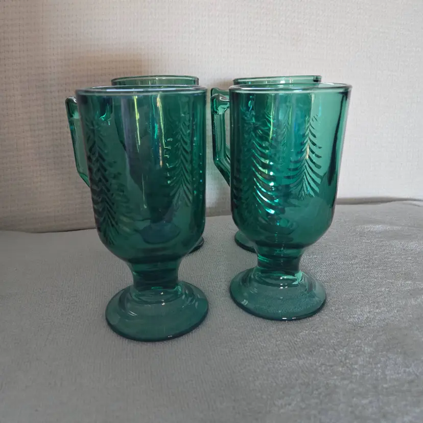 These mugs are great for serving beverages during the holidays. Featuring an embossed evergreen Christmas Tree design. Made of heavy pressed glass. Capacity is 7 Oz. In excellent condition. No chips, cracks, or damage. Measures 5 1/2" tall and they have a 2 1/2" opening.