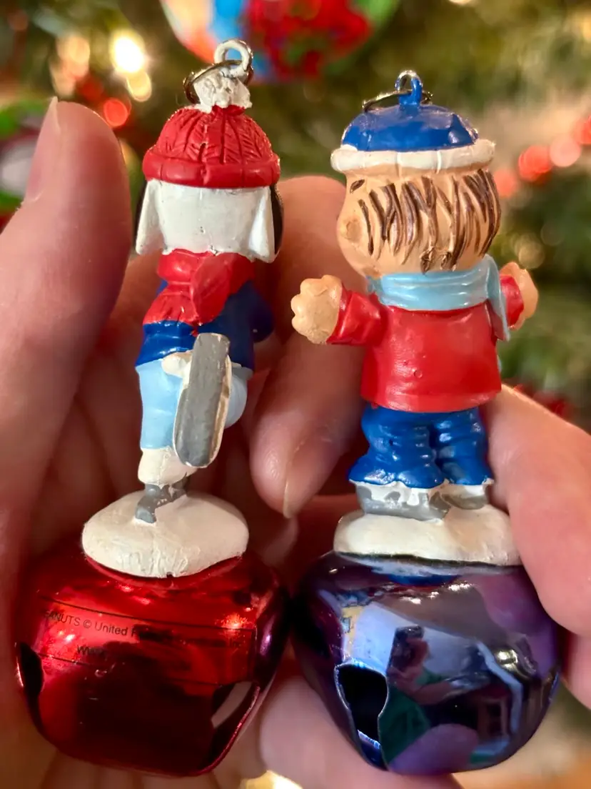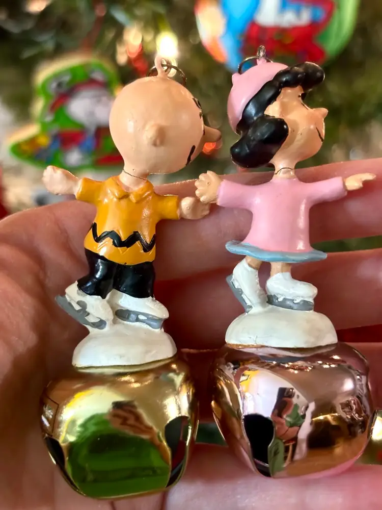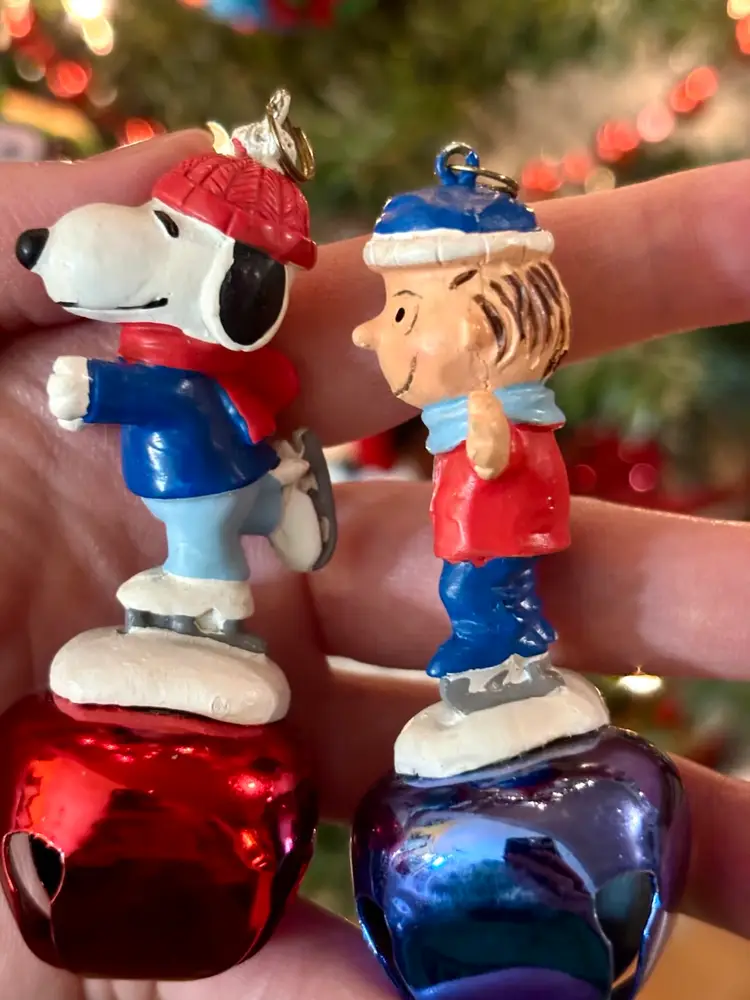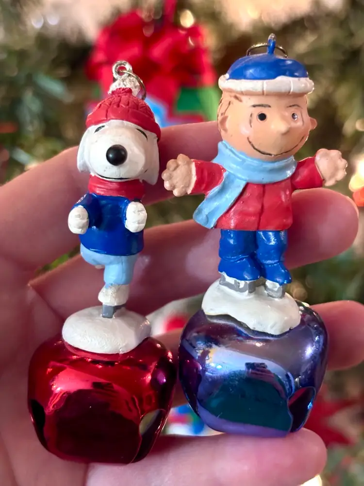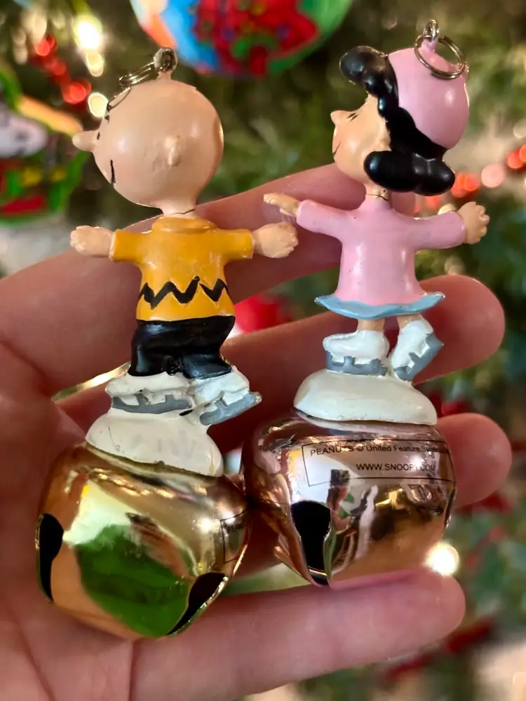 This is a set of super cute bell ornaments, featuring Snoopy, Charlie Brown, Lucy, and Linus. All four characters are ice skating atop a real bell that jingles.