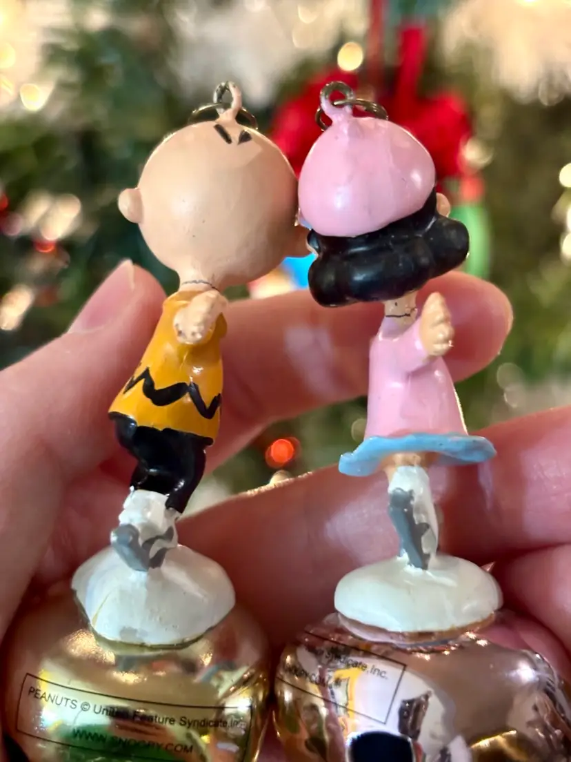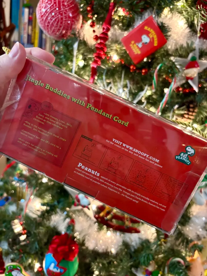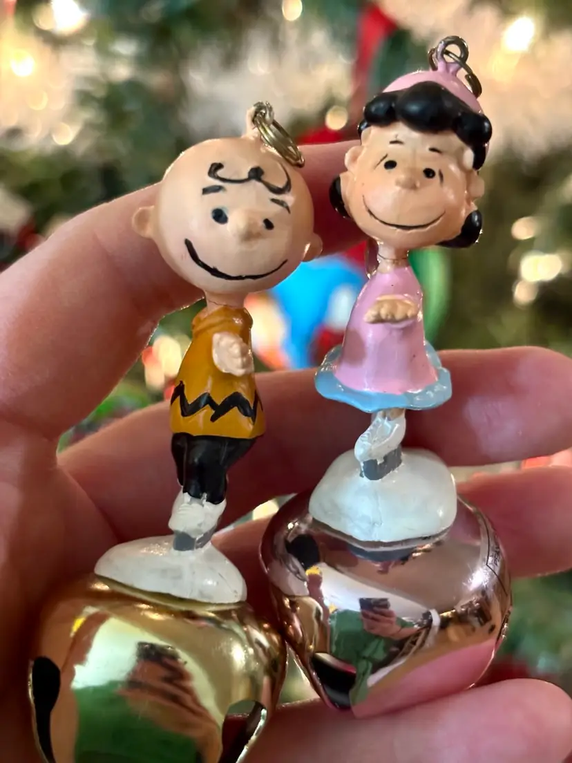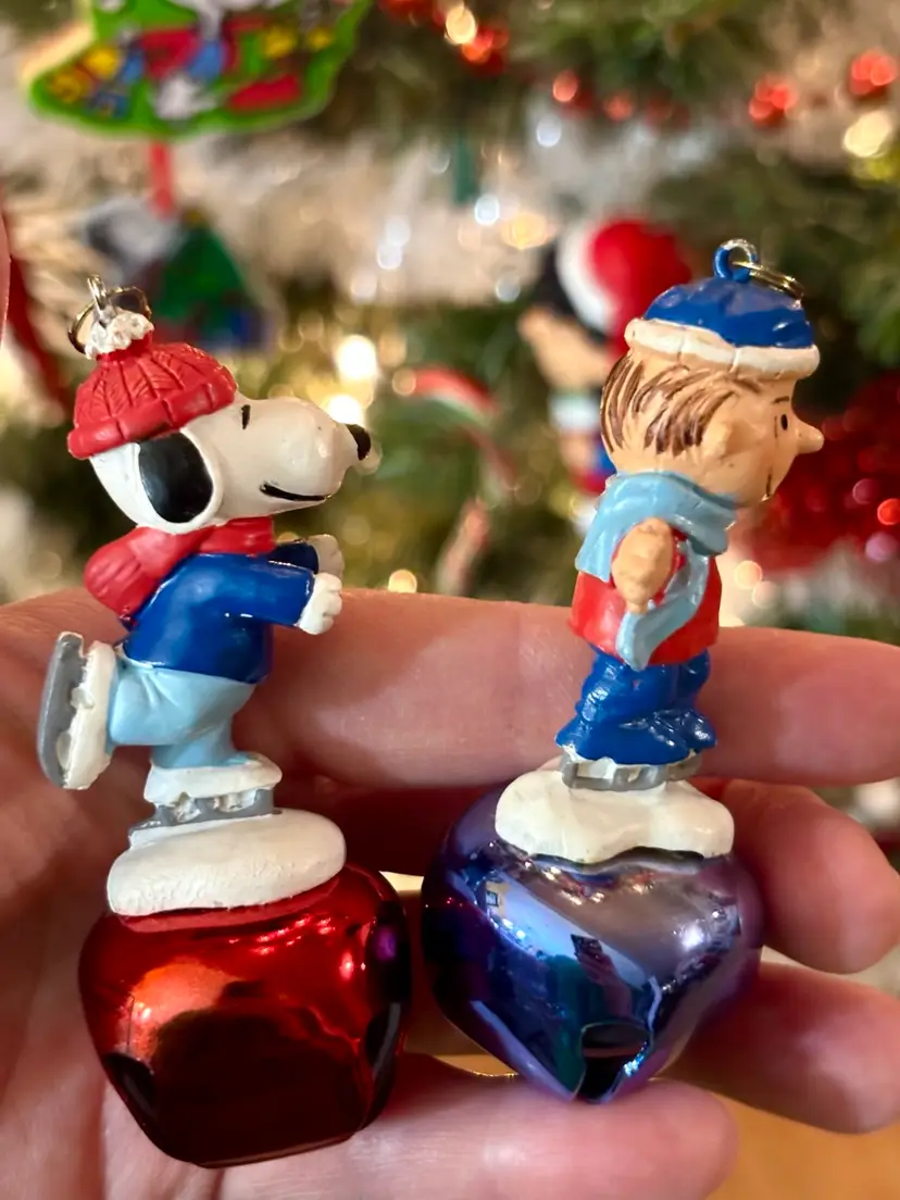This is a set of super cute bell ornaments, featuring Snoopy, Charlie Brown, Lucy, and Linus. All four characters are ice skating atop a real bell that jingles.