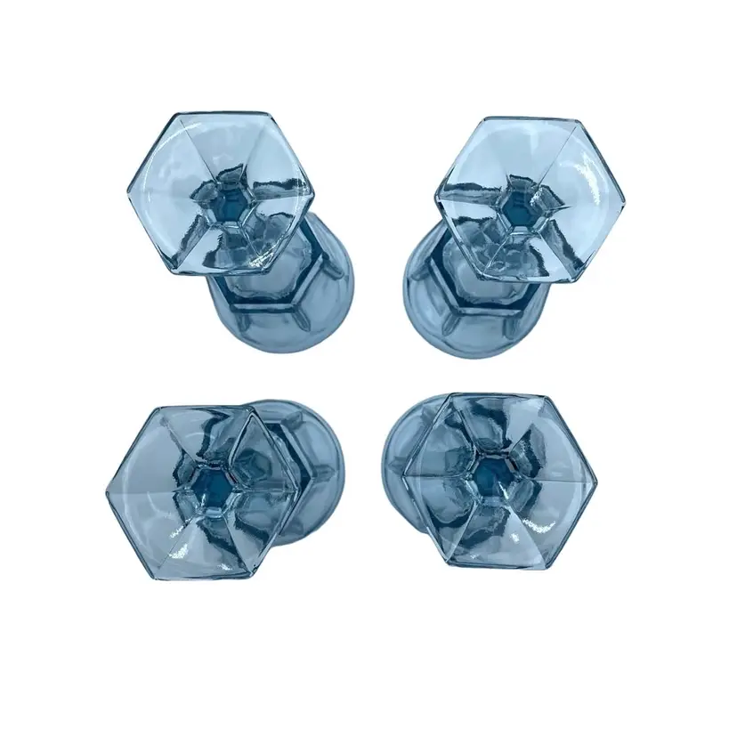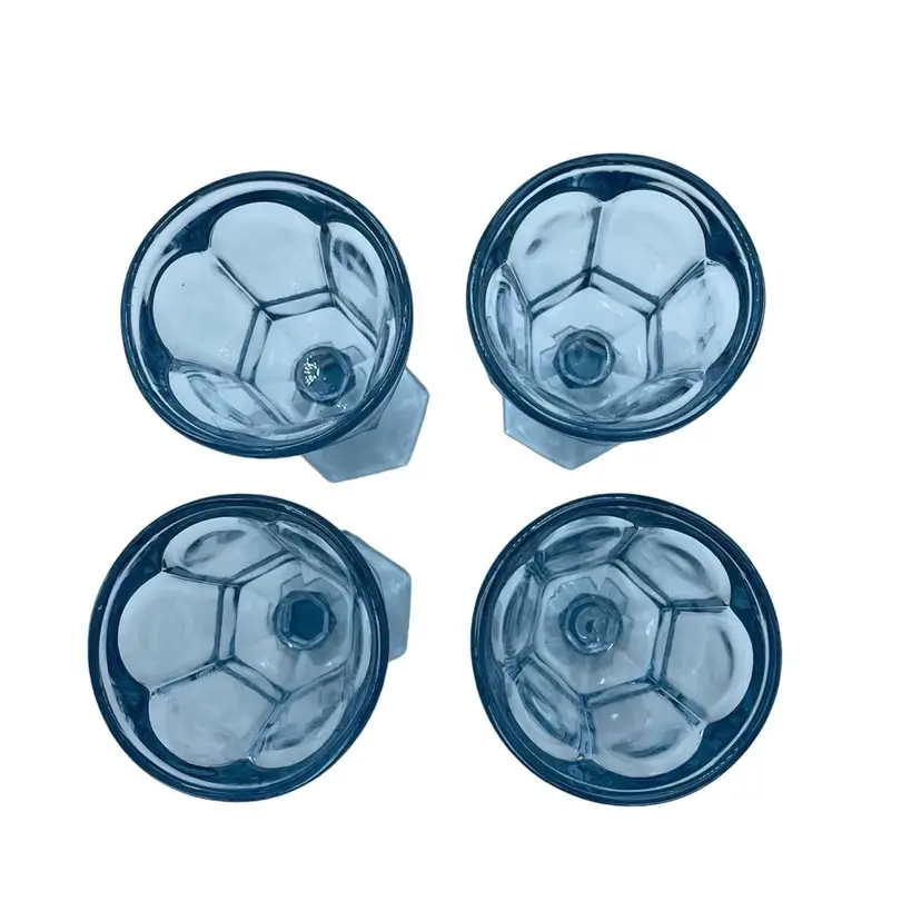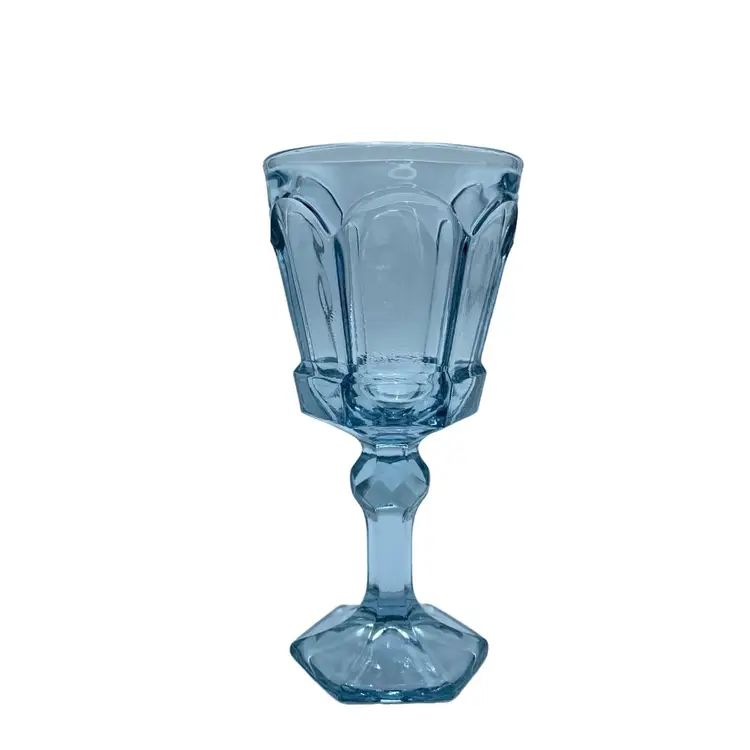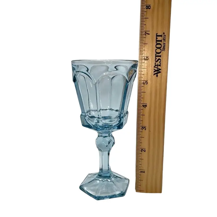 This is a set of 4 vintage light blue Fostoria Jamestown Virginia wine goblets. Each measures approximately 6" tall x 2.5" across the top. They hold approximately 4fl oz. One has a flea bite on the rim as shown in picture 5. No other flaws. #240