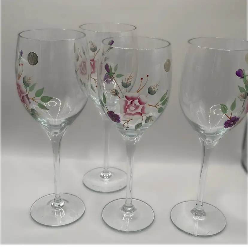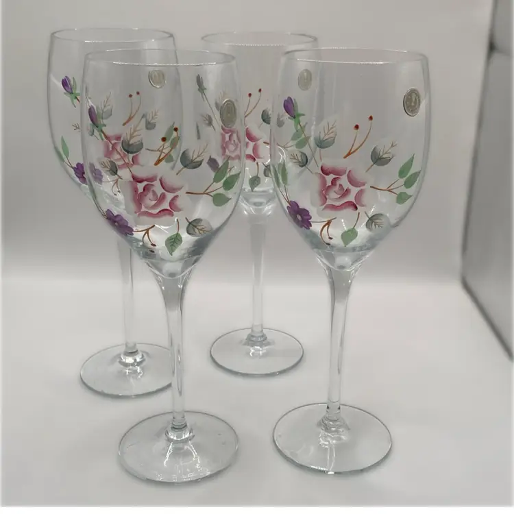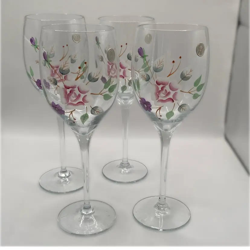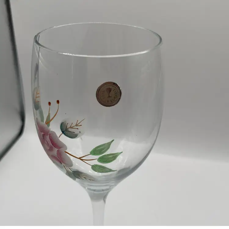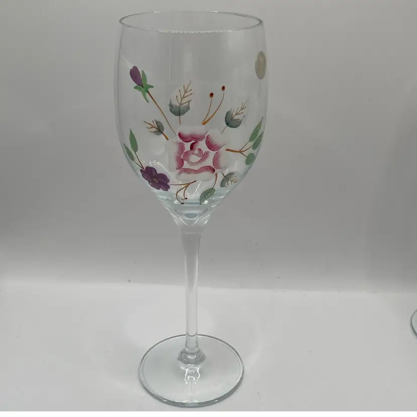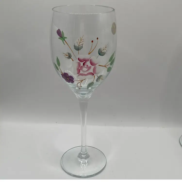 Made of lead-free crystal and hand painted floral design in pink, purple, greens and tan. 7” tall, 7 ounce capacity B12
