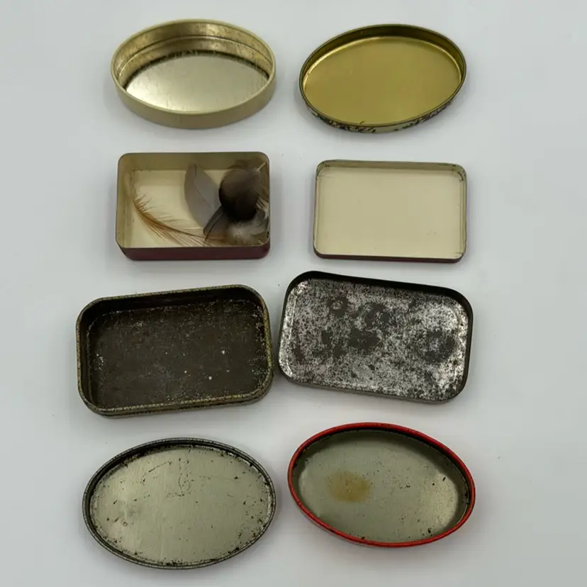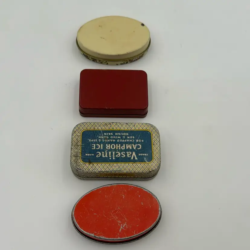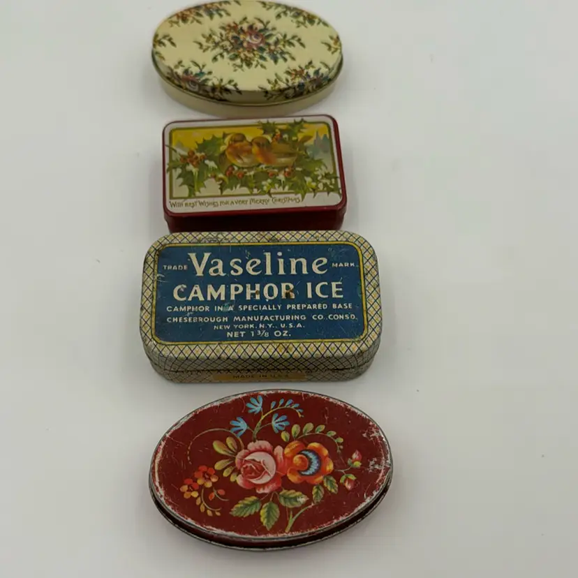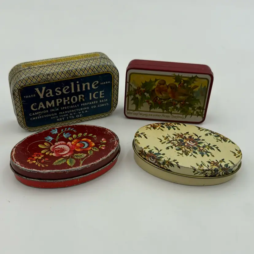 Set Of 4 Mini Tins Vintage 2 Tin Pill Boxes Tin Bird Box It Has Feathers. Vaseline Tin It Is Very Old