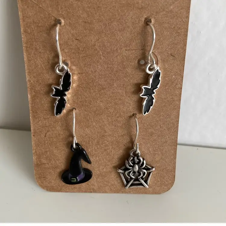 Set of 4 mix and match Halloween dangle earrings. They are all enameled metal. They measure between 1/4” to 1/2” across and dangle down 1”.