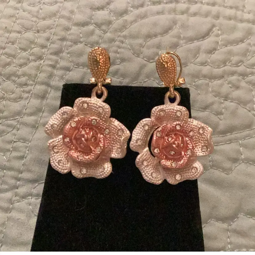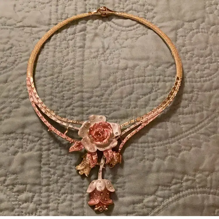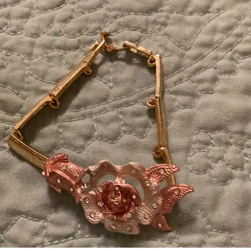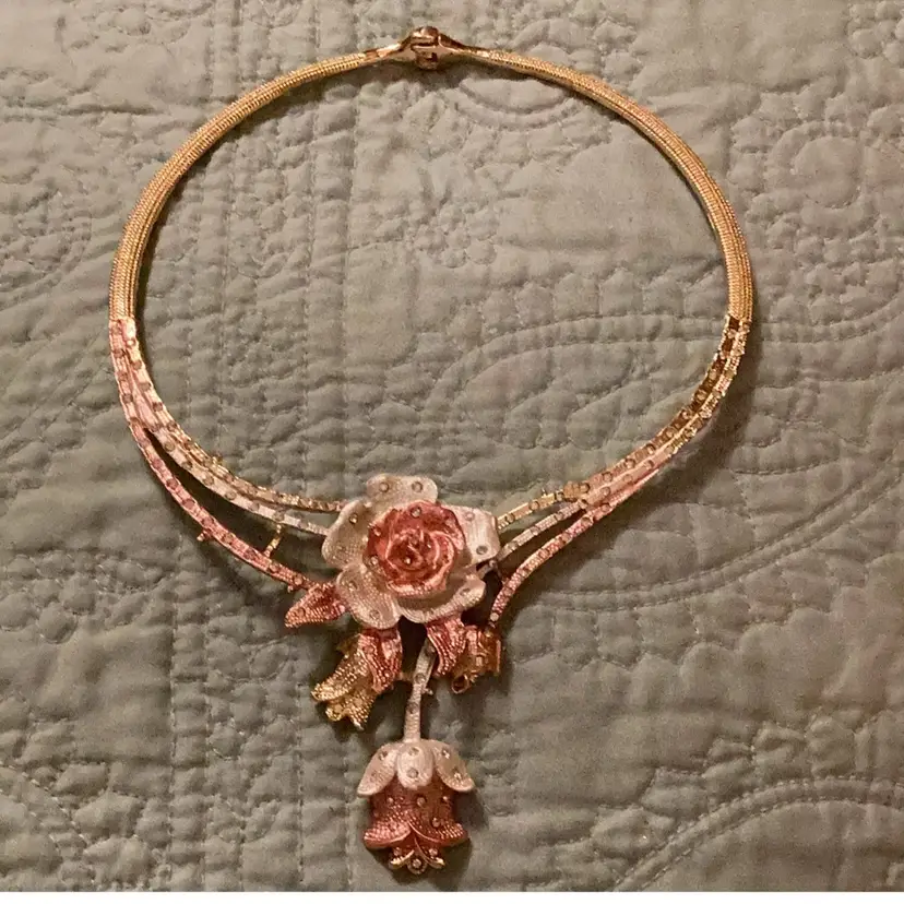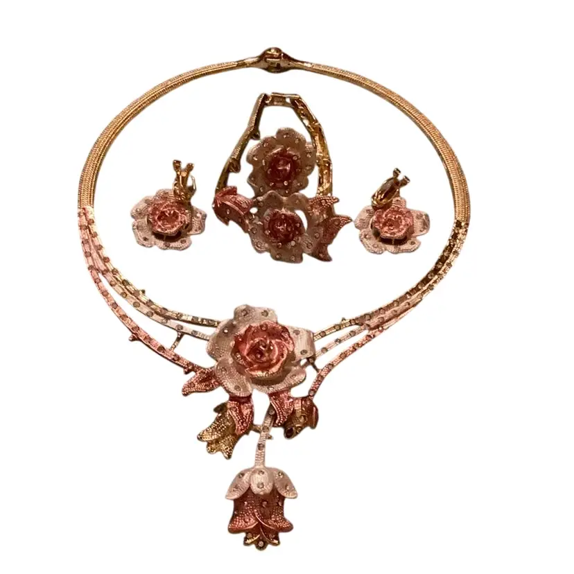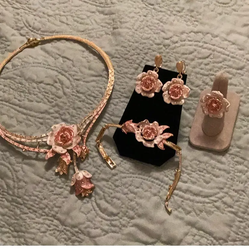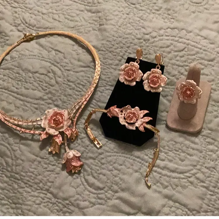 Go to set up for bracelet, earrings, ring and necklace beautiful pink and white rose colored flower no stones missing the ring is adjustable. The necklace opens up and fits like a choker, and the earrings are pierced all in a gold toned setting