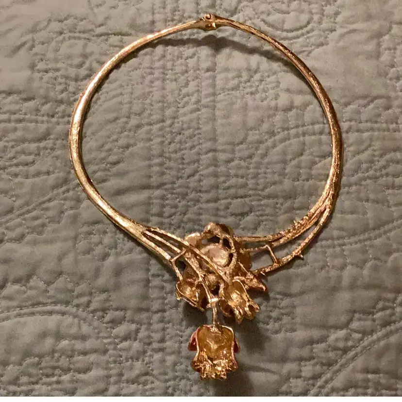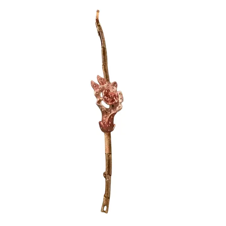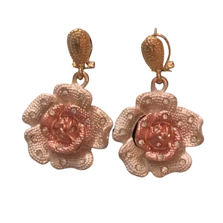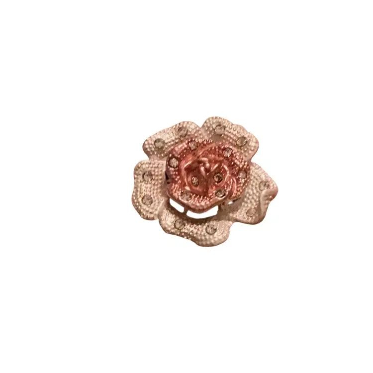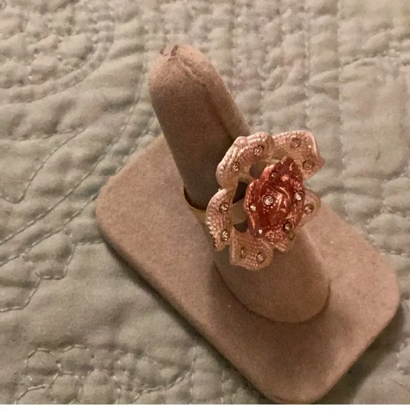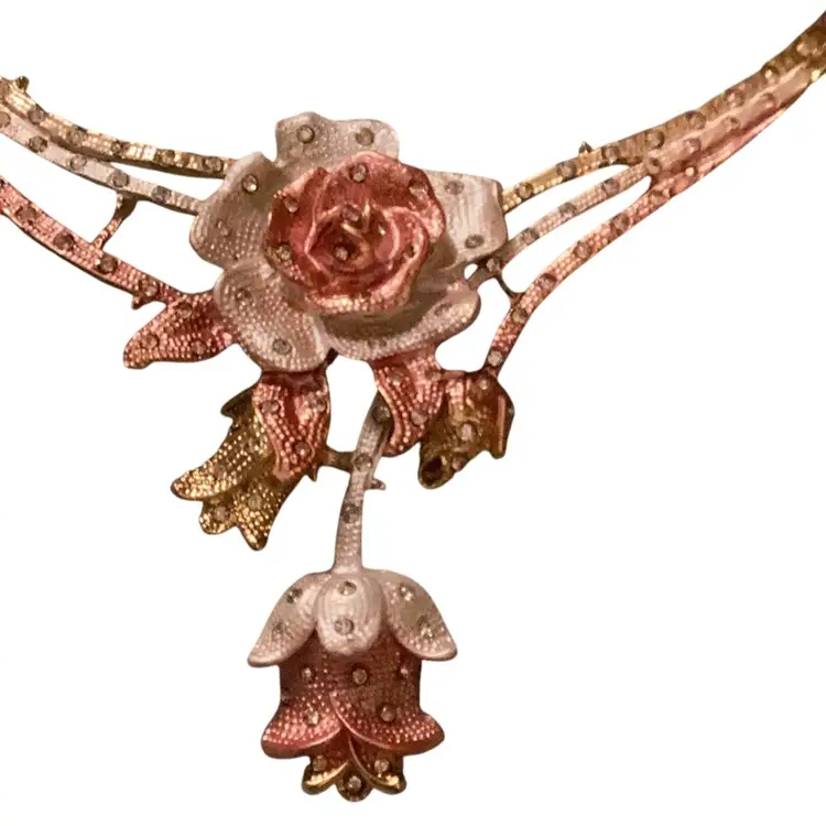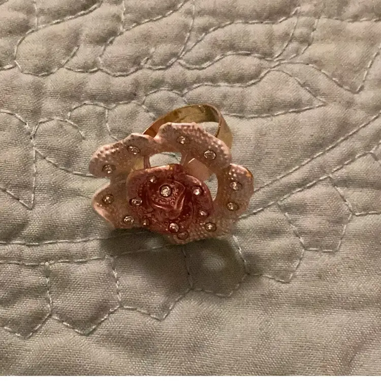Go to set up for bracelet, earrings, ring and necklace beautiful pink and white rose colored flower no stones missing the ring is adjustable. The necklace opens up and fits like a choker, and the earrings are pierced all in a gold toned setting