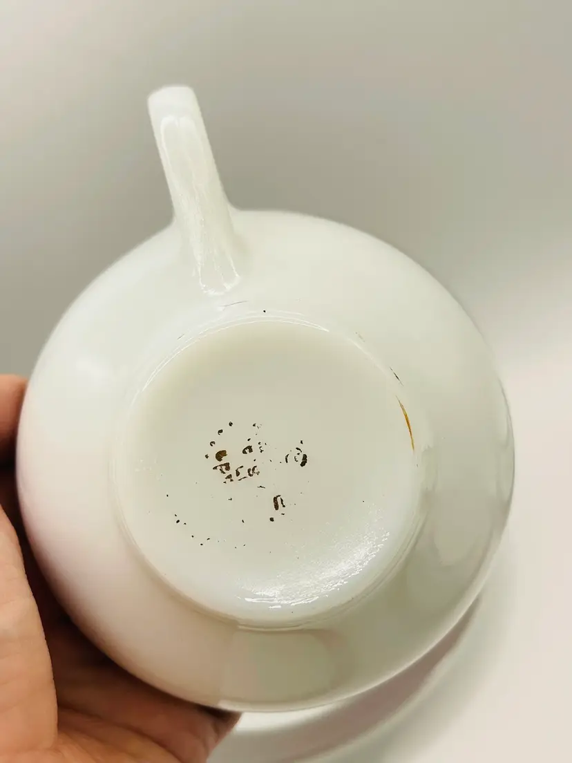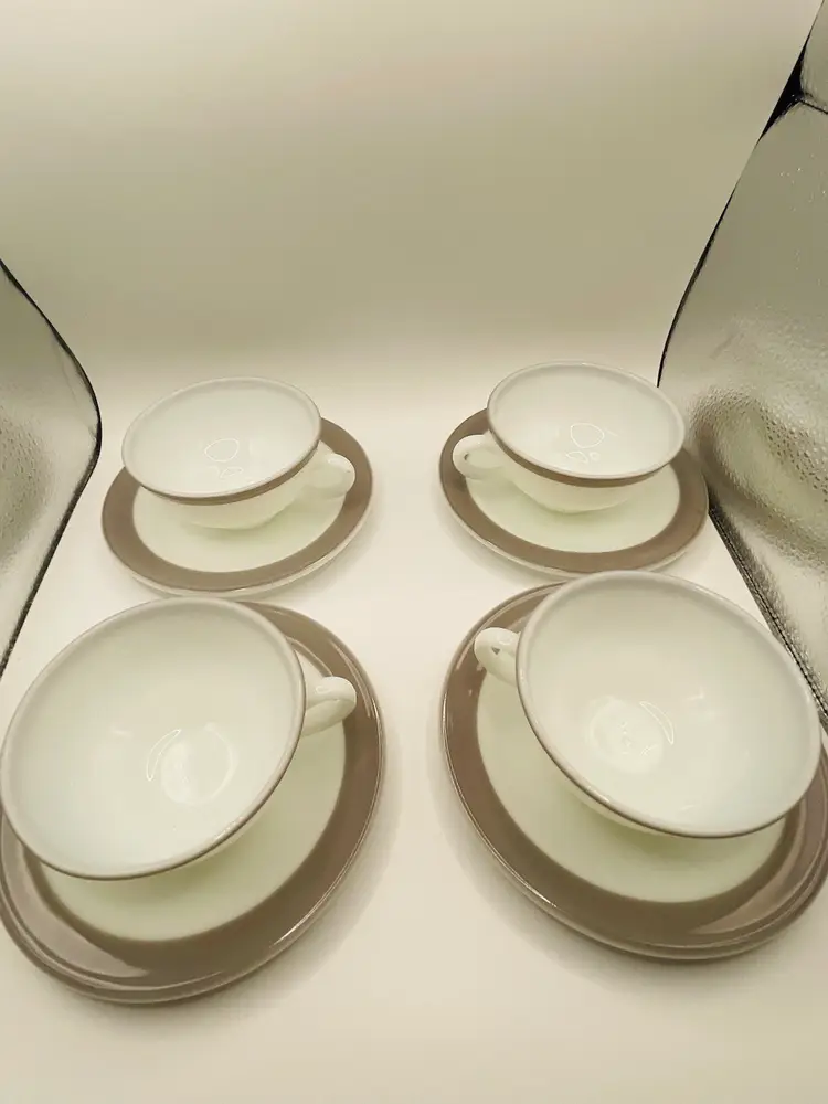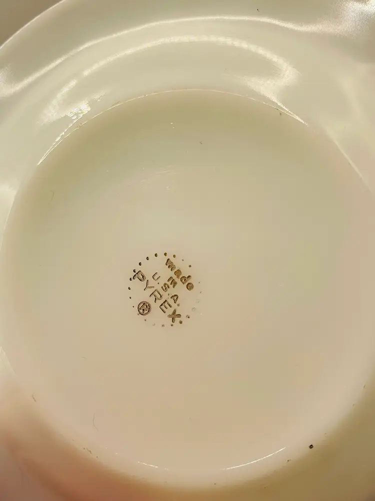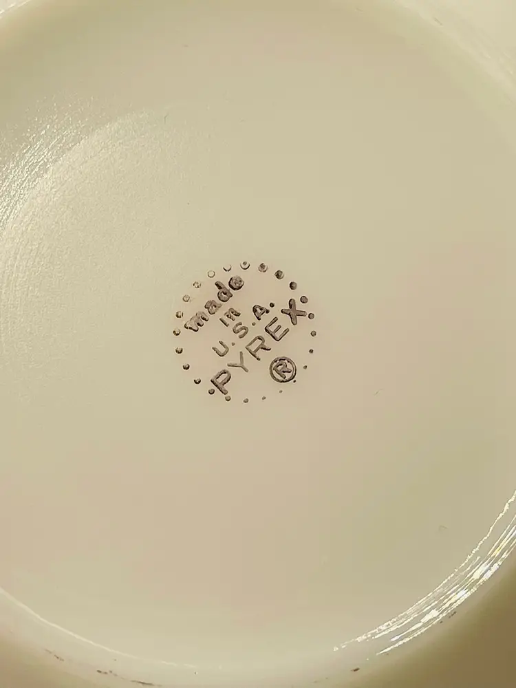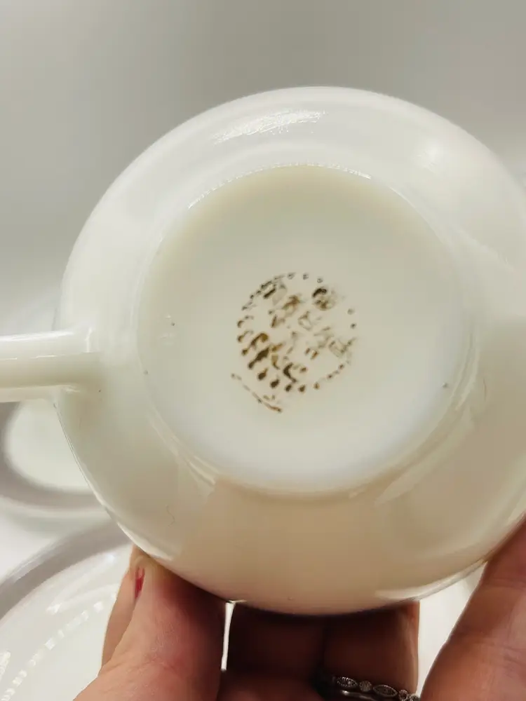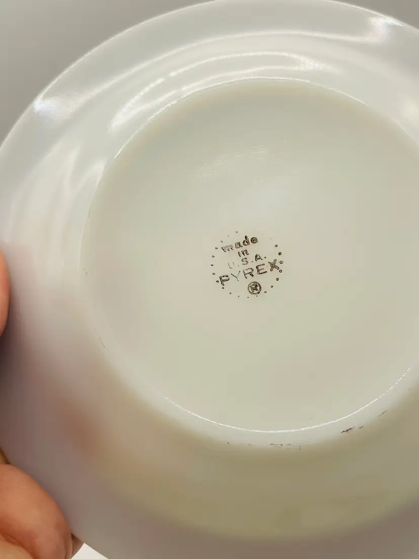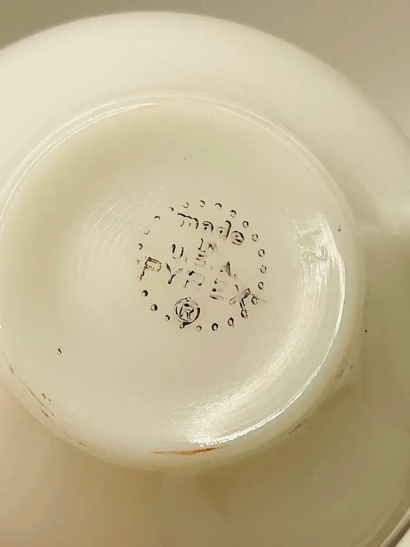 All four cups and saucers are stampedPyrex Made in the USA on the bottom with varying degrees of wear. There is minimal, if any wear to the gray coloring.