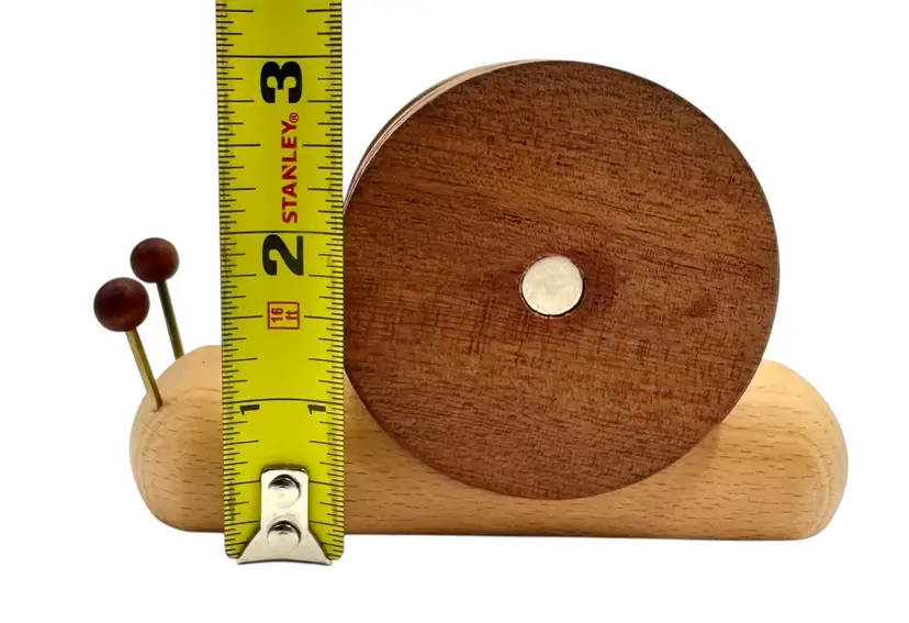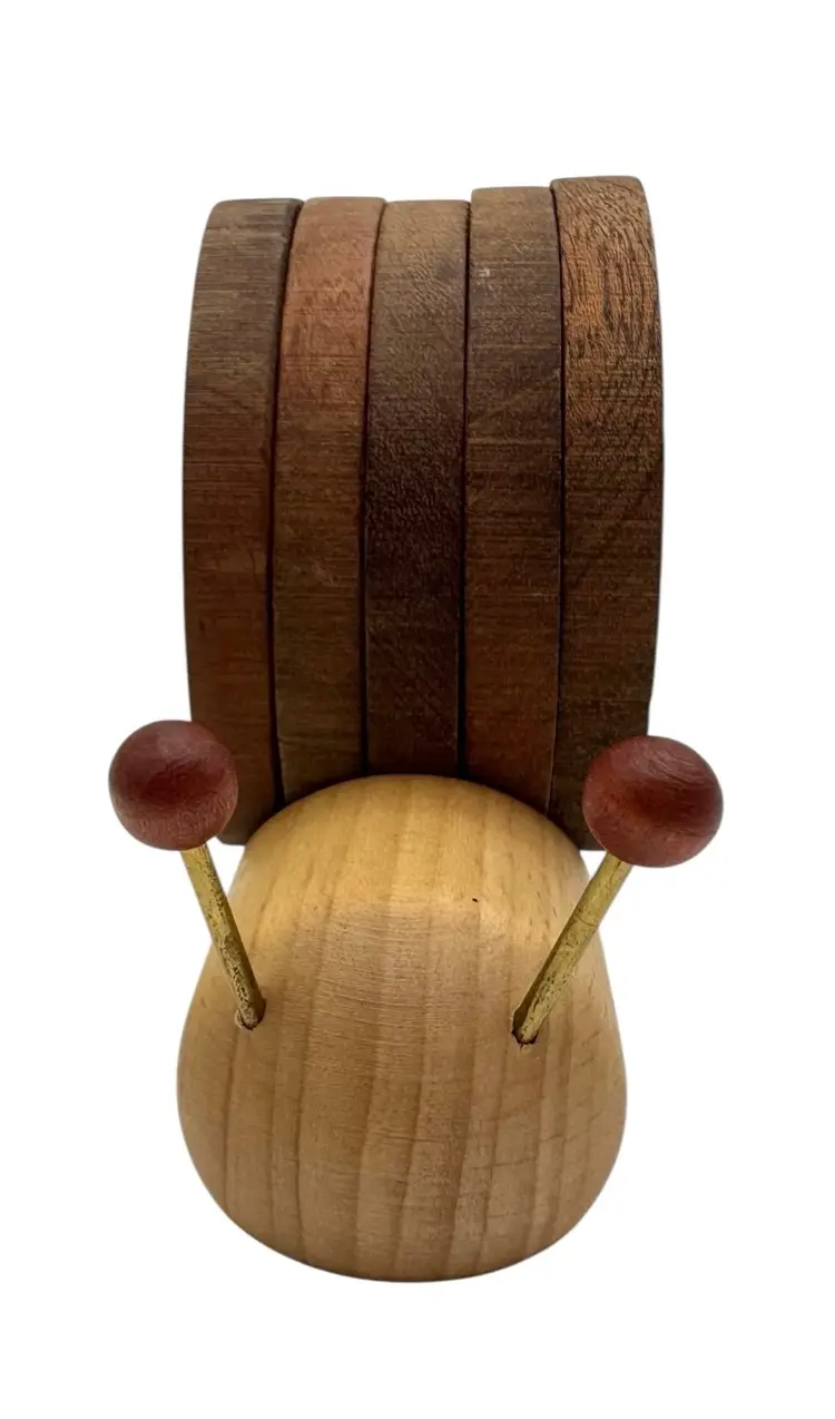 Four coasters with magnets embedded into the bottoms; they stick to a wood and metal snail.