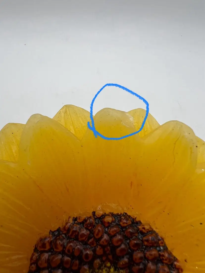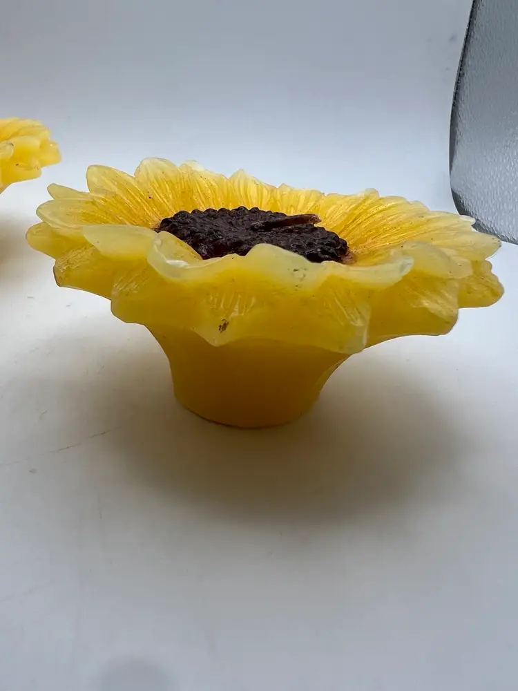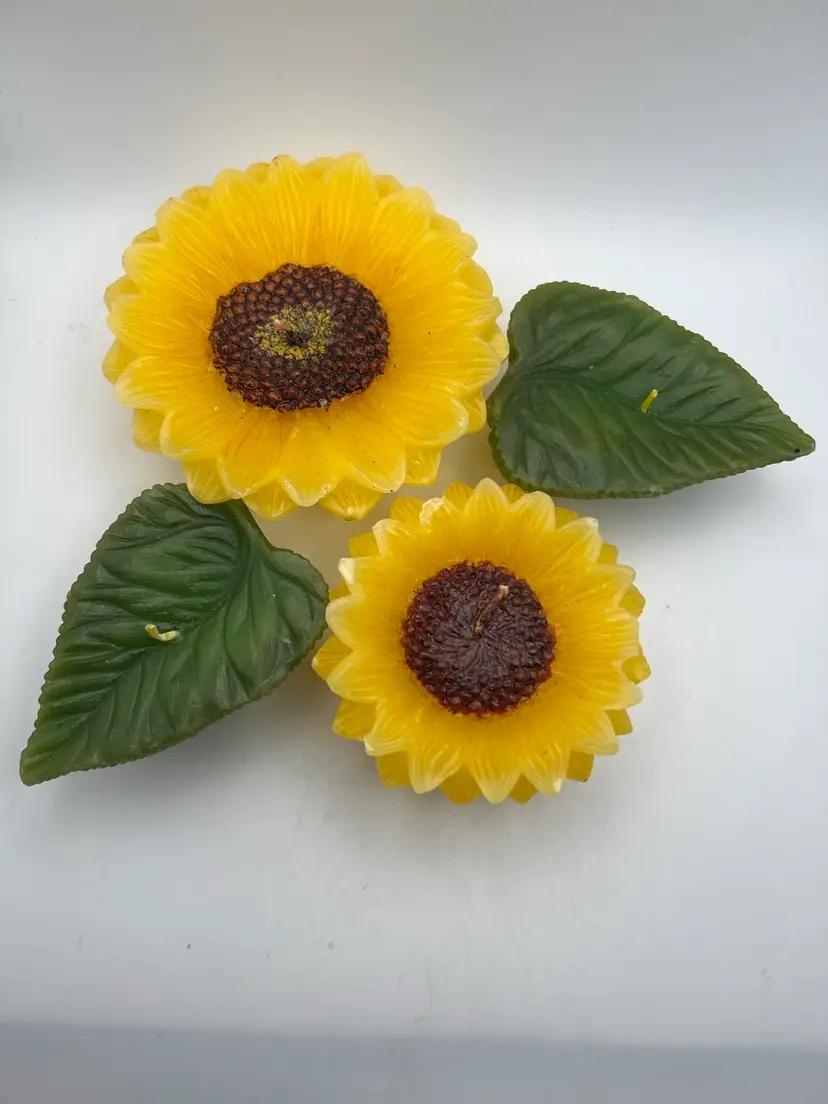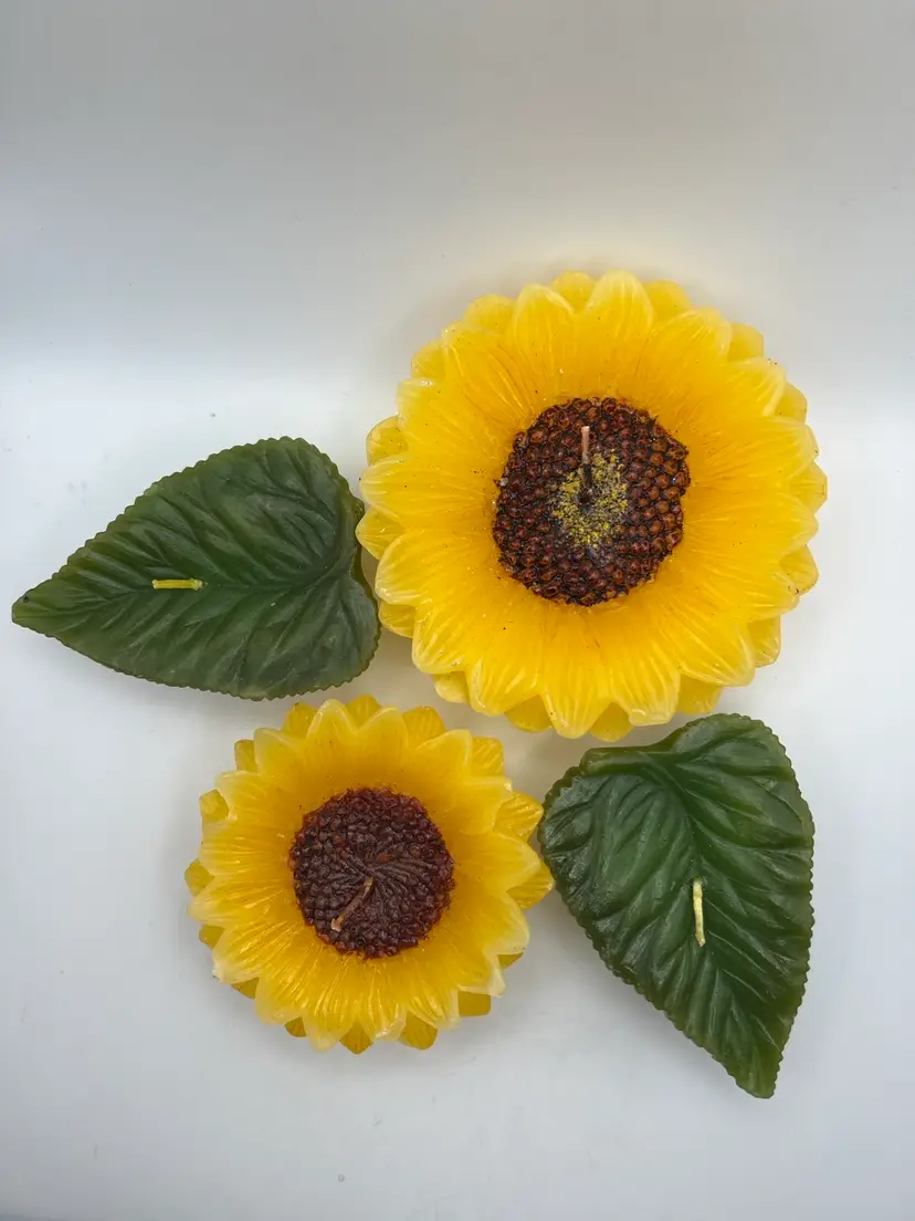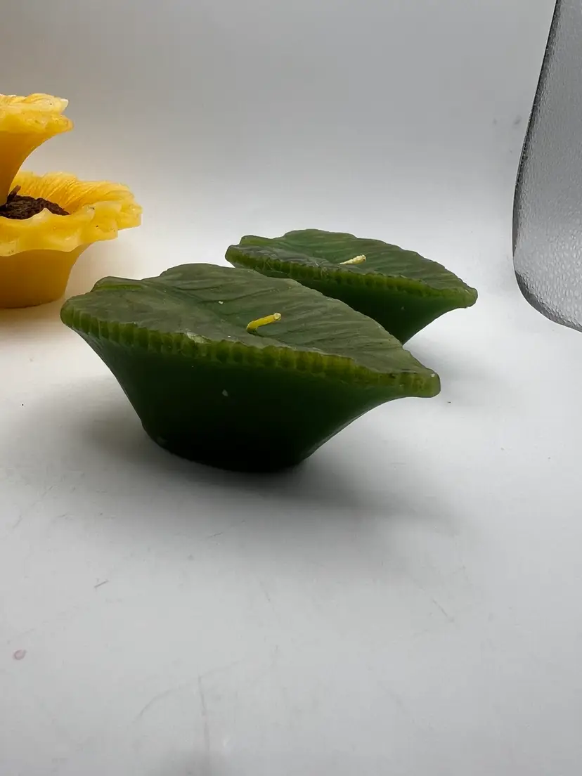 The flowers are 4β& 3β diameter and the leaves are 3.5β from stem to tip. They are all 1.5β tall. The large candle has one petal that has flattened on the tip (see photo) the small flower has about 3 petals that the tips have gotten white (see photo). You really have to look for these defects.! The leaves are in good shape ! If you have any questions , please message me Thank you GIFT WITH PURCHASE!π