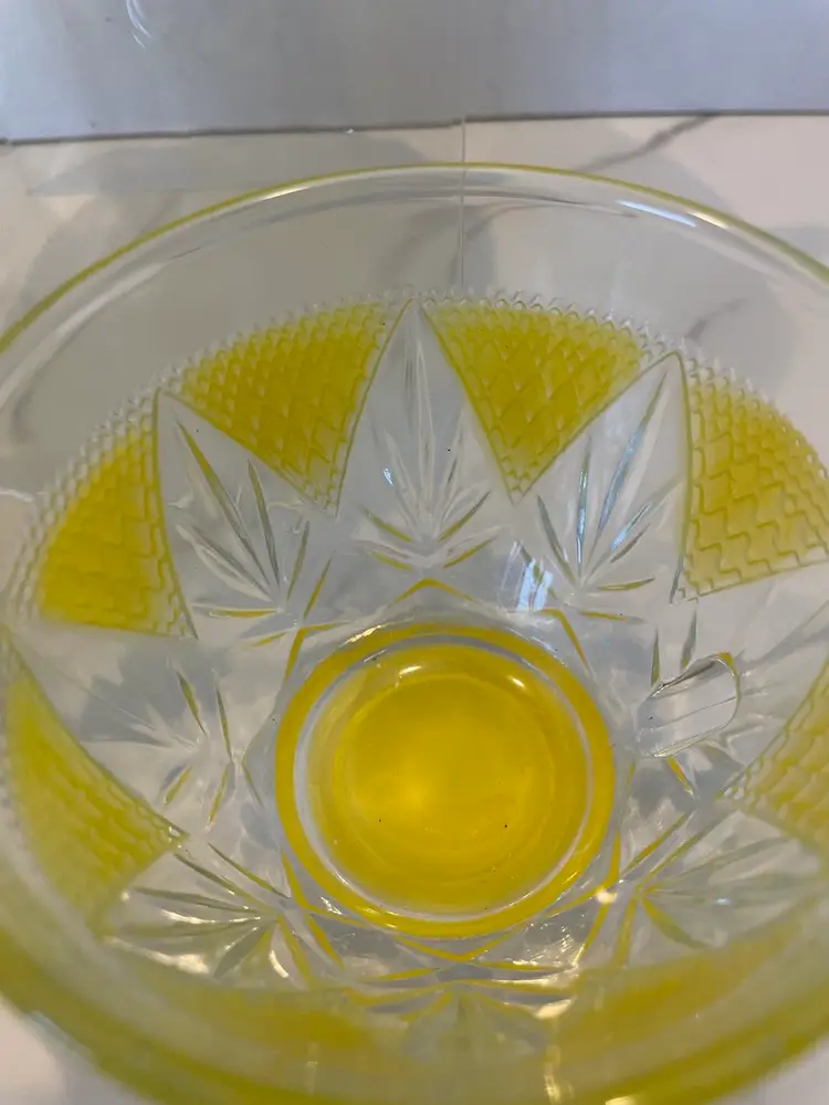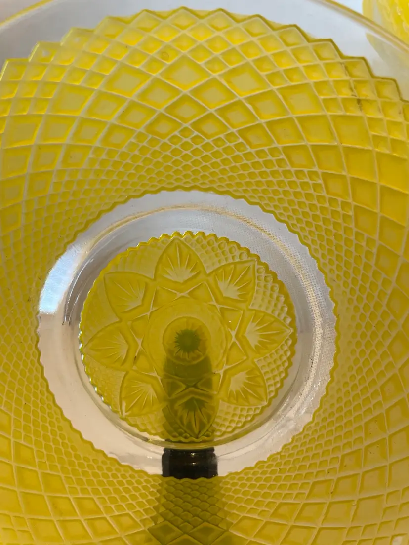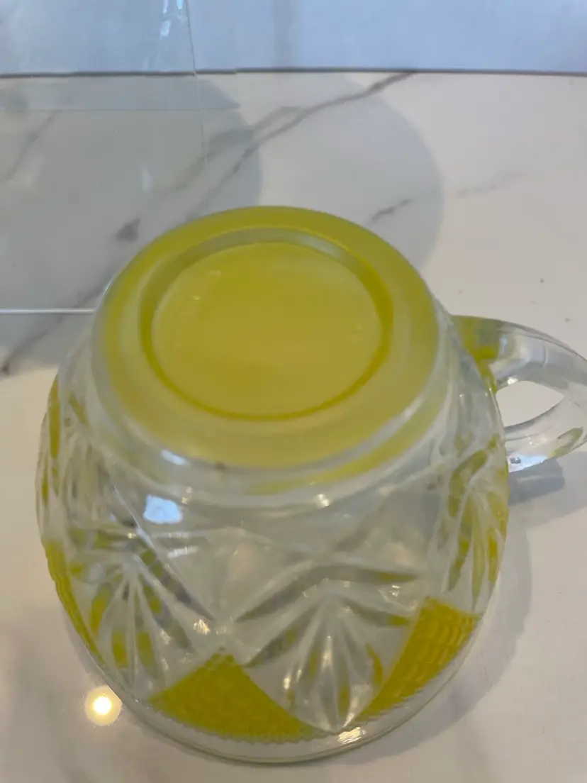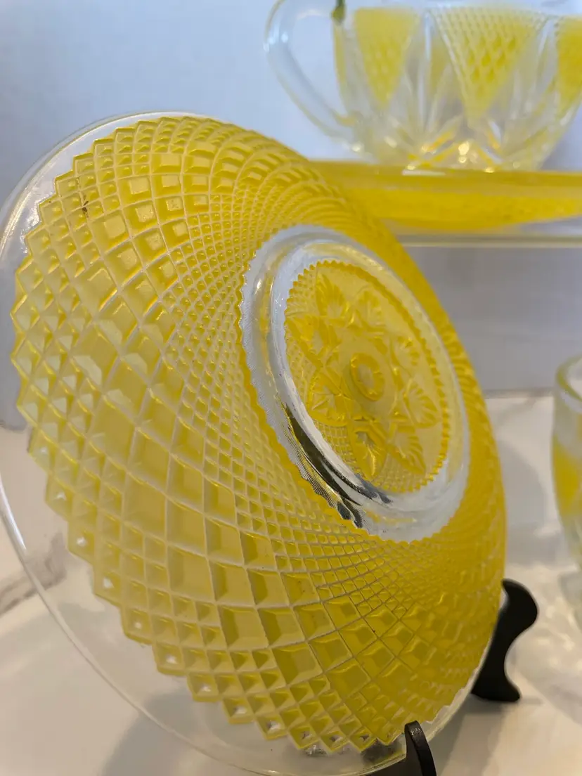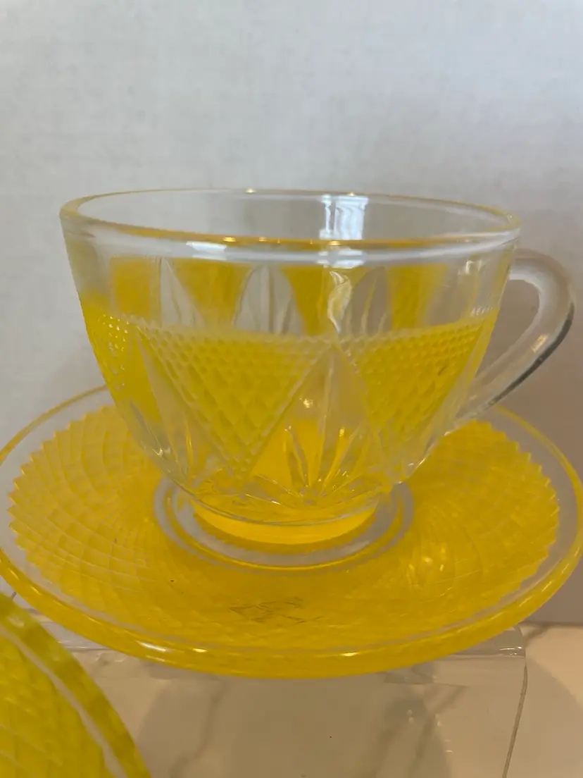 This is for a set of 4. 2 cups, 2 saucers, yellow and clear glass no chips or cracks made in Indonesia vintage 1960s Fun and bright.