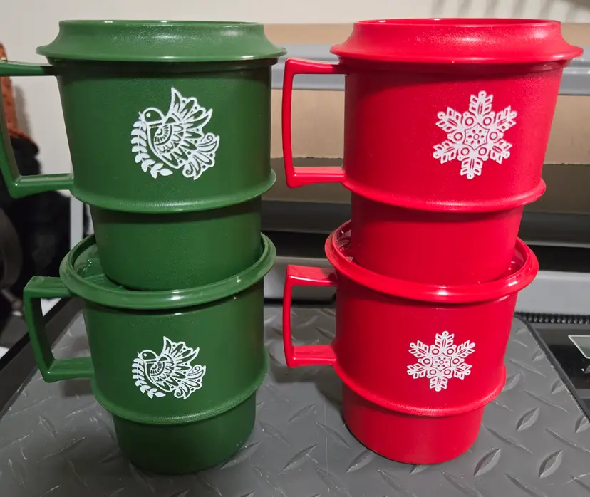 Set of 4 Tupperware Holiday mugs with lids/coasters.