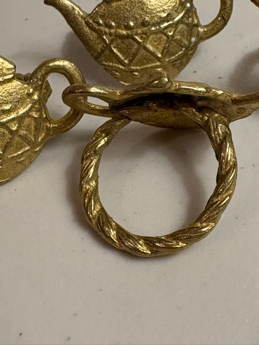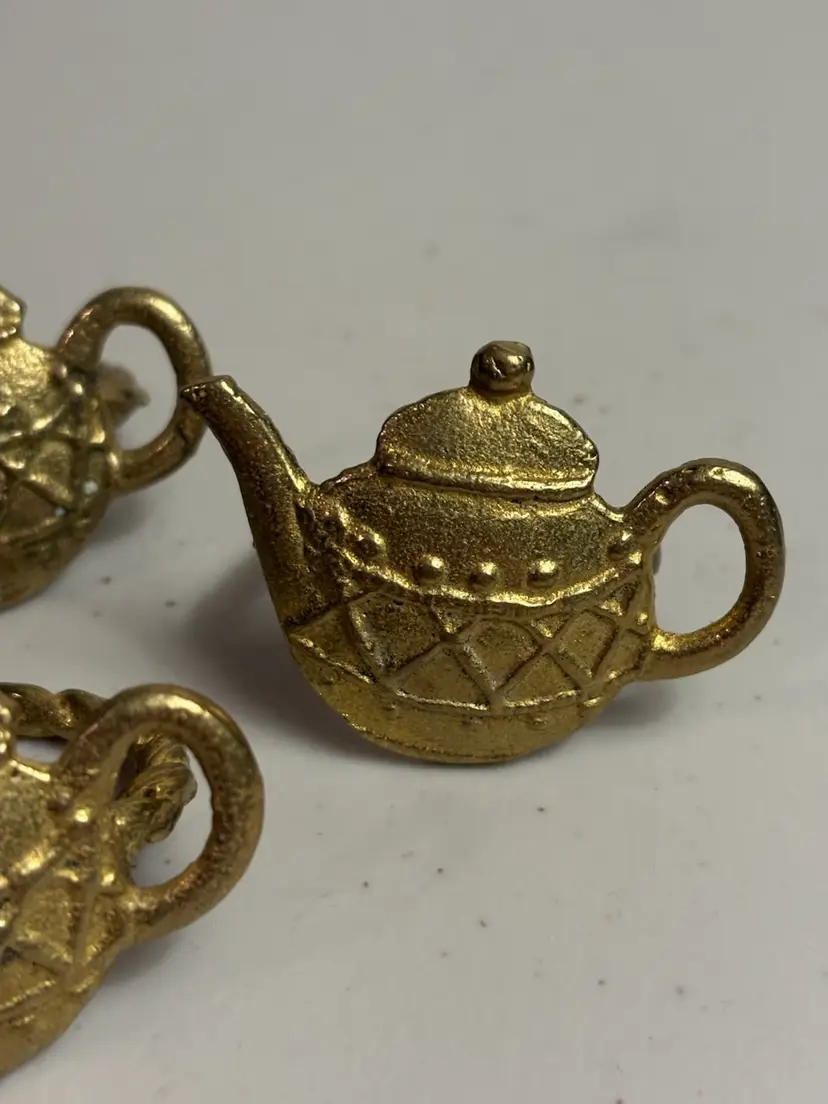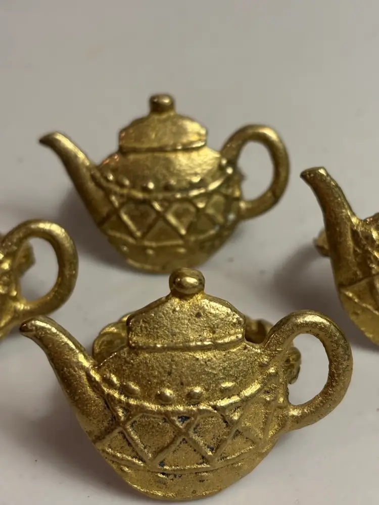 Perfect for an afternoon tea. This set of 4 vintage brass teapot napkin rings adds a touch of English cottage charm to any table setting. With a round shape and a diameter of 1.5 inches, these gold-colored rings feature a teapot pattern that is perfect for all occasions. Made in India in the 1970s, these decorative napkin rings are a matching set that brings a bit of art, period style, and a touch of food and drink flair to your dining experience. Remember to hand wash only to preserve their original beauty.