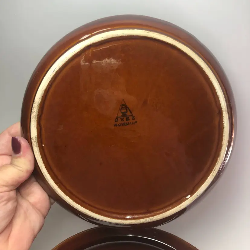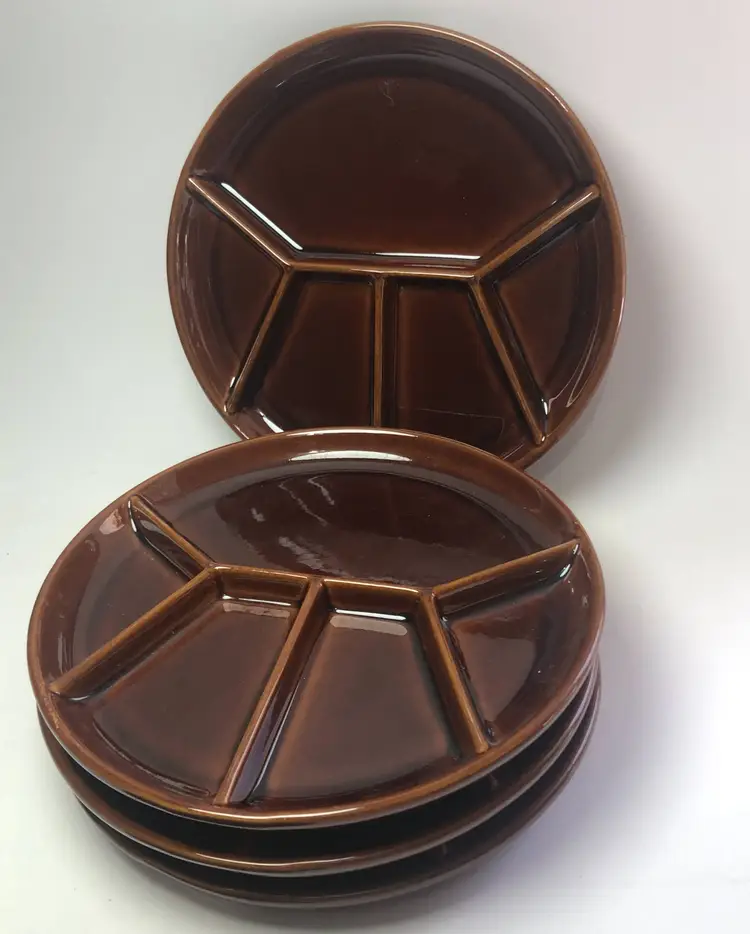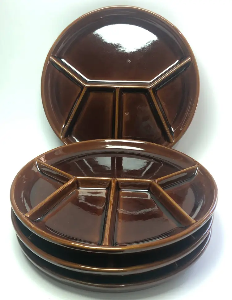 Set of 4 Vintage Dark Brown Fondue Picnic Divided Pottery Plates Gerz made in W Germany. 8.5" diameter. Great condition. No chips, no cracks. These do have crazing. MCM Mid Century Modern.