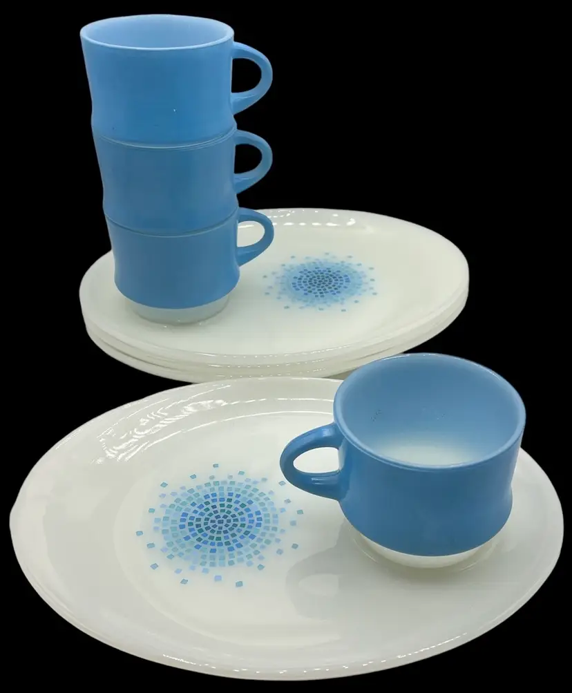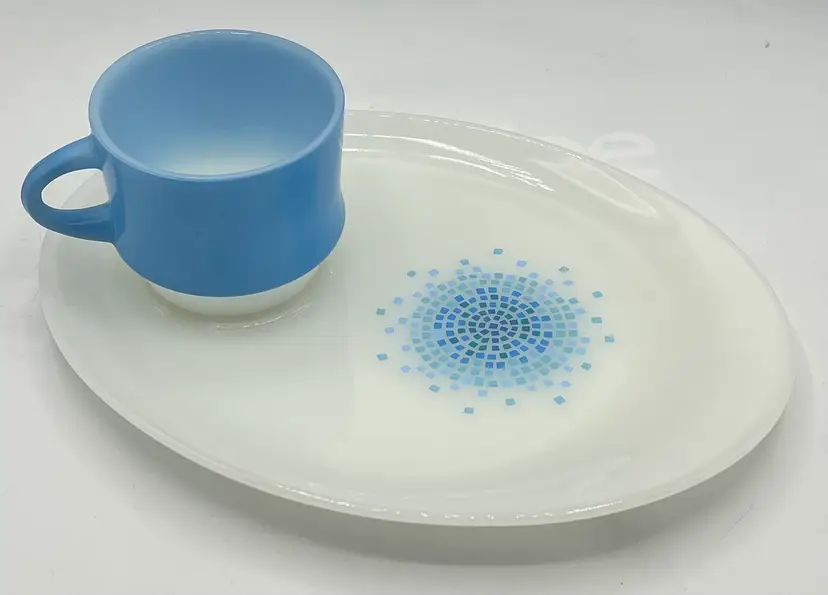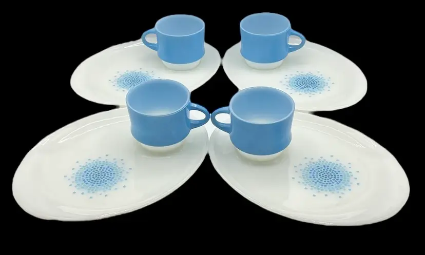 This snack plate and cup set are an estate barn find. They were new in the box with original with the original packaging paper. The box and paper was destroyed due to being in a barn for many years. It did protect the dishes and kept them in excellent condition.